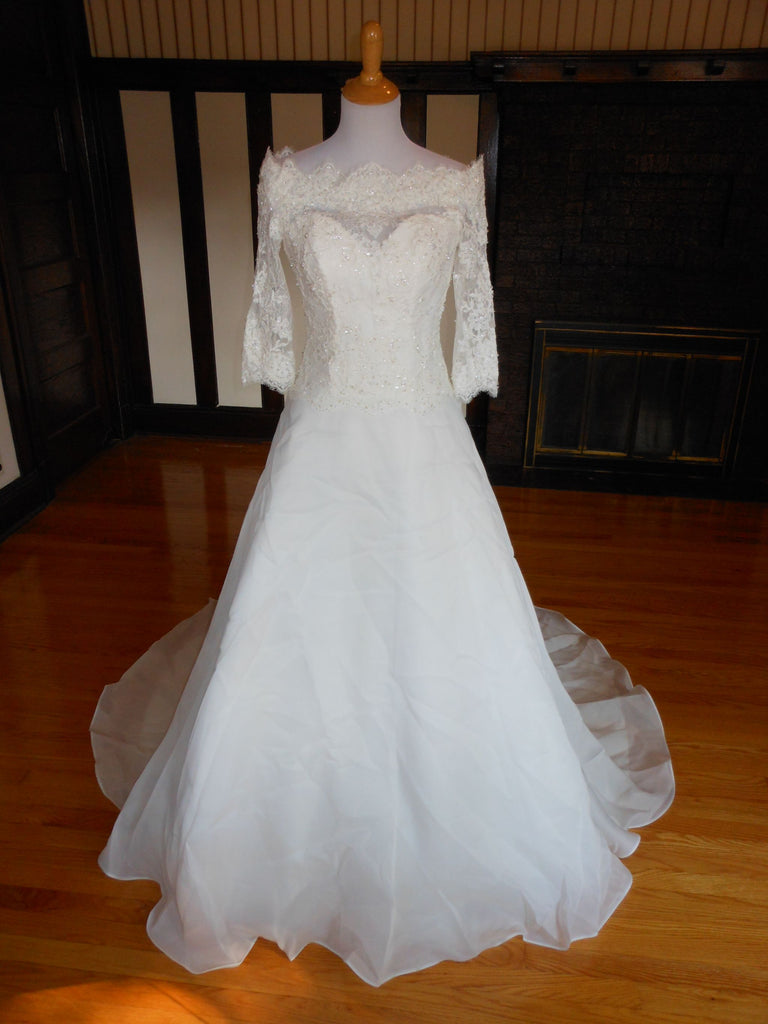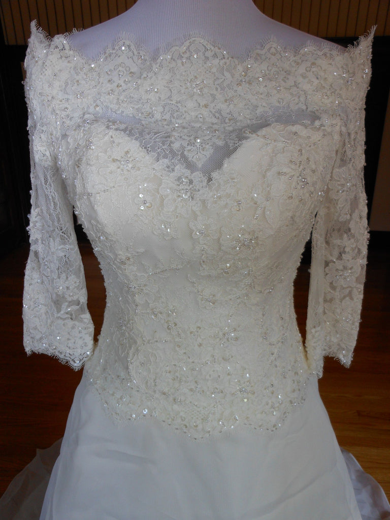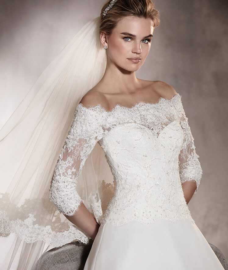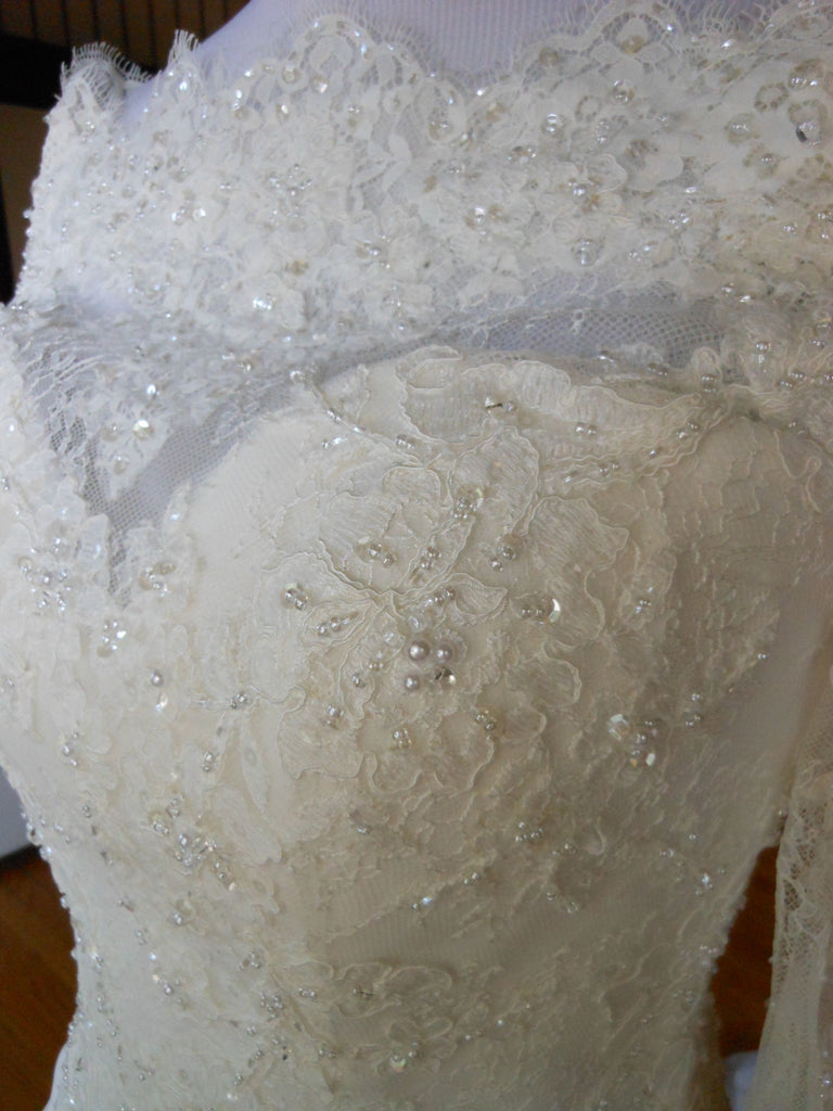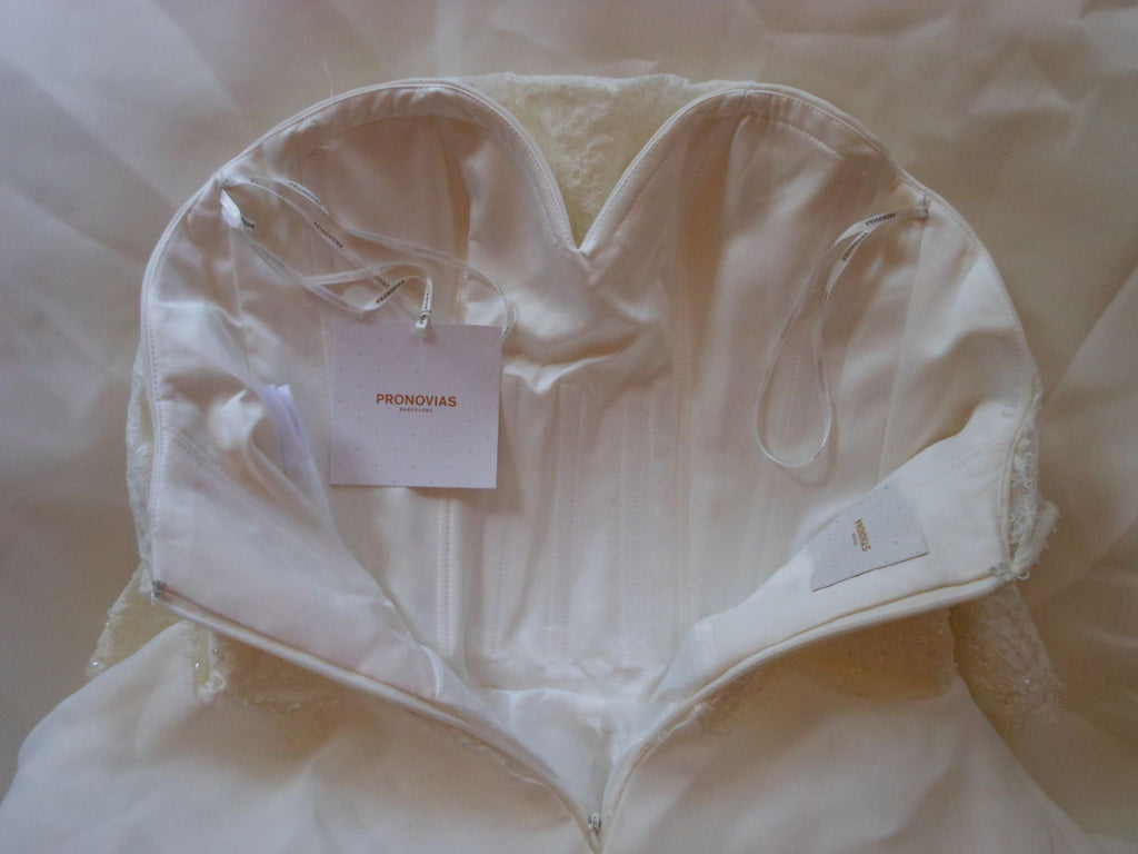This is an Authentic PRONOVIAS Bridal Wedding Dress Gown. The name of the dress is ALGECIRAS. It has a gorgeous A line style with a fabulous long train and elegant 3/4 sleeves. The gown is embellished with exquisite floral lace, and sparkling beads/sequences on top of the lace. The bodice also has boning to build a perfect shape. The skirt has netting petticoat inside to support a full shape. This dress is brand new in great condition with the original label and tags. It was never worn.