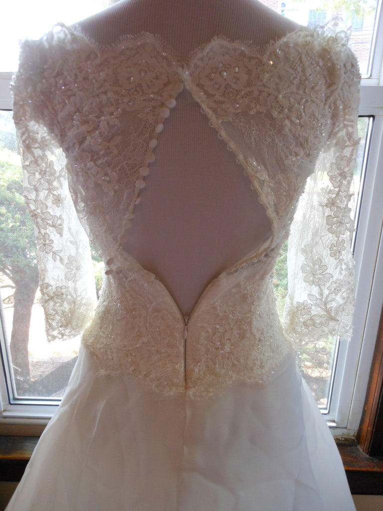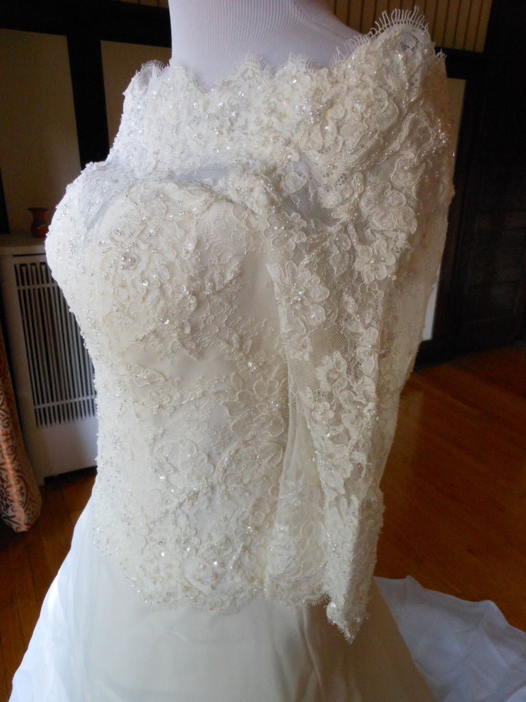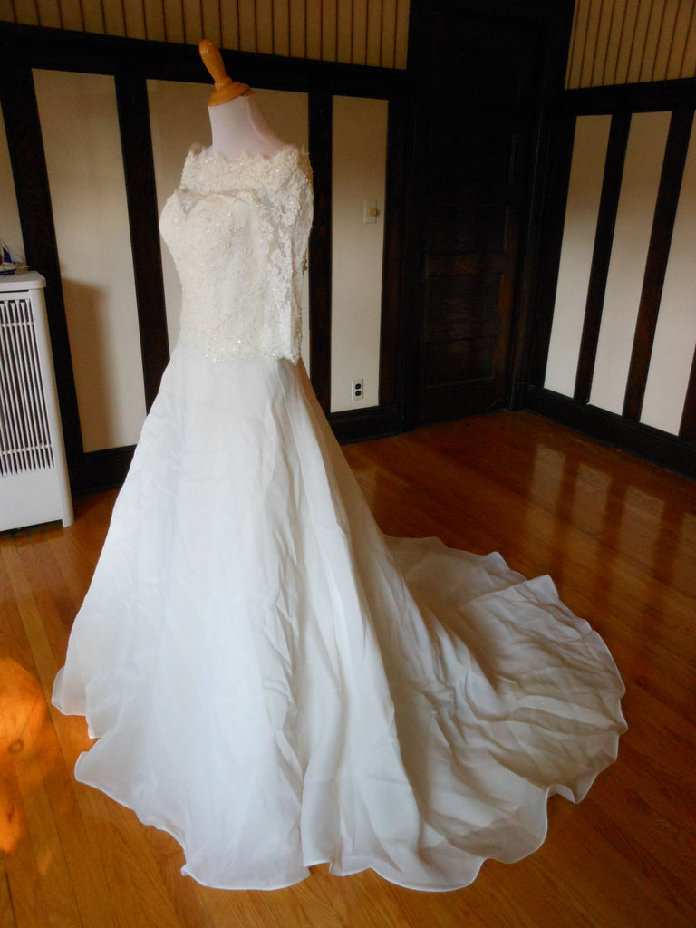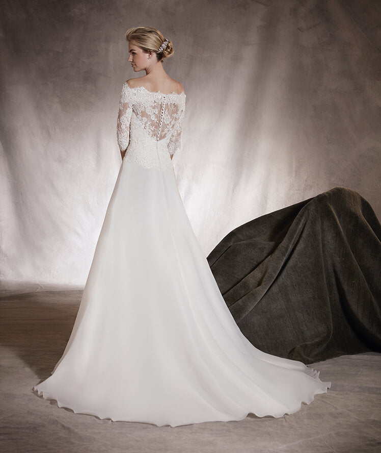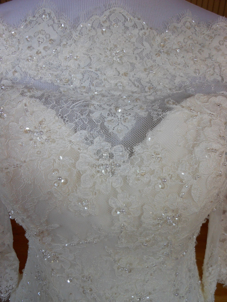 This is an Authentic PRONOVIAS Bridal Wedding Dress Gown. The name of the dress is ALGECIRAS. It has a gorgeous A line style with a fabulous long train and elegant 3/4 sleeves. The gown is embellished with exquisite floral lace, and sparkling beads/sequences on top of the lace. The bodice also has boning to build a perfect shape. The skirt has netting petticoat inside to support a full shape. This dress is brand new in great condition with the original label and tags. It was never worn.