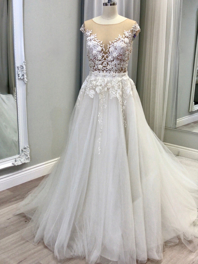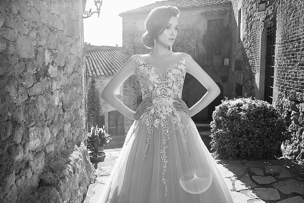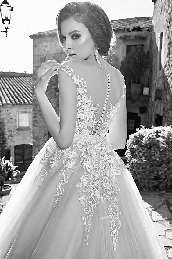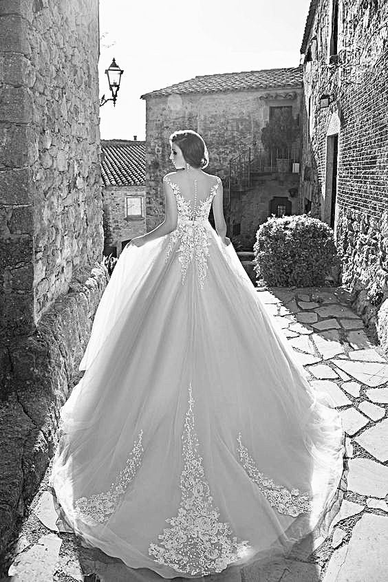 - Ballgown silhouette in fine tulle with intricate lace accents
