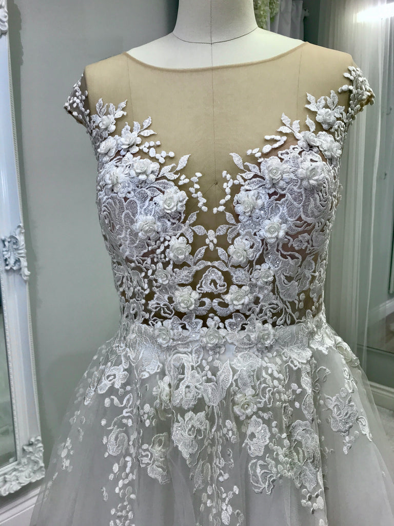 This is a new sample gown in impeccable condition. It has only been gently tried on in our boutique with great care. Protective measures, including body slips and nylon socks, are used during fittings to preserve the gown's flawless state.