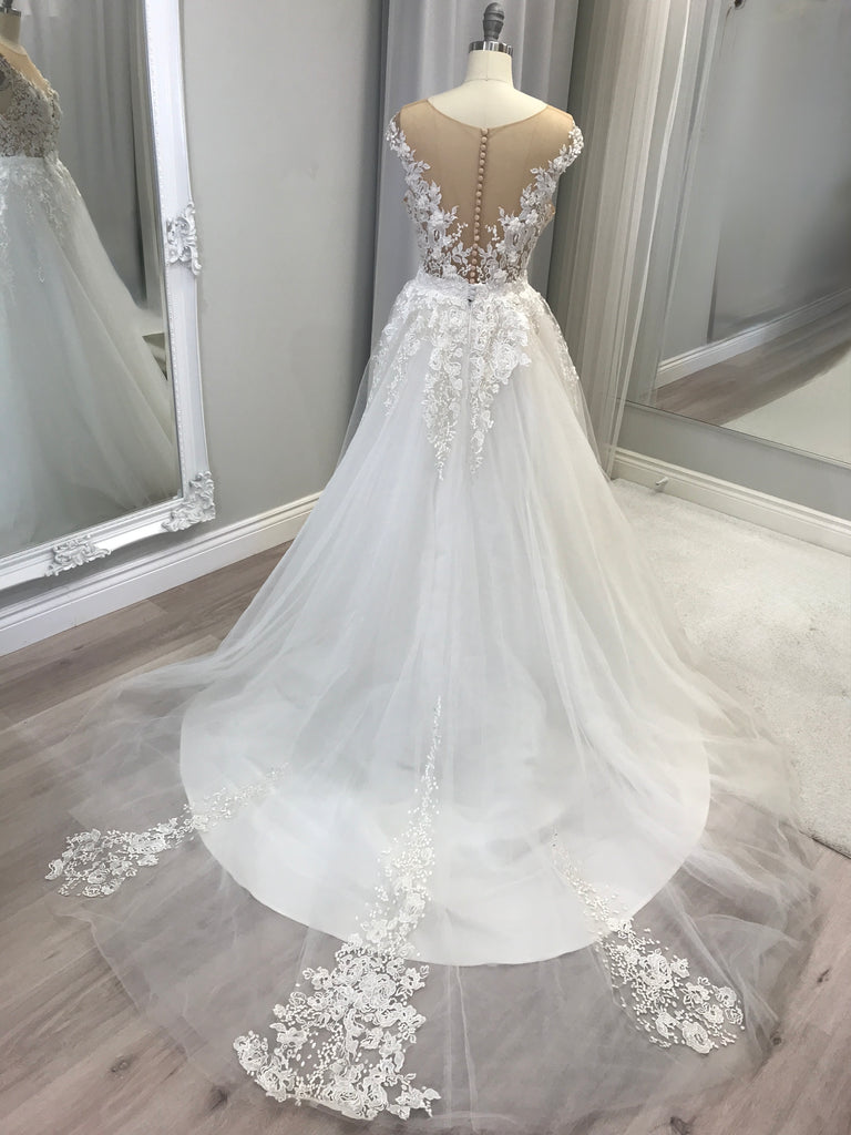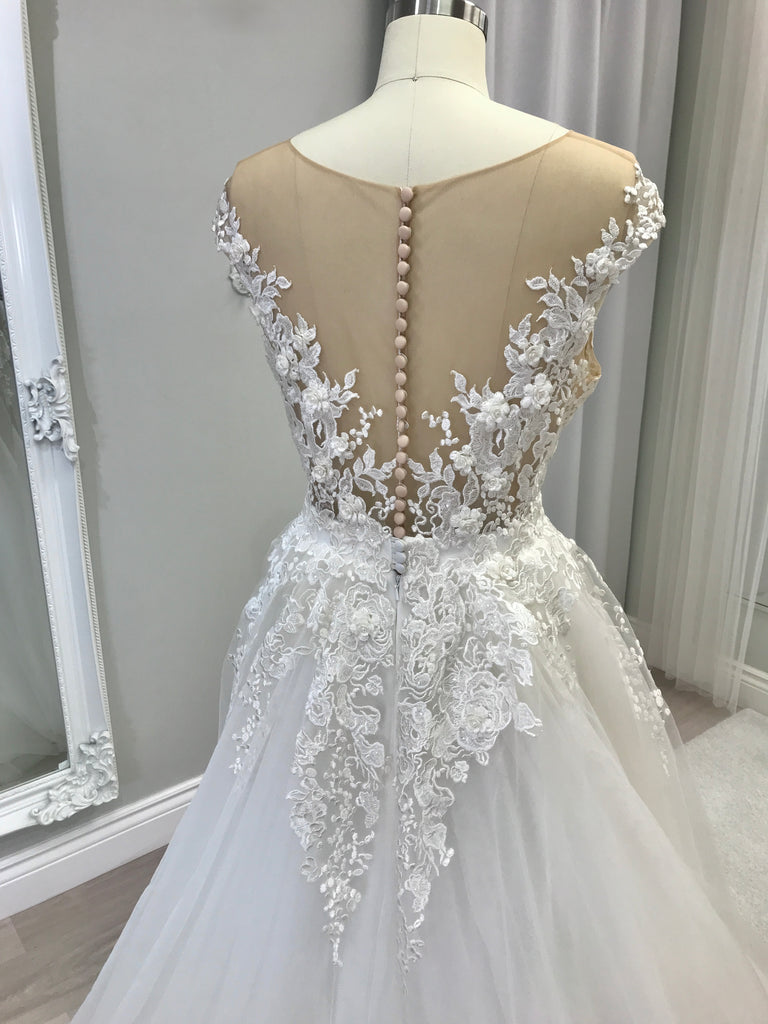 The back of the bodice mirrors the illusion design, creating a romantic, barely-there appearance that still provides structure and shape. A voluminous skirt flows effortlessly into an exquisitely long train, making a lasting impression from every angle.