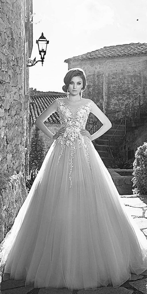 Romantic Tulle & Lace Ballgown with Illusion Plunging Neckline and Dramatic Train