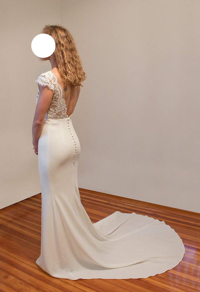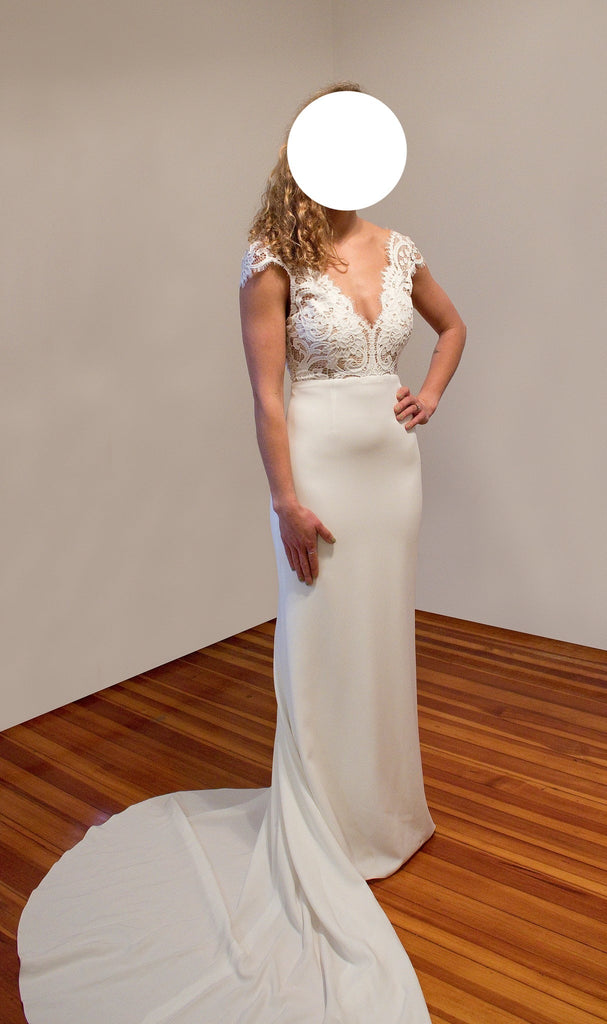 I absolutely loved this dress, it is form-fitting and super comfy to move and dance in! I purchased this dress from another bride (who had only worn it for a pandemic wedding with minimal dancing). It wasn’t the right fit for me, but I think it would be perfect for someone who’s looking for a form-fitting, super comfy dress to have the best time in on your wedding day.