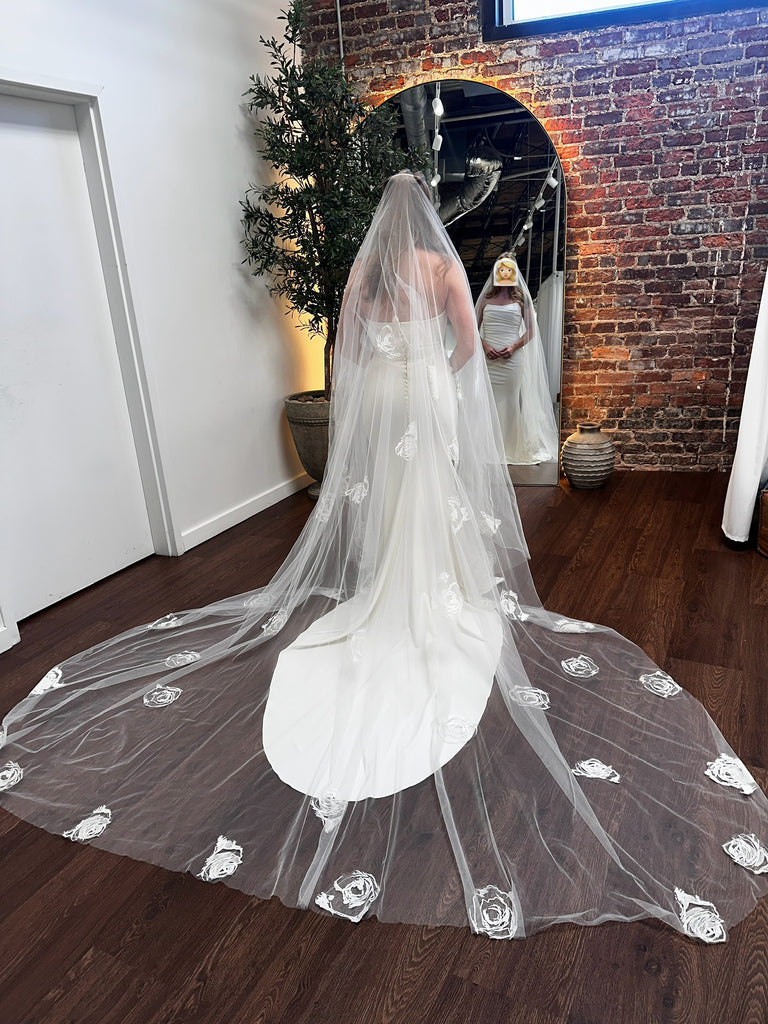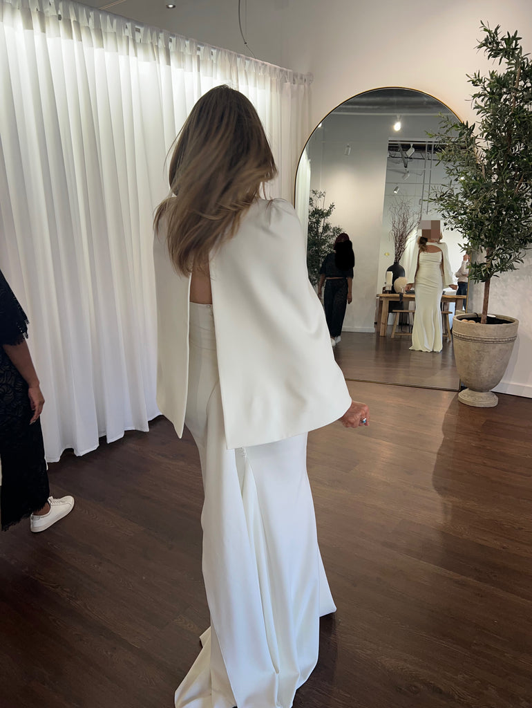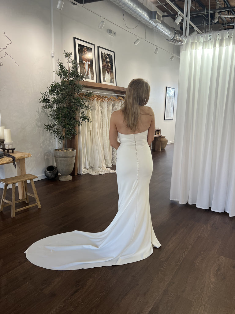 Phoebe is a simple, clean and elegant dress that is made from very luxurious ivory crepe. She is made with built-in shapewear (no need for uncomfortable spanx, YAY!), and boning that hugs your natural curves while allowing for grace down the aisle, and dropping it low on the dance floor. No need to pay for a gusset in alterations because she already comes with one! You can drape it over one of the buttons or loop it through your fingers to add magical movement and drama for photos or on the dance floor.