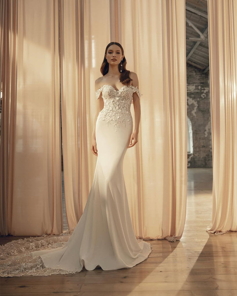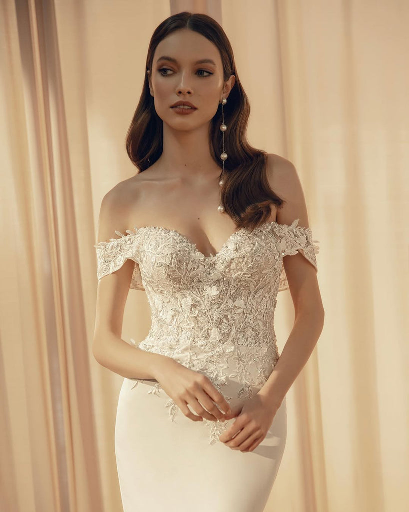 An off-the-shoulder corset bodice with a sweetheart neckline, offering a flattering, romantic silhouette.