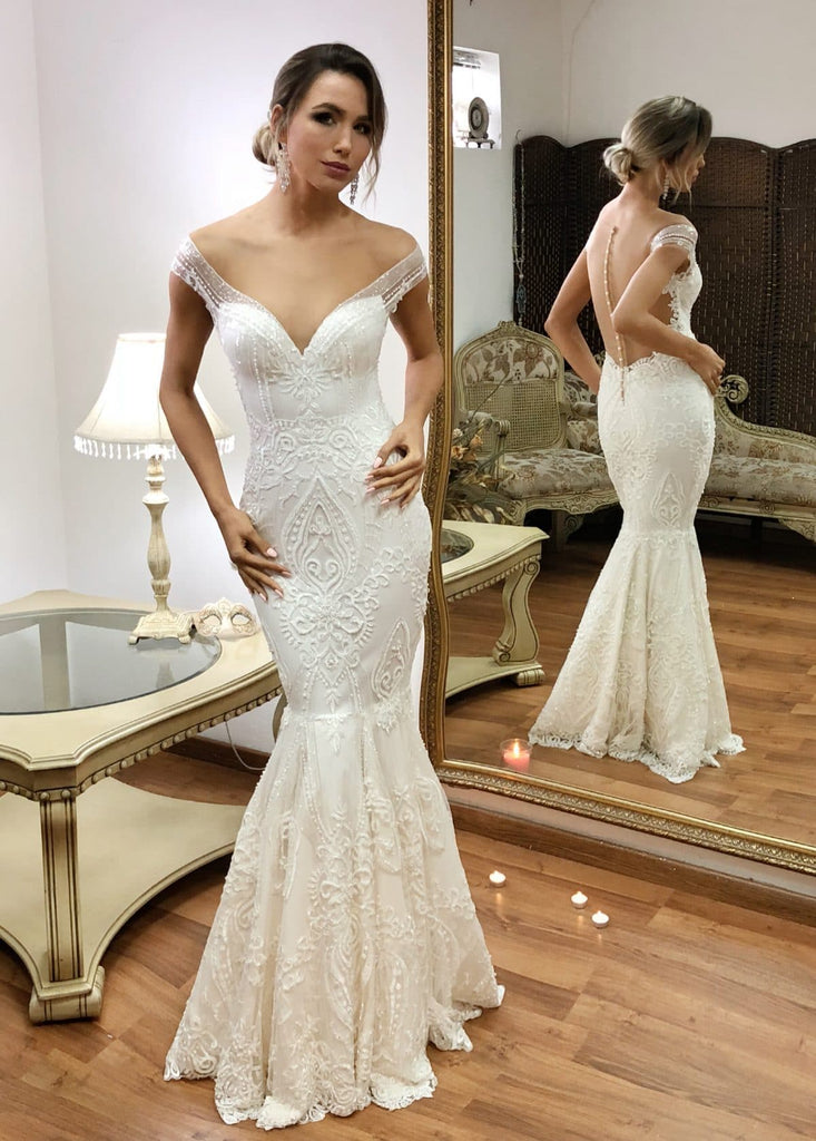 Sleek, romantic, and designed to flatter — this elegant fit-and-flare gown is adorned with delicate lace detailing and features a sculpting built-in bodysuit that smooths and shapes the silhouette to perfection.