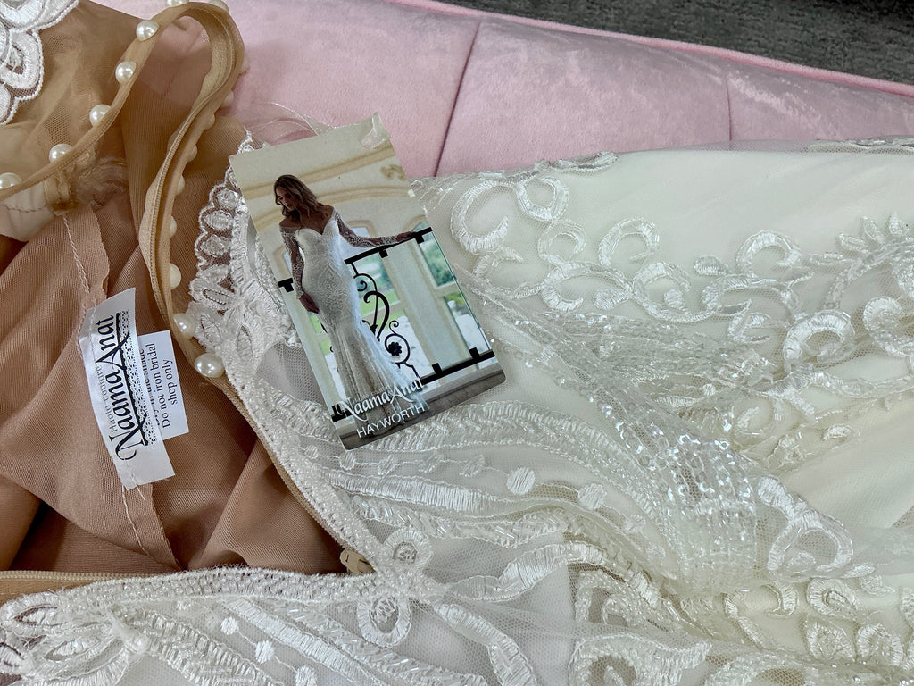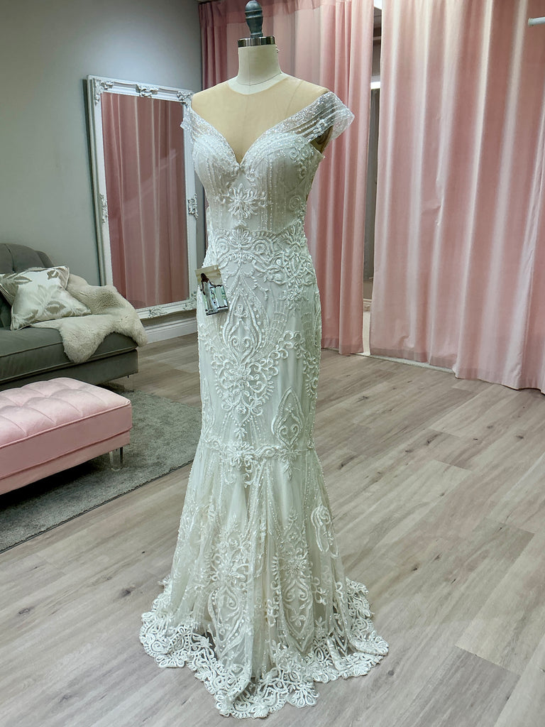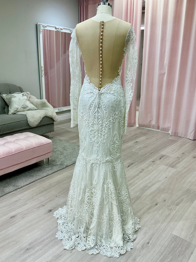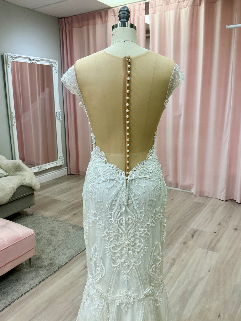 This is a new sample gown in impeccable condition, carefully tried on under strict guidelines to maintain its pristine quality.