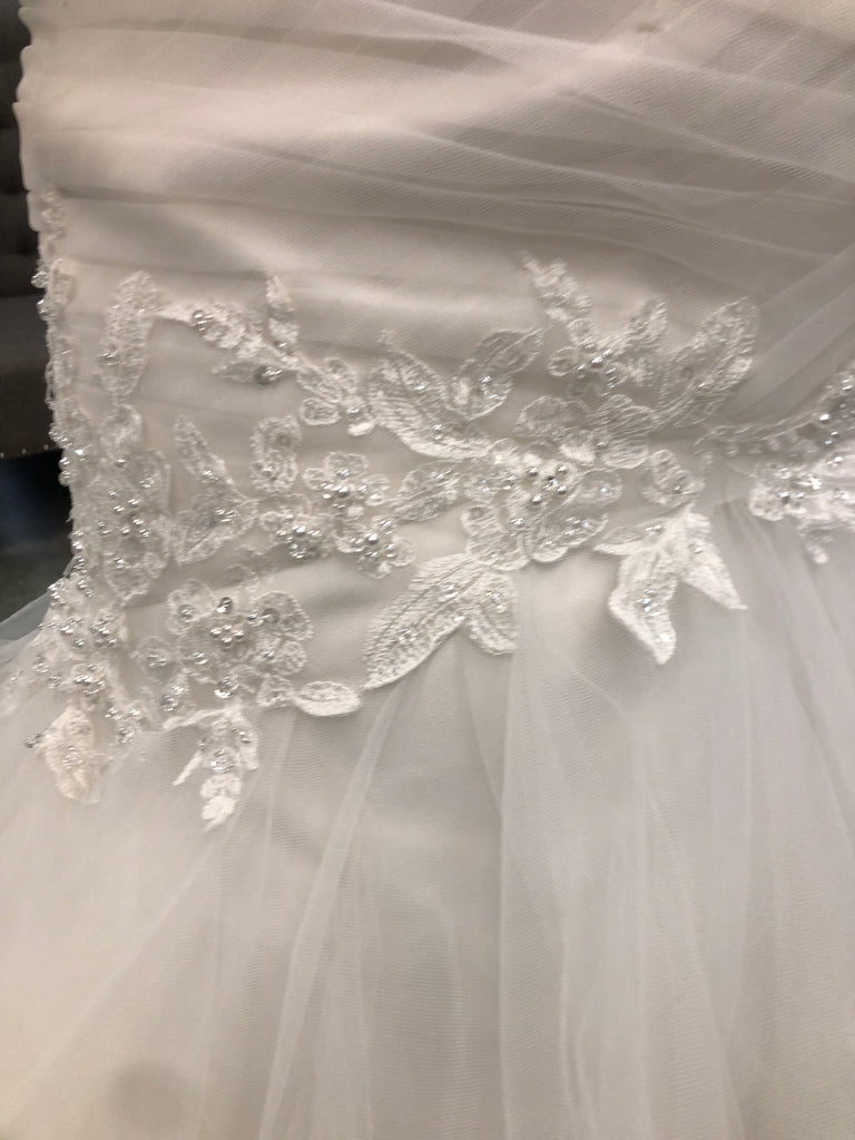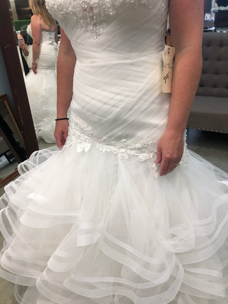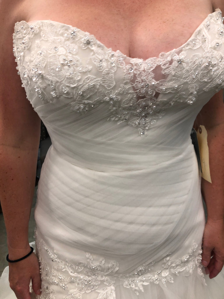This gown is a shop sample & has been tried on only twice! See pics, gown is in excellent shape, no marks or indications from trying.