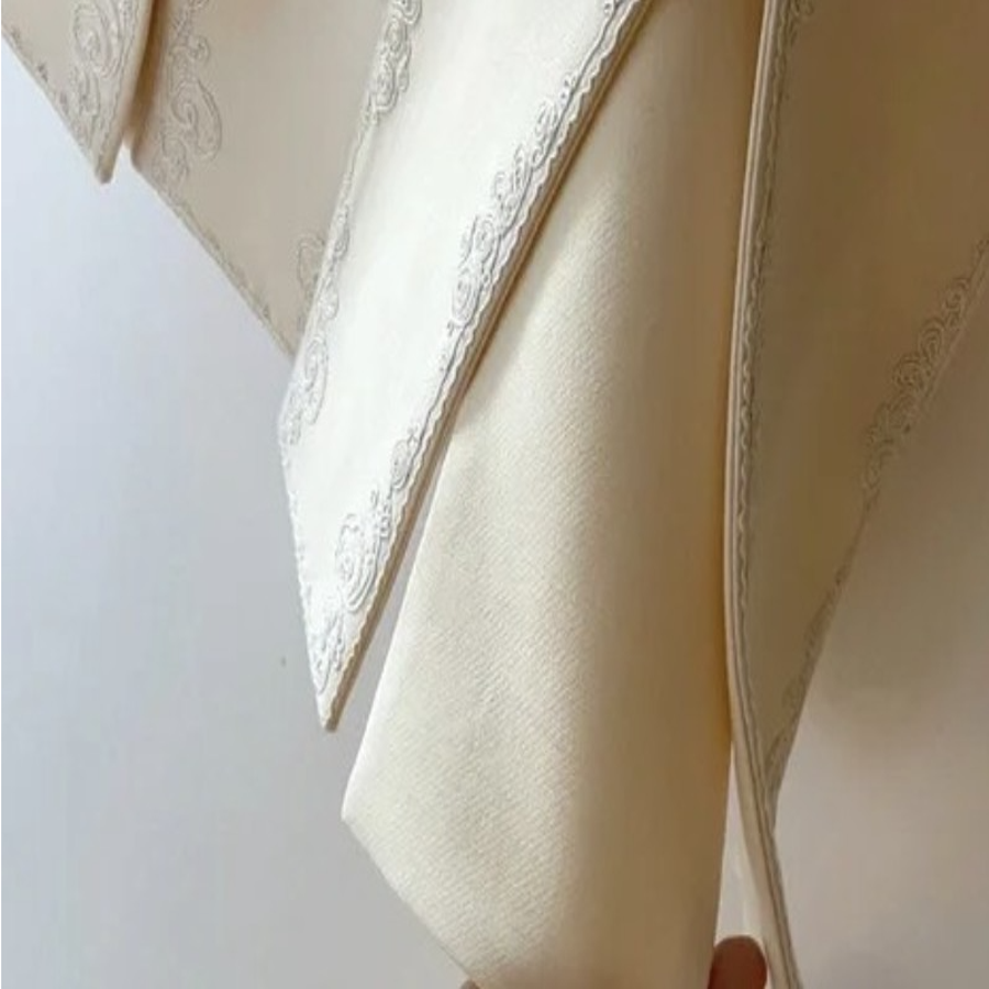 Made in France, the gown features two layers of delicately pleated wool and silk in a spartiate style, evoking the grace and strength of classical goddesses. The fabric — a luxurious blend of 77% wool and 23% silk — moves beautifully with the body and feels incredibly elevated yet light and breathable. One of the most special elements of this piece is its hand embroidery, sewn by artisans in Greece, which adds a layer of craftsmanship and historical homage to the design.