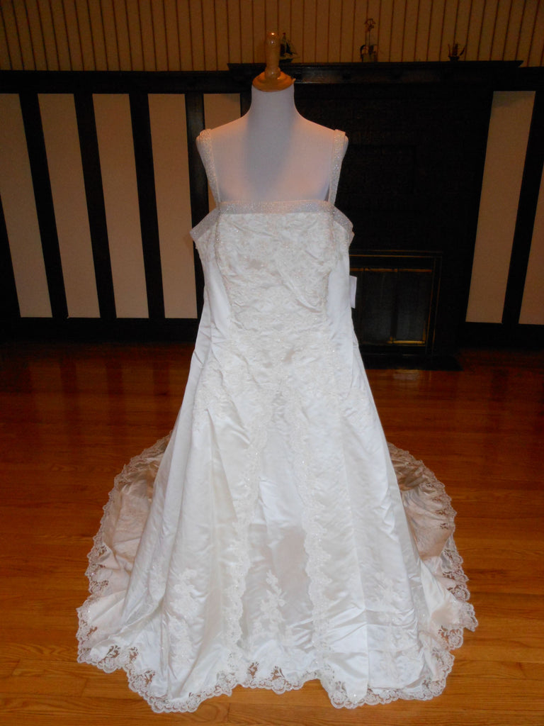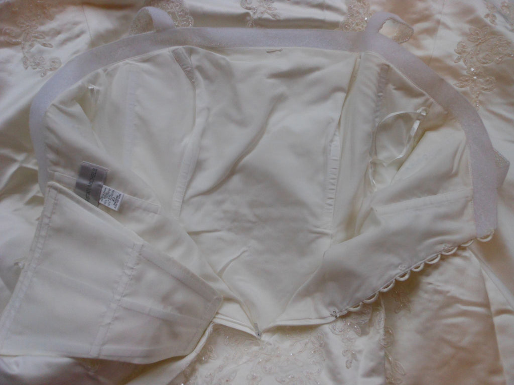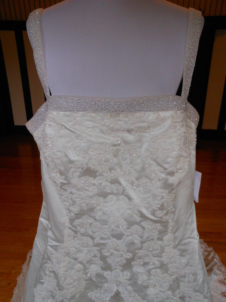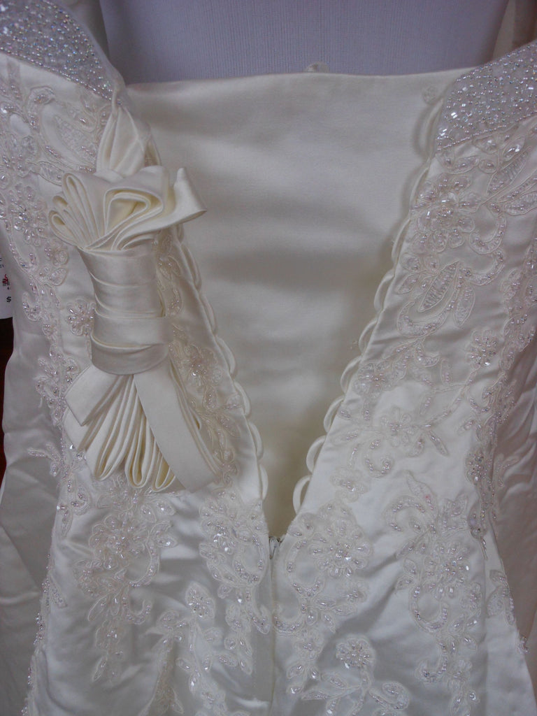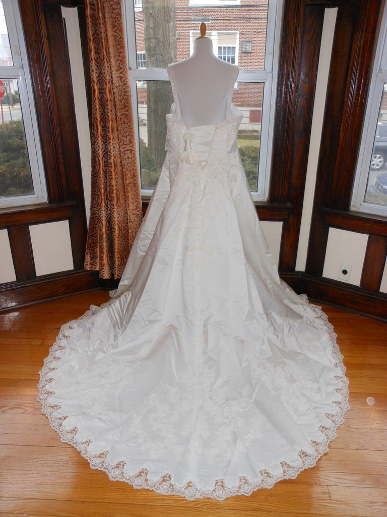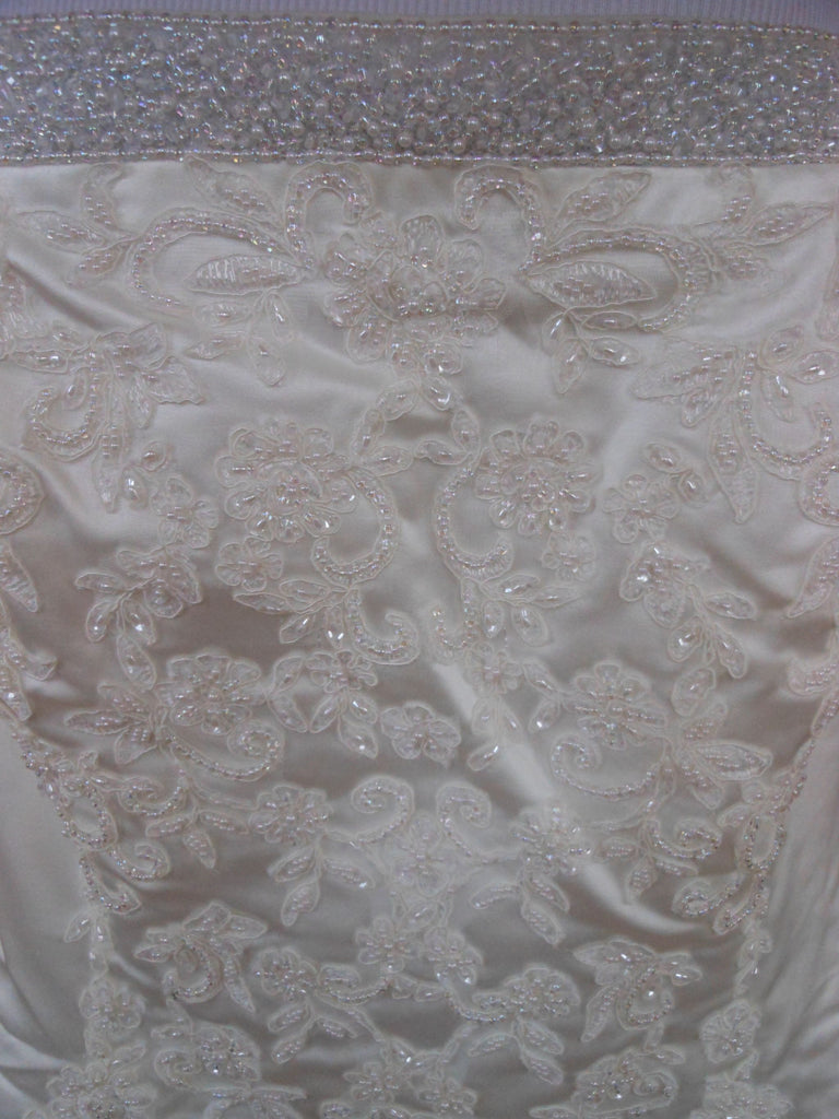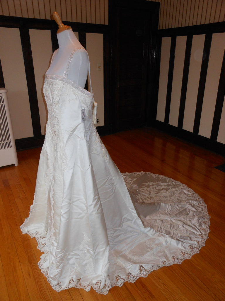 This is an Authentic CHRISTIAN MICHELE Bridal Wedding Dress Gown. The style number of the dress is 1155WW. It has a gorgeous A line style with a fabulous long train. The gown is embellished with exquisite floral embroidered lace, and sparkling beads/sequences on top of the lace. The bodice also has boning to build a perfect shape. The skirt has netting petticoat inside to support a full shape. This dress is brand new in great condition with the original label and tags. It was never worn.