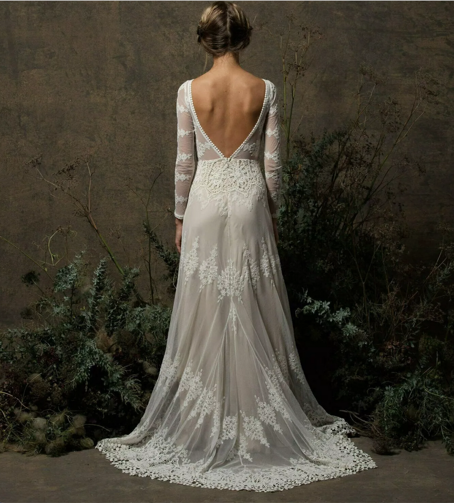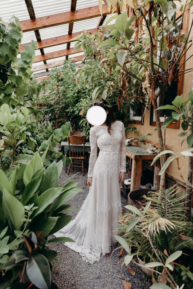 Are you looking for a bohemian wedding dress with long sleeves, low back, and is as comfortable as it is beautiful? Skip the stiff gowns with itchy laces and layers of restriction. The Aurora cotton lace wedding gown is lightweight and breathable; you’ll be able to move around all day/night in comfort. The sewn-in bra cups provide just enough ‘boob support,’ so no bra needed. This is the dress that tells your guest you’re ready for a relaxed, yet beautiful celebration. We get it that wedding planning can be stressful; to help calm your mind, we will create your dress to your body, so you can avoid the stress of costly alterations.
