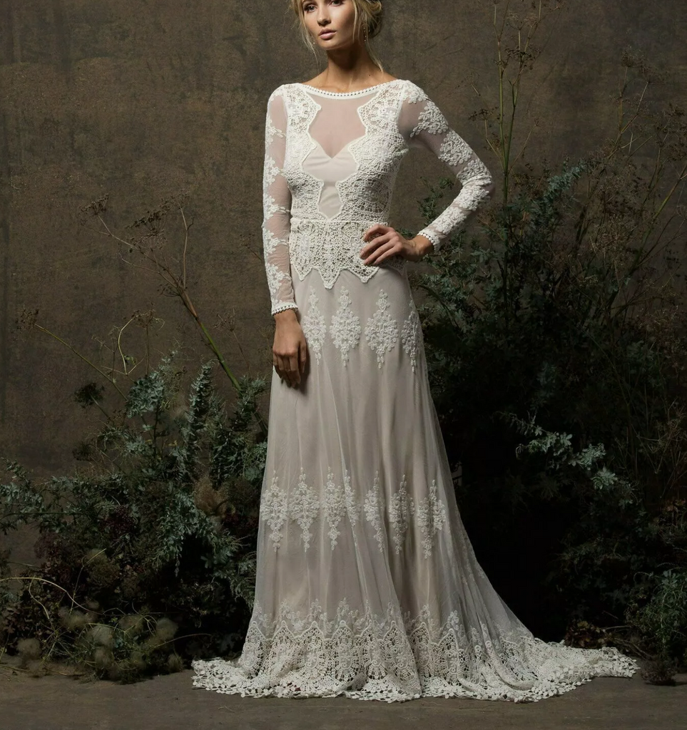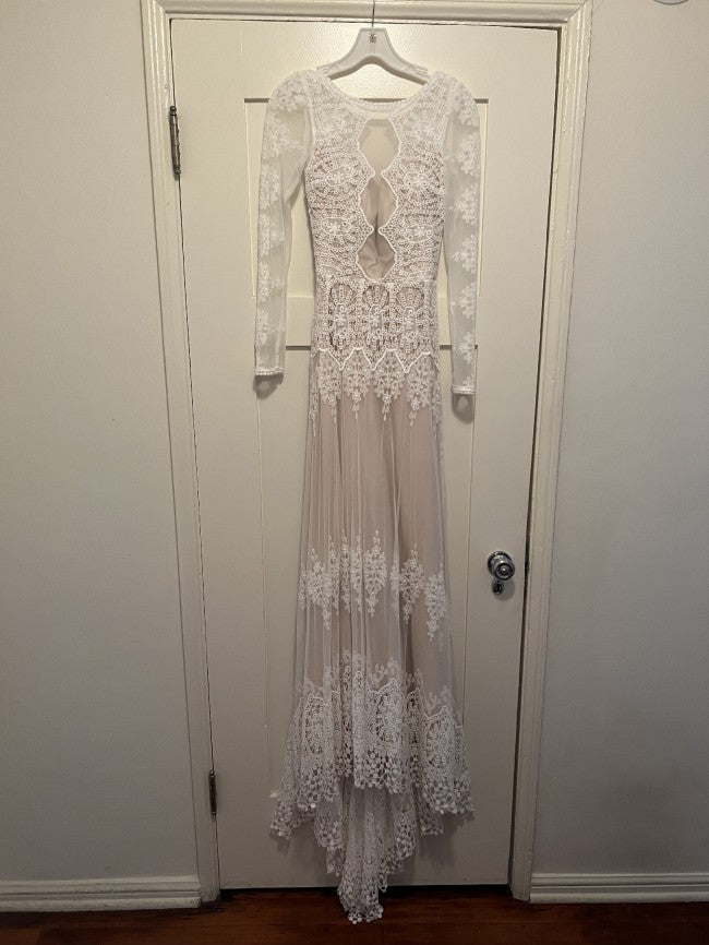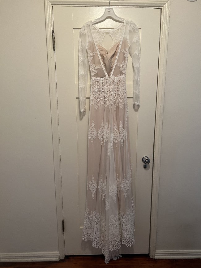 This is a beautiful, bohemian-style dress with lace detailing throughout, long sleeves, a sheer neckline, and "nude" liner. I absolutely loved wearing it and it was so easy to move around in.