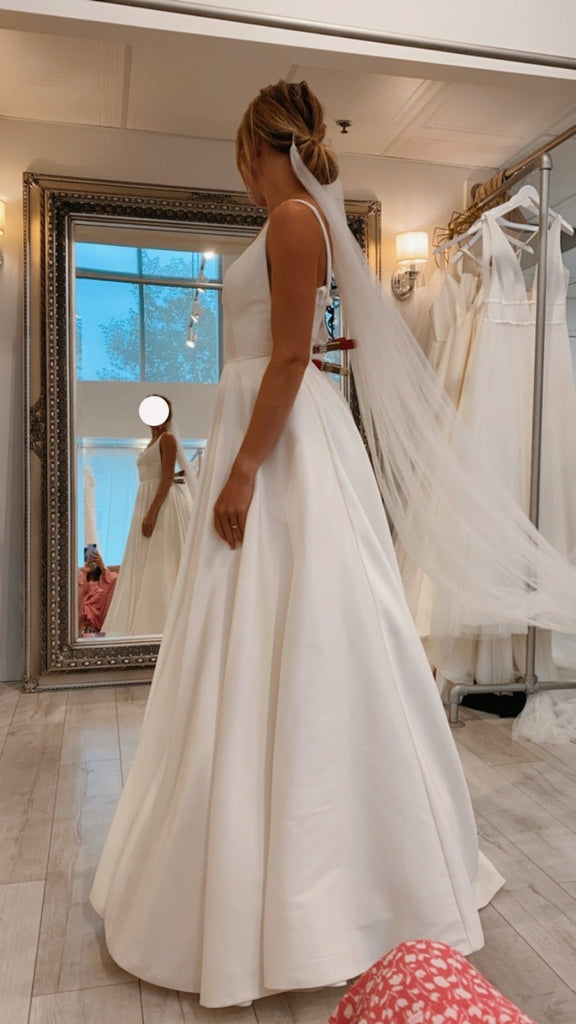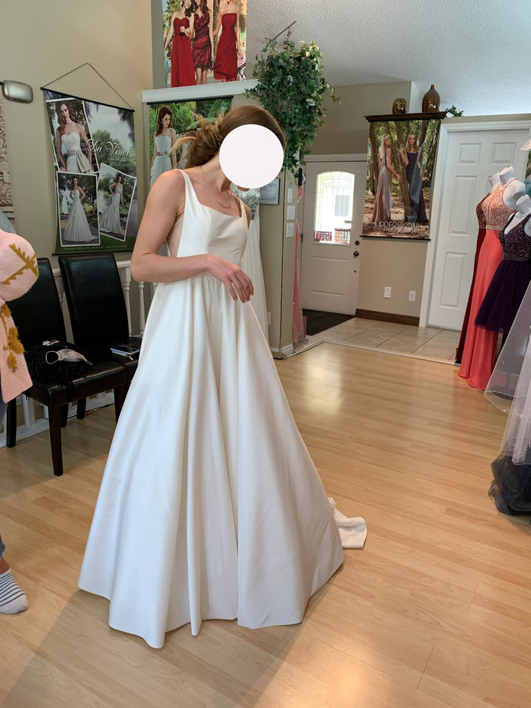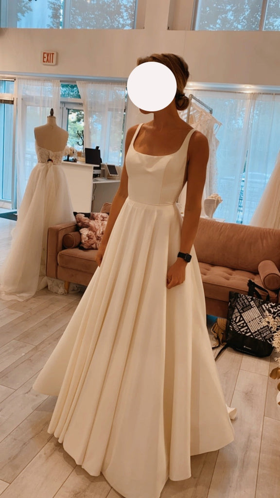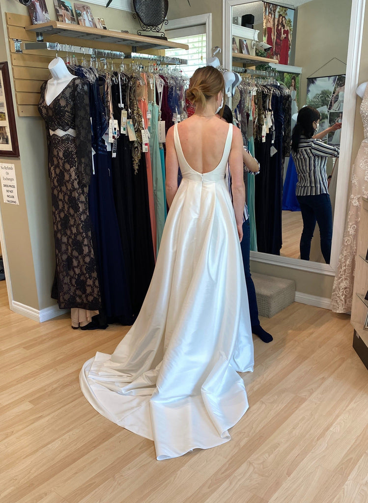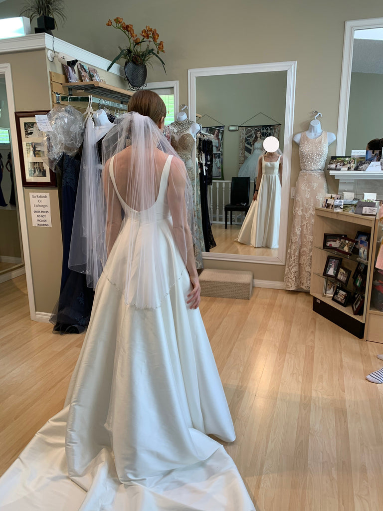 There were so many things I loved about the gown: I love the timeless 90s vibe, the material, and the square neckline. But like many couples out there, we made a change of venue due to COVID. As a result, I went with a very casual gown. I love this gown and hope it will find a bride that suits it!