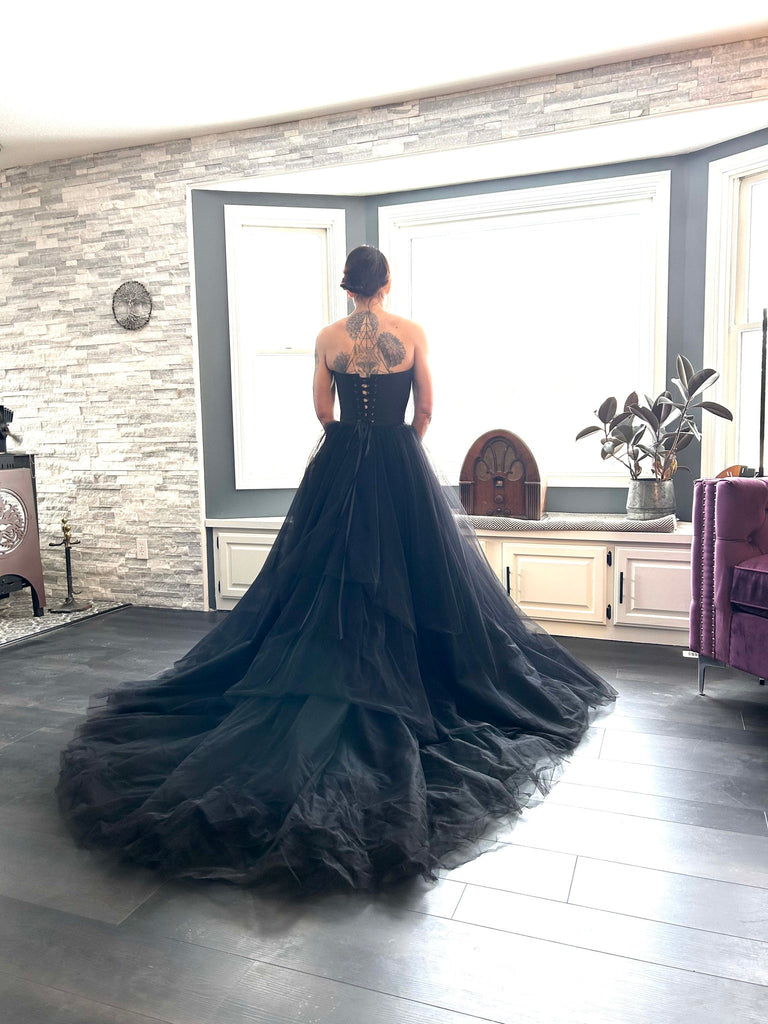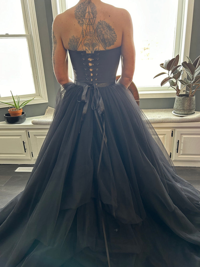 This strapless, black corset, trained bridal gown with organza overlay has never been worn.
