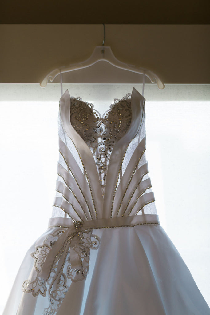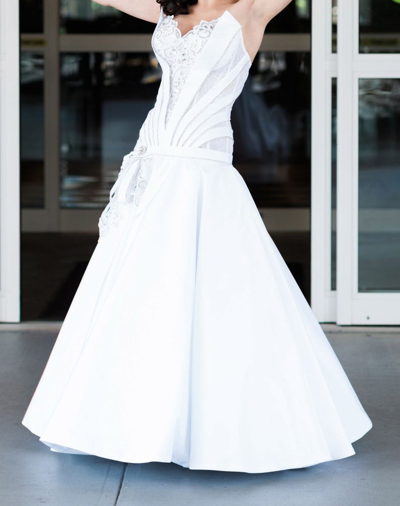 This dress is EXTREMELY light and is easy to adjust to slight variations in body size. I actually had a terrible situation with my first wedding dress so that I purchased this second dress within one week of the wedding based on friends' recommendations about this designer. I picked out a dress online, sent in my measurements, and a few other requests about the dress, and it was done. I tried it on a few days before my wedding and the dress fit perfectly. The only adjustments that were done was shortening the trim to fit my height. The reason for this is the well-built corsette within the dress. It allows for easy adjustments to fit a bride's body that does not require actual sewing alterations. The strapless dress held up great during dancing. If you notice in the pictures, the strapless portion comes up fairly high into the armpit which prevents the fabby look and lines that occur with multiple other strapless dresses that are not well-constructred.
