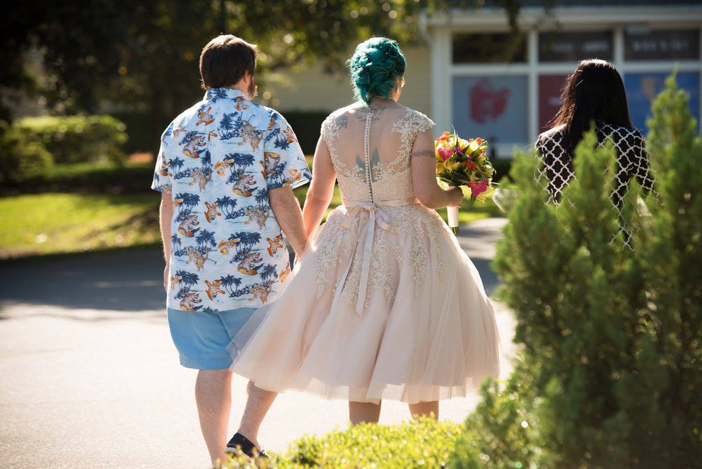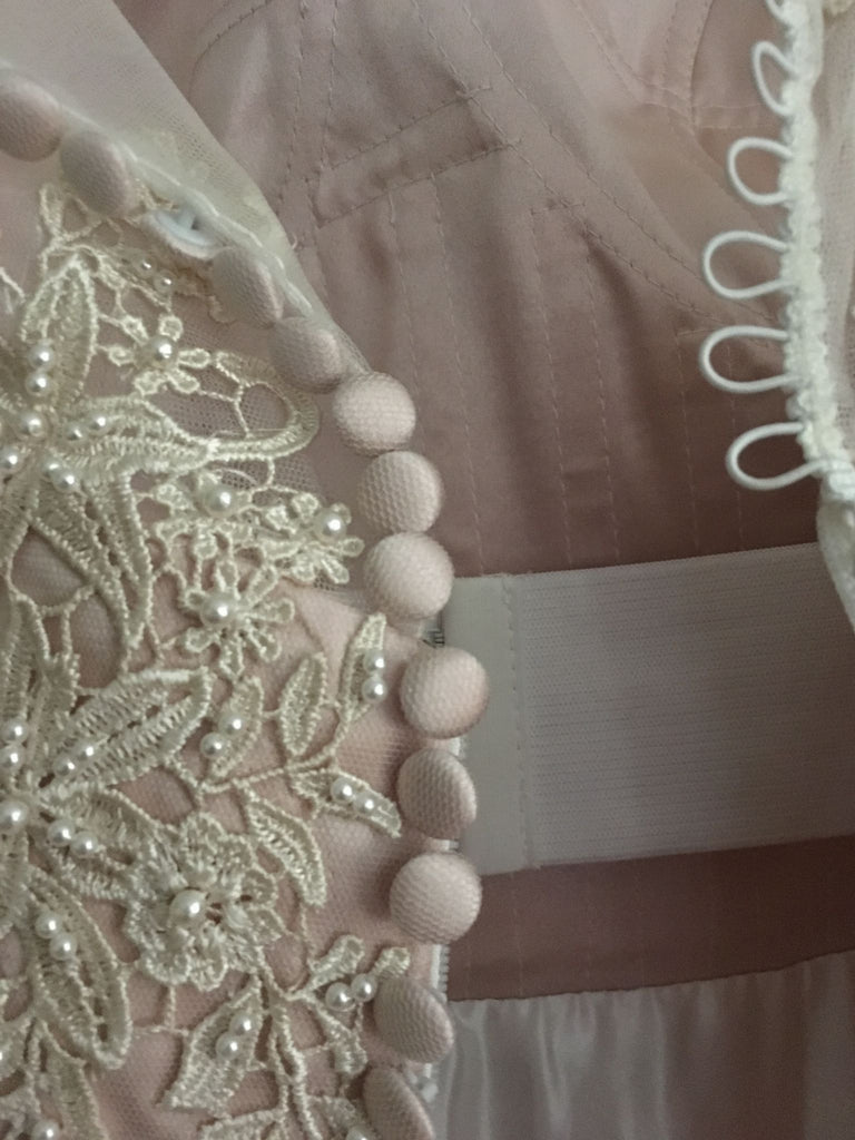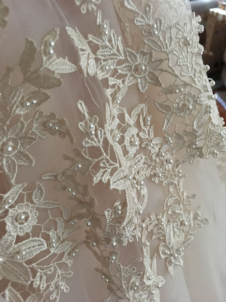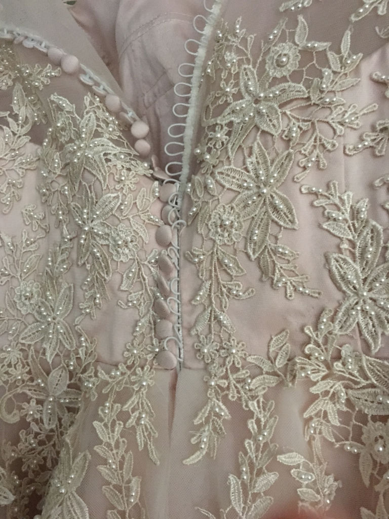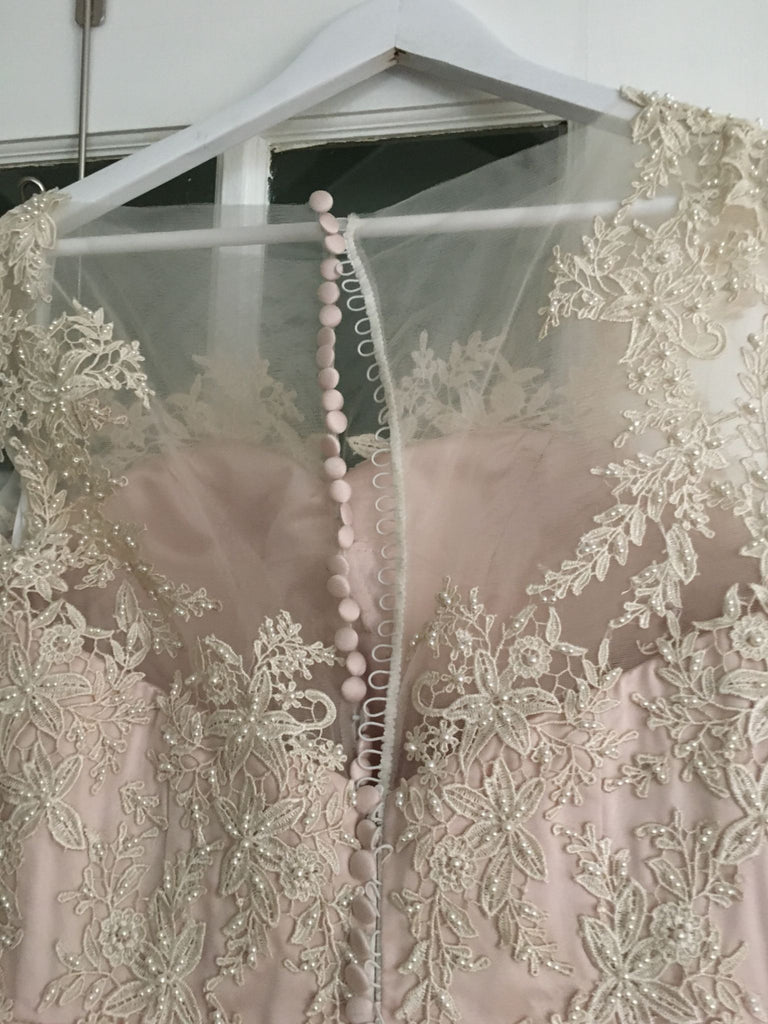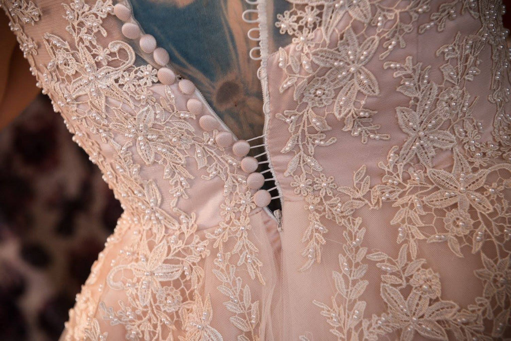 A blush / soft champagne tulle tea length dress overlayed in gorgeous hand dyed lace trickling over the bodice and skirt. The sheer illusion neckline and back detail make this dress ideal for those who want a little more coverage without hiding too much. Pearl buttons and a bow belt finish it off.