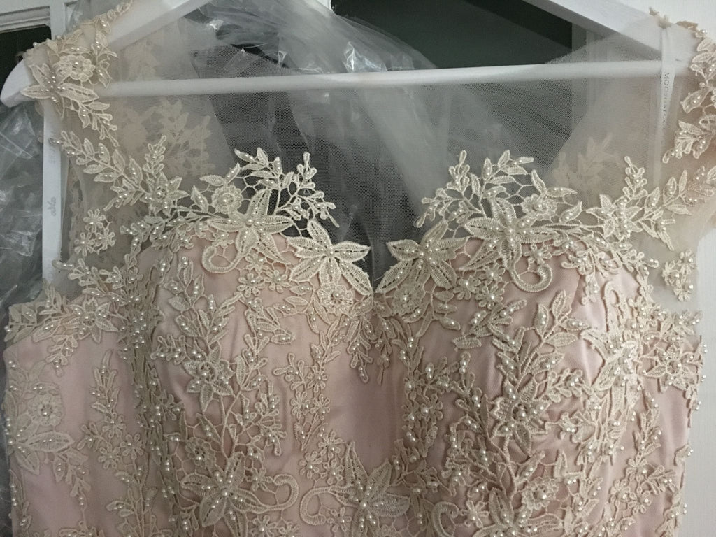 Blush tea length tulle and lace gown with illusion neckline and cap sleeves.