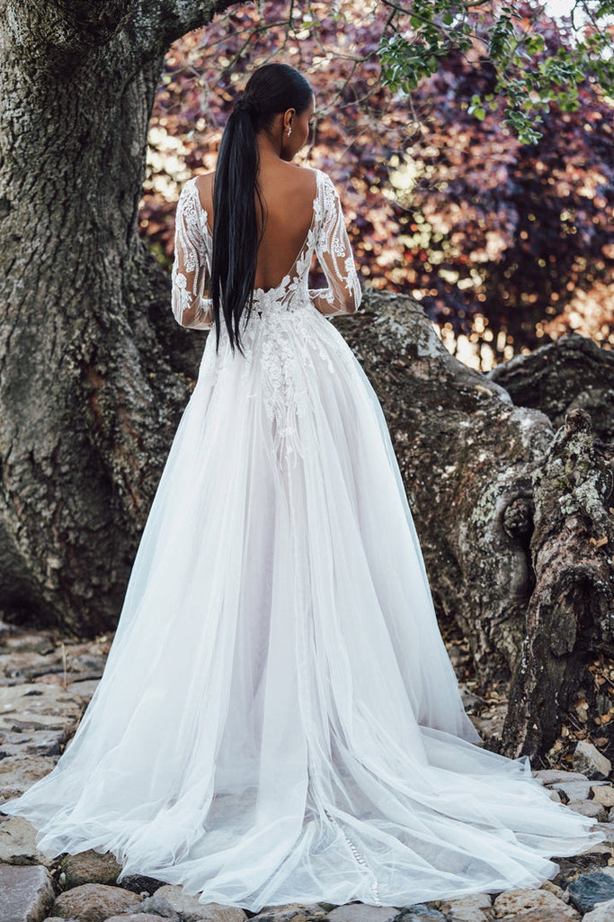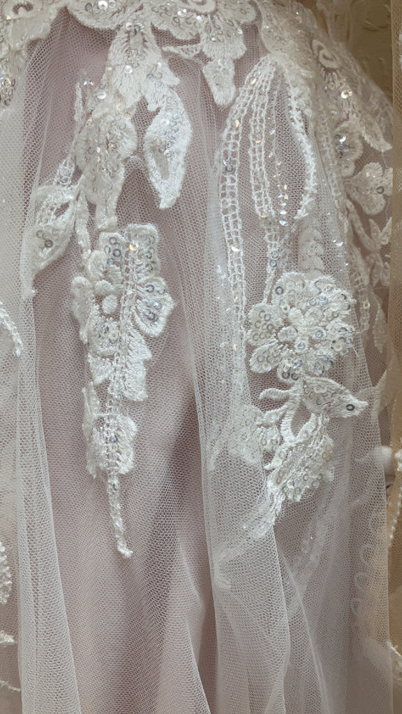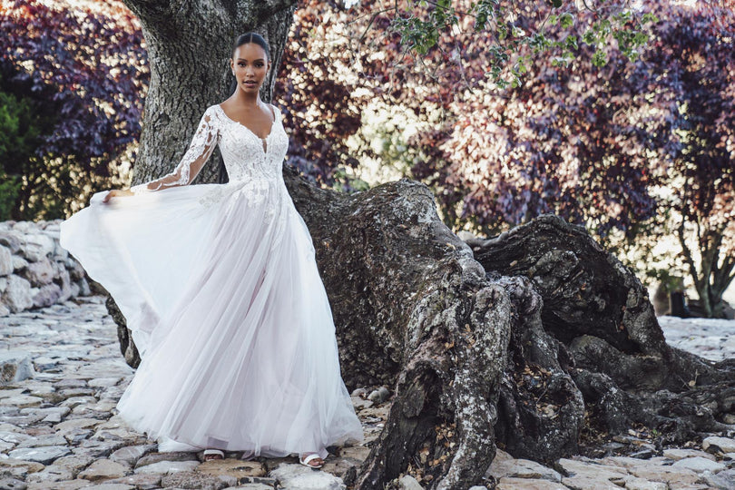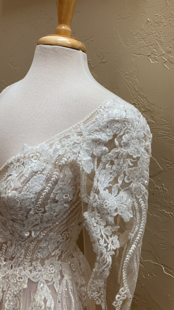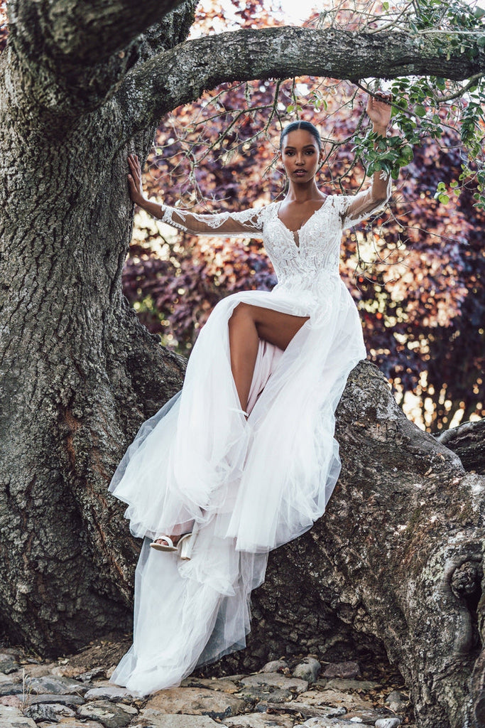 Featured in the Spring 2023 Romance by Allure Bridals collection, this is style R3600. A dream destination dress or perfect for your romantic outdoor ceremony, she's made of sparkling sequined appliqus trailing down the bodice and illusion sleeves of this dreamy A-line gown. And we're absolutely loving the plunging neckline, low v-back and sexy slit!
