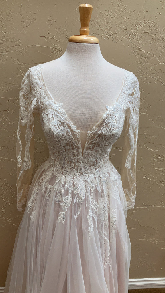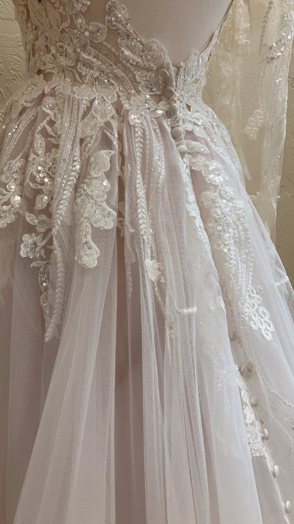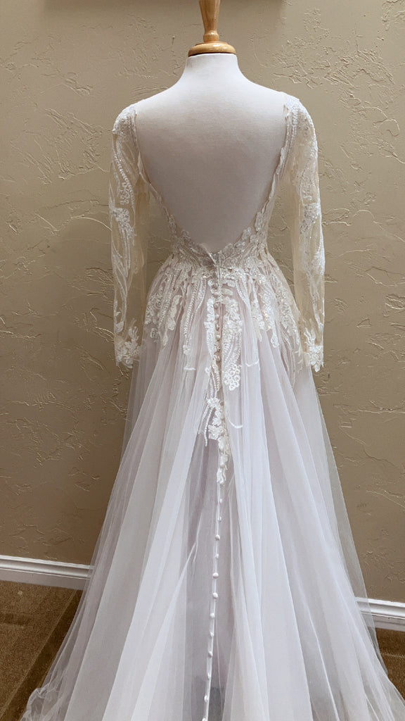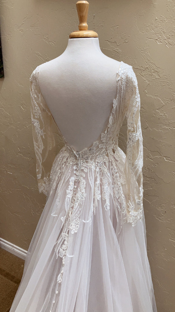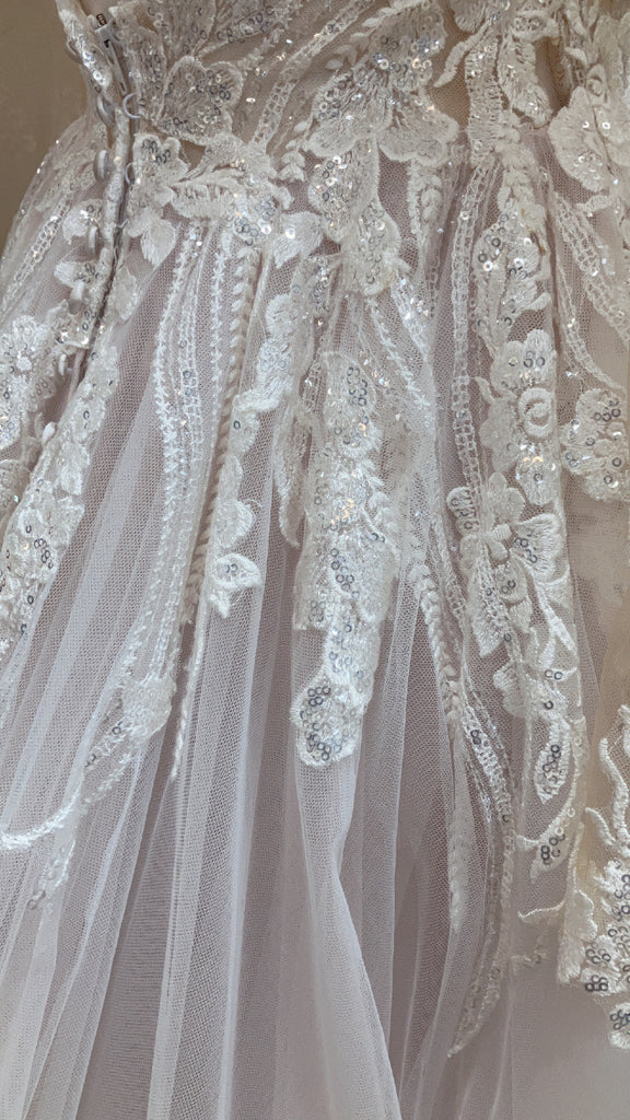 Sold As Is: This dress may have some loose beads/buttons or small issues having been tried on in the store that may need tending to. Any major damage to gown will be disclosed in gown description and priced accordingly. Gown photos available upon request. All sales are Final.