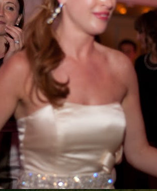 BELT: This is the show piece, the entire belt that wraps completely around the dress, is made of sparkling Swarovski Crystal Rhinestones, and ivory pearls- in "X" patterns. The photo I've attached shows how it sparkles rainbows, it is truly spectacular without being over the top at all. Very subtle.