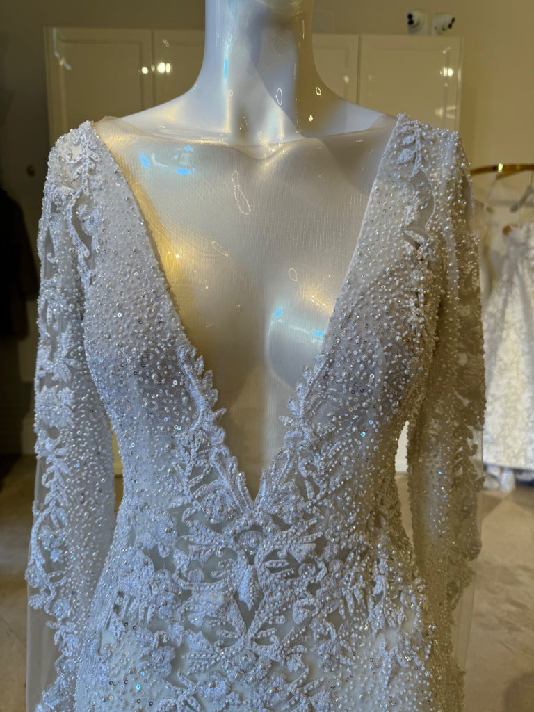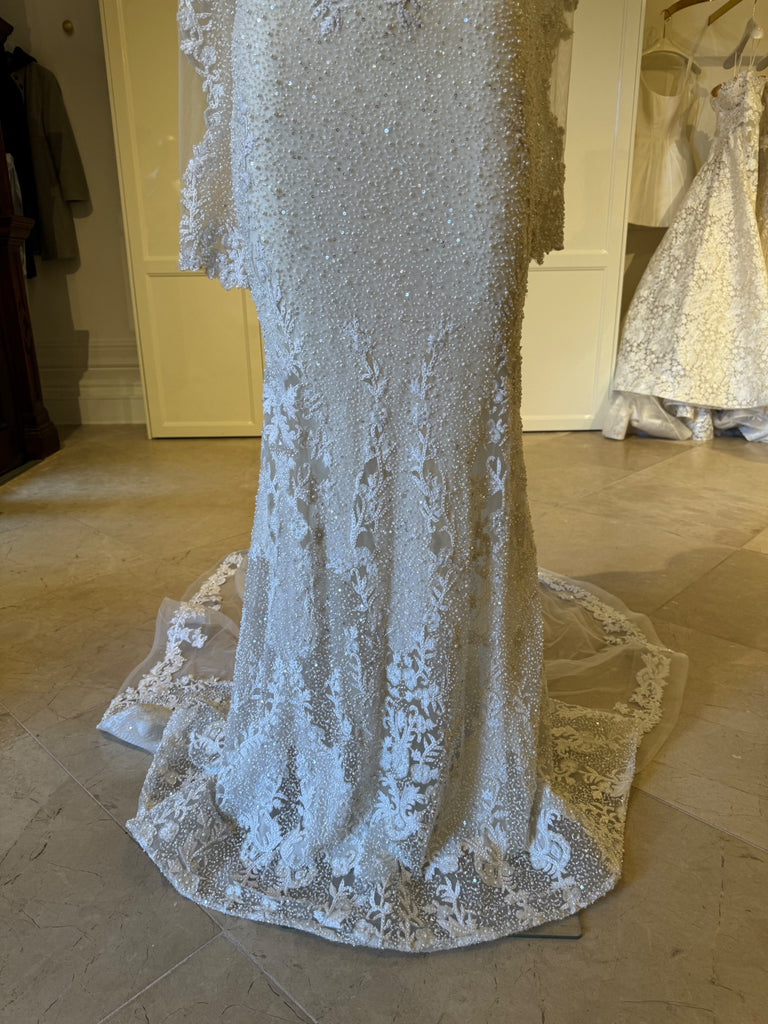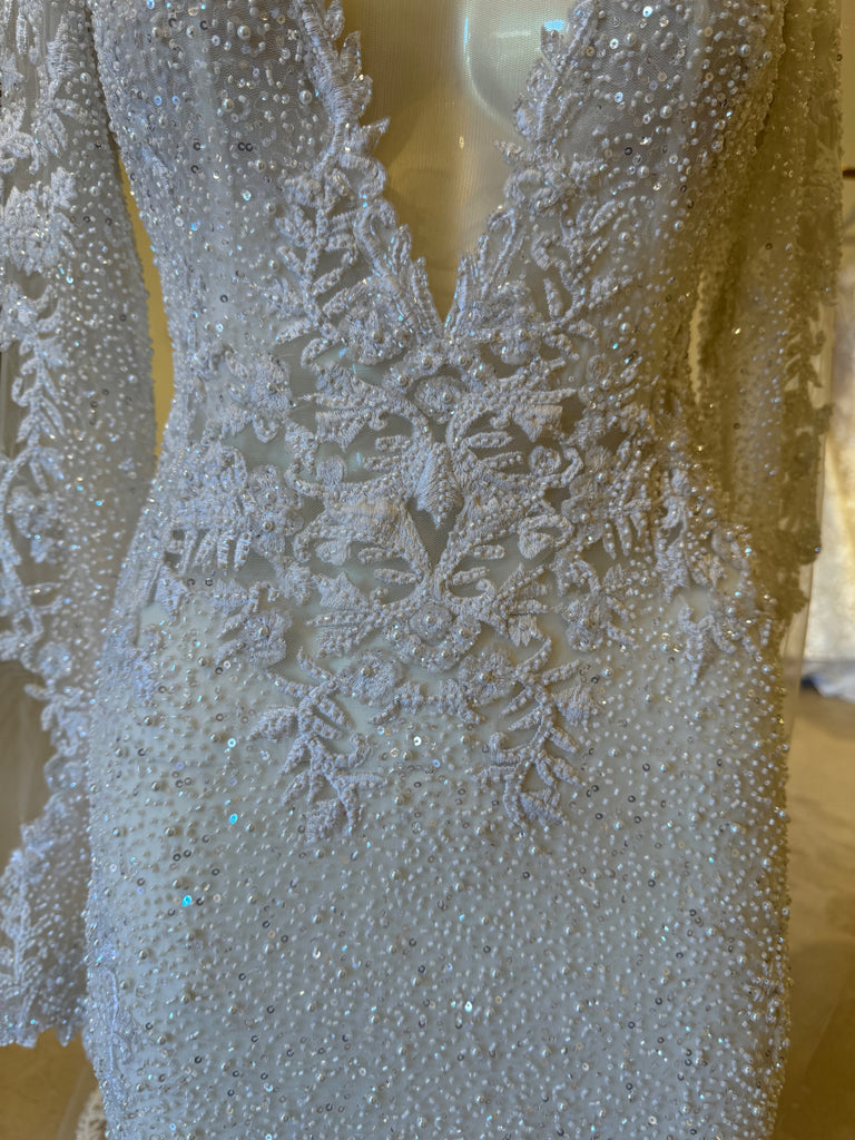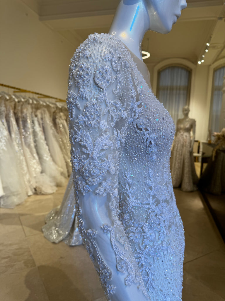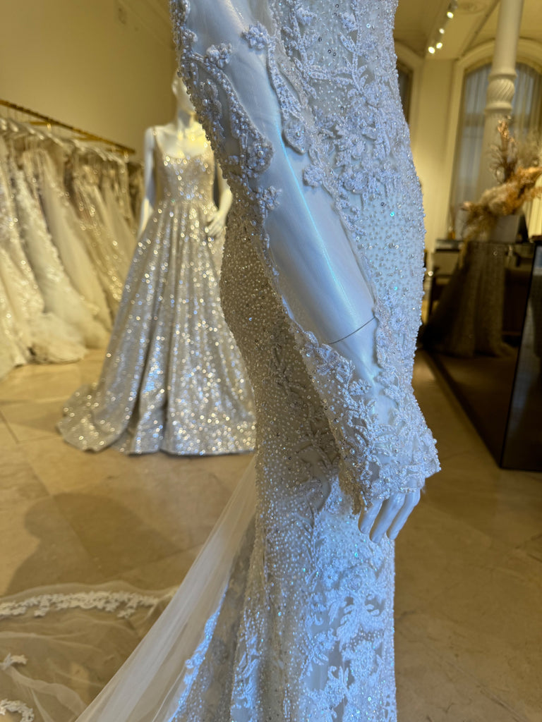 The gown’s fishtail silhouette is designed to accentuate the body’s curves, hugging the figure in all the right places before gracefully flaring out into a stunning train. This meticulous beadwork extends across the entire gown, providing a shimmering effect that radiates sophistication. The low V-back is equally captivating, offering a glimpse of the gown’s exquisite design from behind.