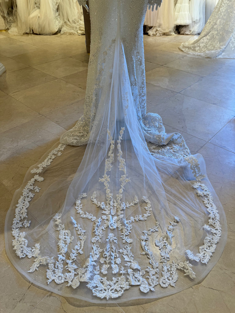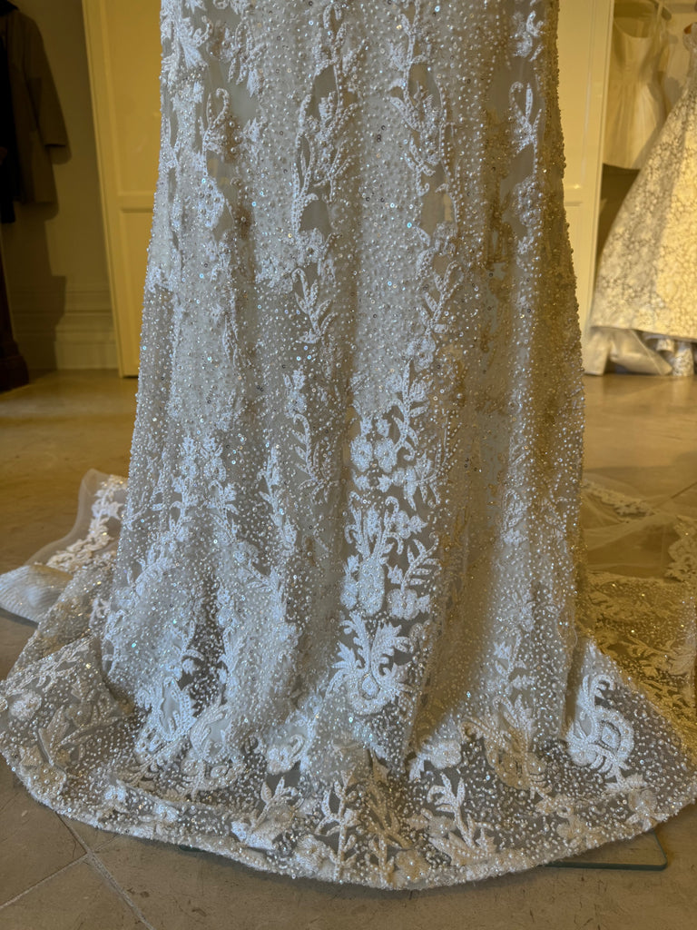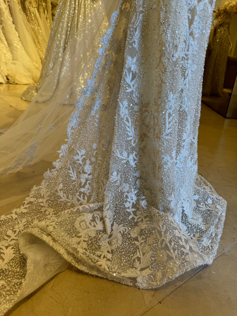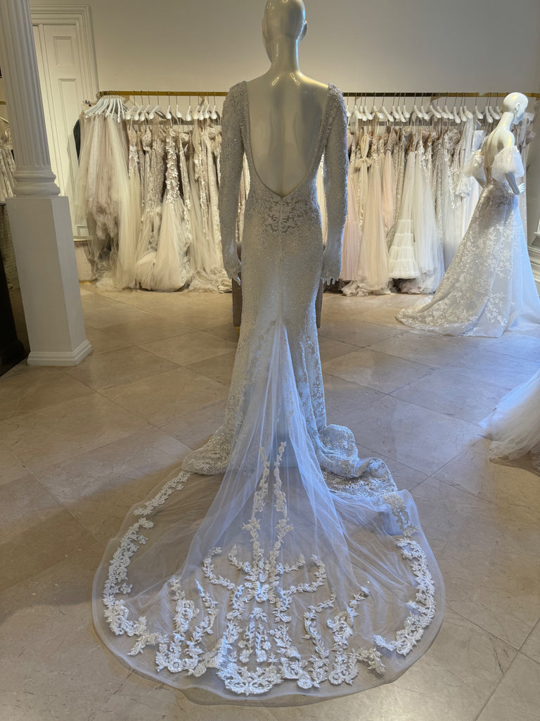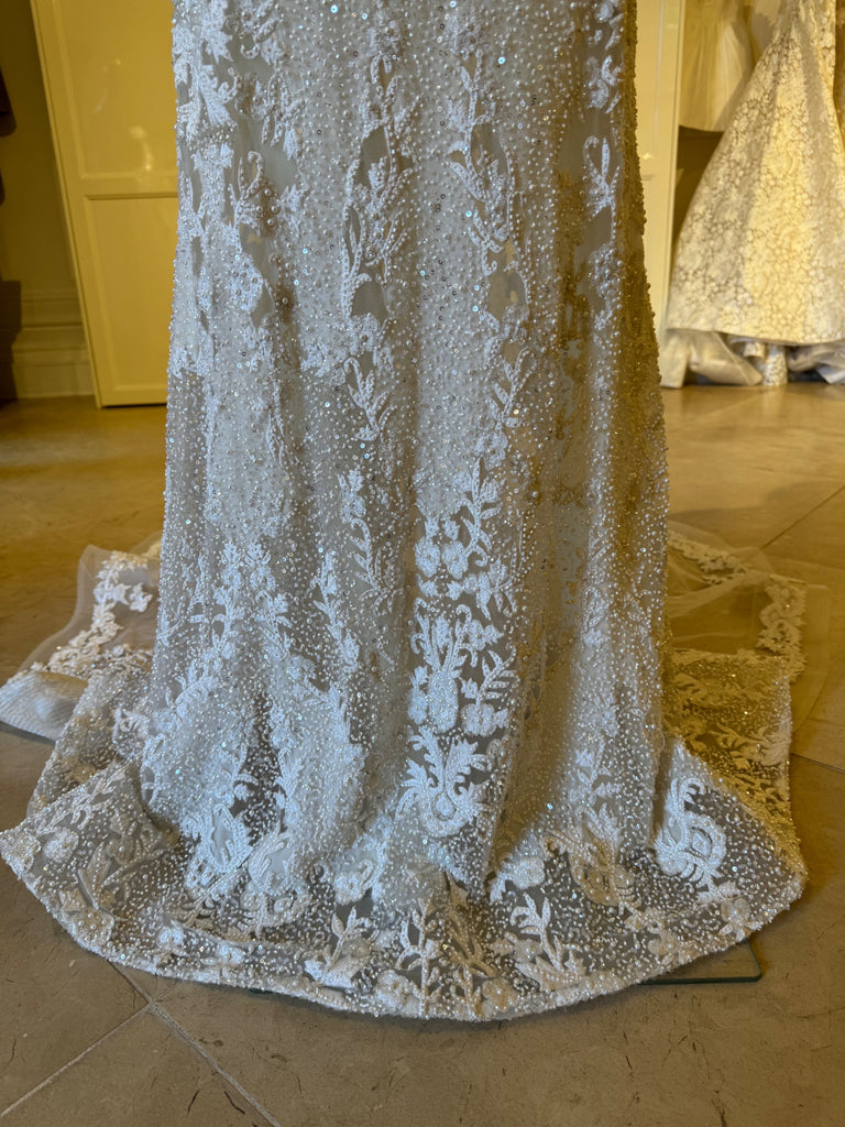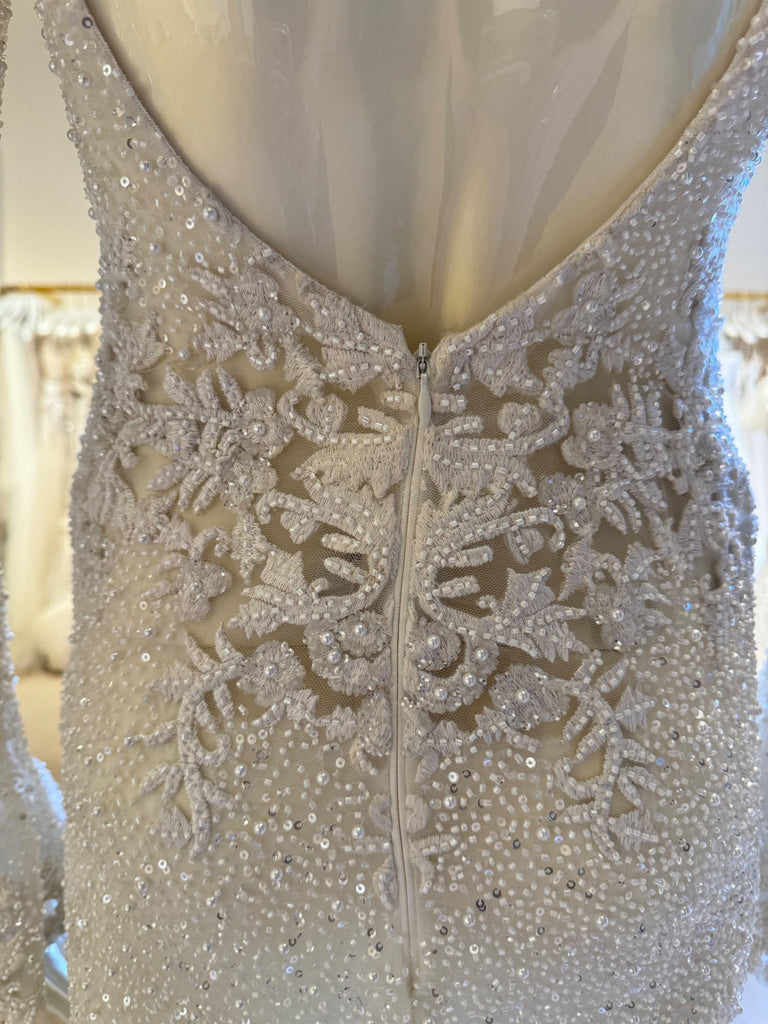 The gown’s fishtail silhouette is designed to accentuate the body’s curves, hugging the figure in all the right places before gracefully flaring out into a stunning train. This meticulous beadwork extends across the entire gown, providing a shimmering effect that radiates sophistication. The low V-back is equally captivating, offering a glimpse of the gown’s exquisite design from behind.