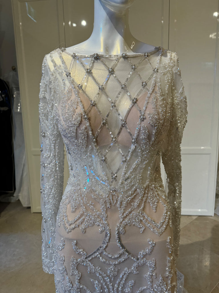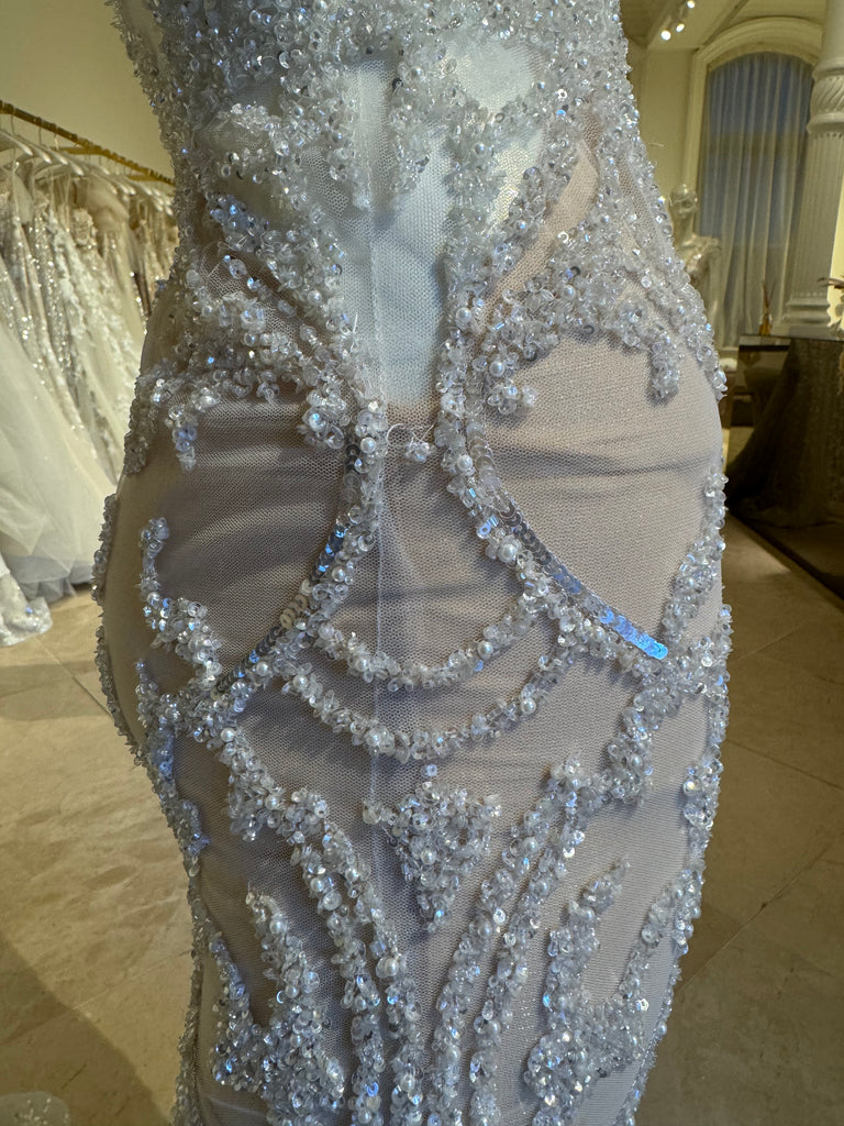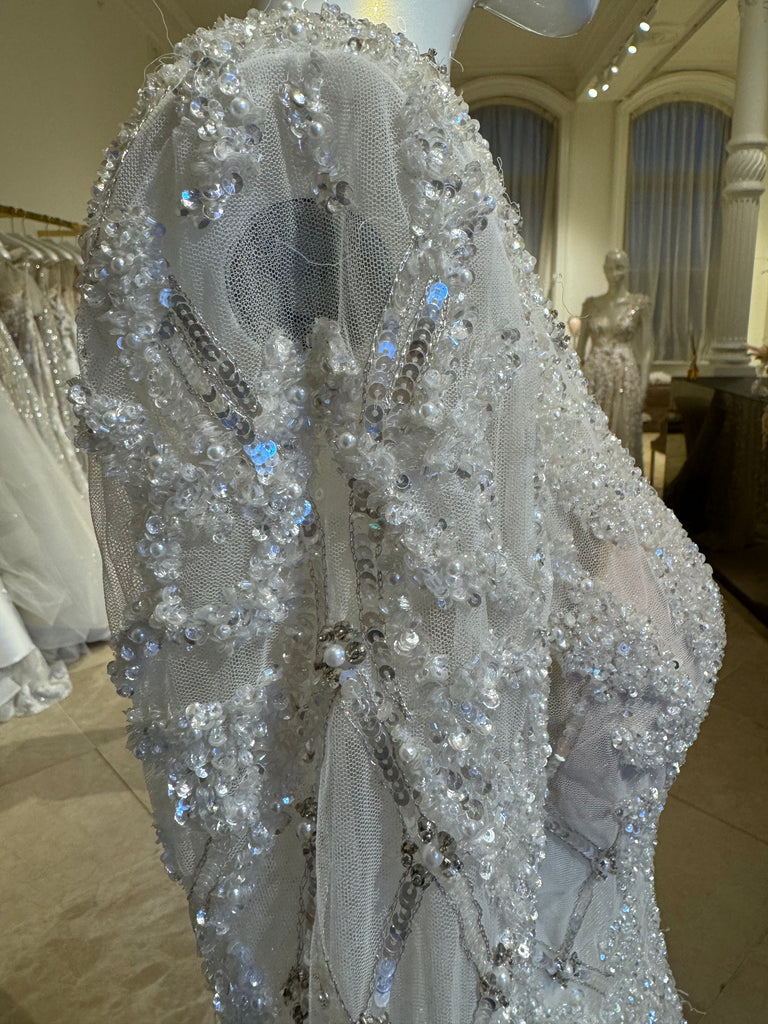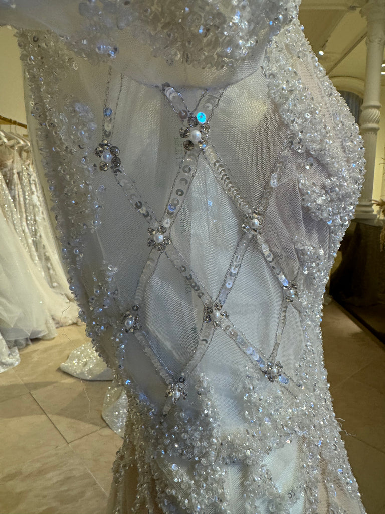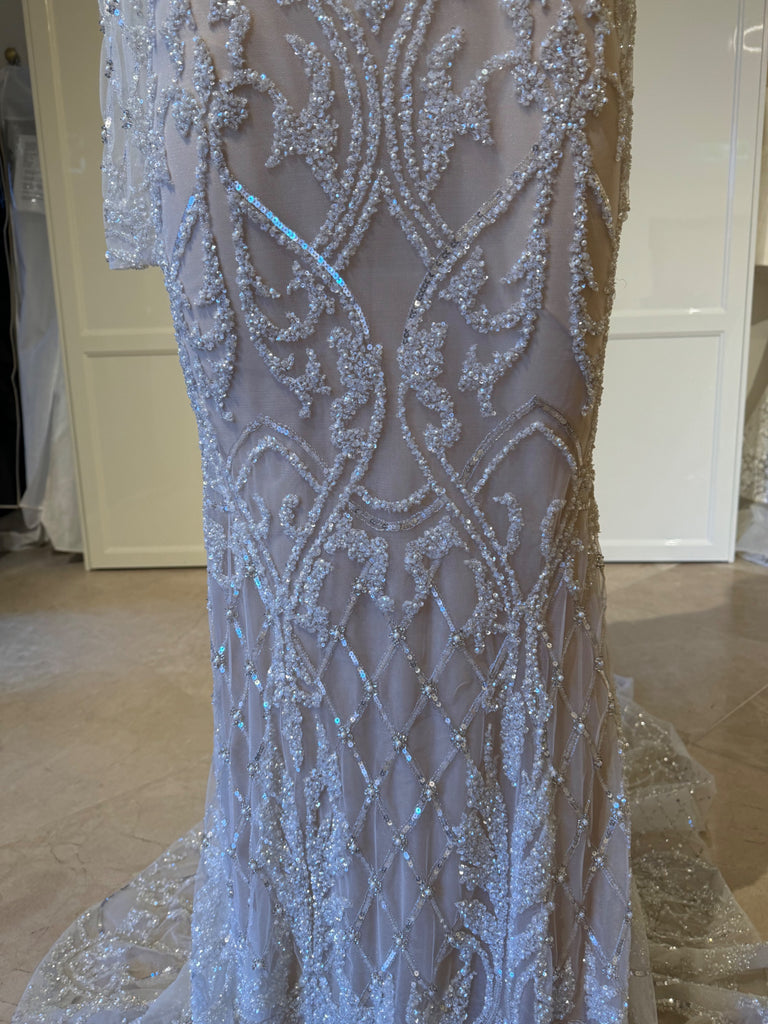 The fitted fishtail skirt hugs the body before flaring out into a dramatic train, which is adorned with diamond beaded lace. This combination of beadwork and lace creates a stunning visual effect, making the train a standout feature of the gown. The low V-back adds a touch of allure, offering a striking contrast to the high boatneck front and enhancing the overall elegance of the design.