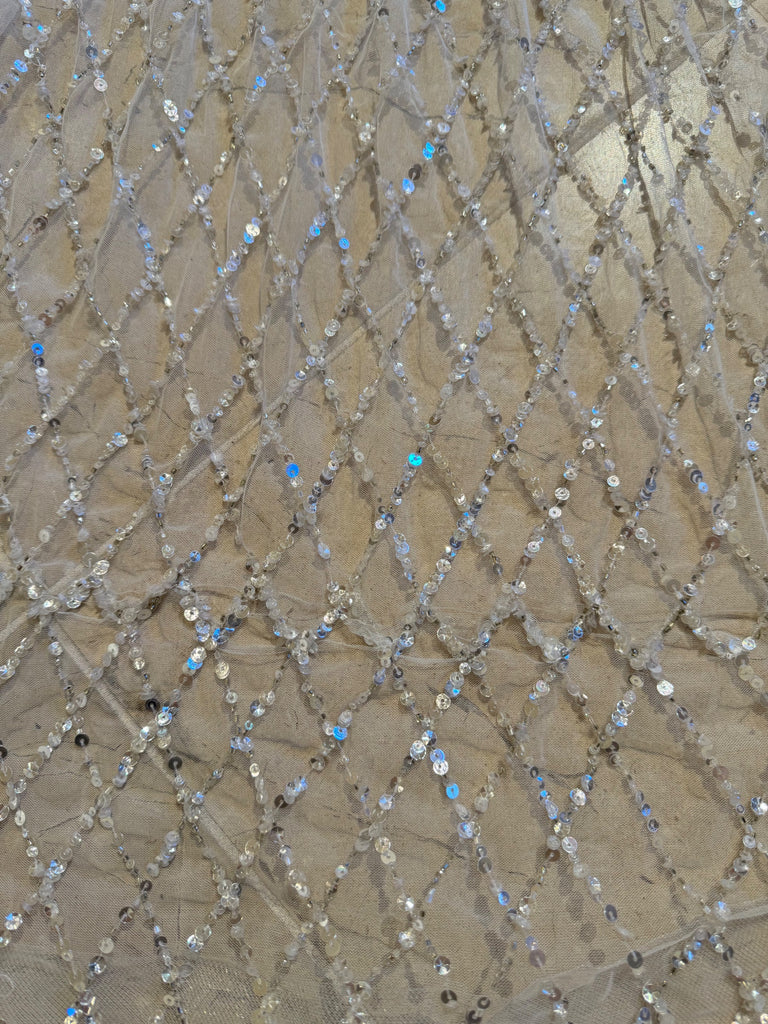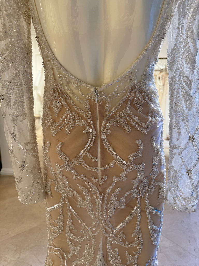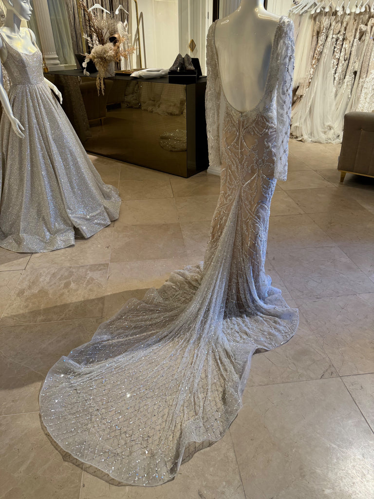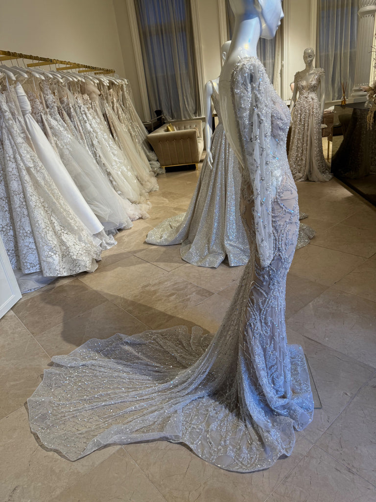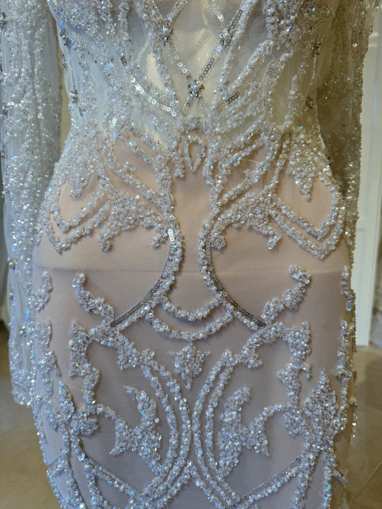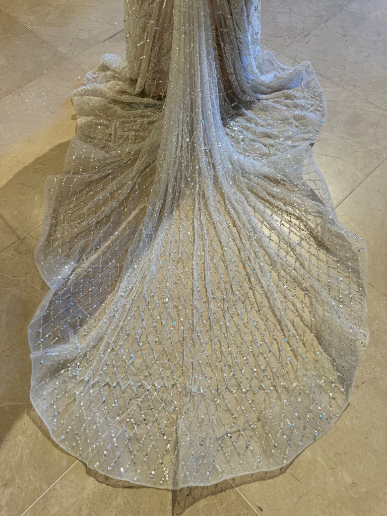 The fitted fishtail skirt hugs the body before flaring out into a dramatic train, which is adorned with diamond beaded lace. This combination of beadwork and lace creates a stunning visual effect, making the train a standout feature of the gown. The low V-back adds a touch of allure, offering a striking contrast to the high boatneck front and enhancing the overall elegance of the design.