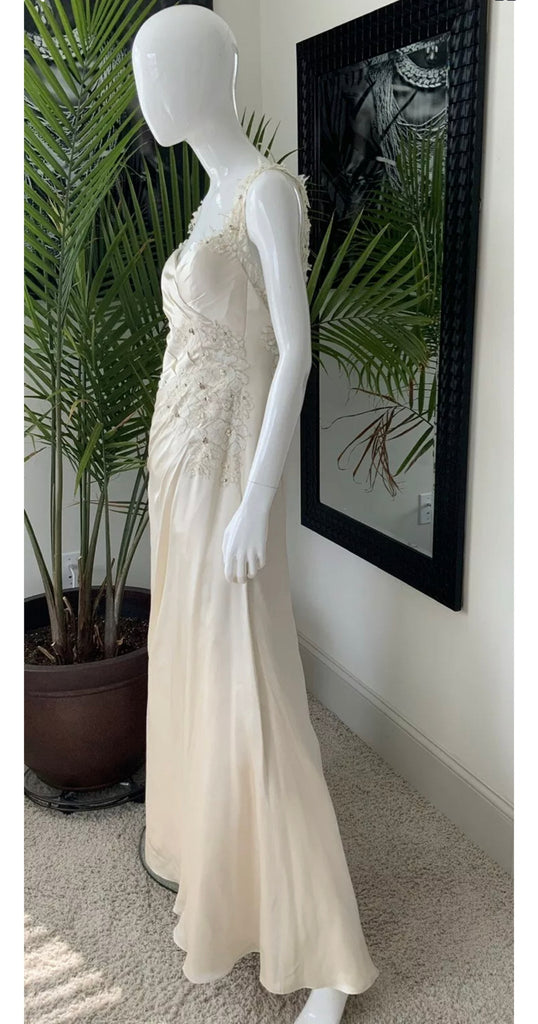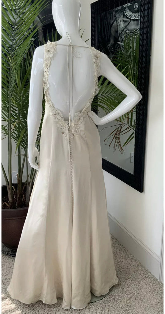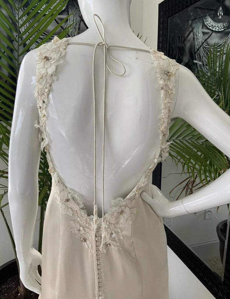 Made of 100% silk charmeuse, this Kelly Chase Couture champagne-colored gown features a sweetheart neckline and a very low open back with a fit and flare skirt with diagonal pleats at the front bodice and skirt. Ivory with Gold thread French Chantilly lace creates the sheer straps and embellishes the neckline at the back and front pleats. Lace is decorated with 3D lace flowers, Swarovski pearls, champagne Swarovski crystals, and seed beads. Other features include a silk charmeuse tie at the back neck beaded with Swarovski crystals, built-in bra cups, and Swarovski crystal buttons at the back zipper.