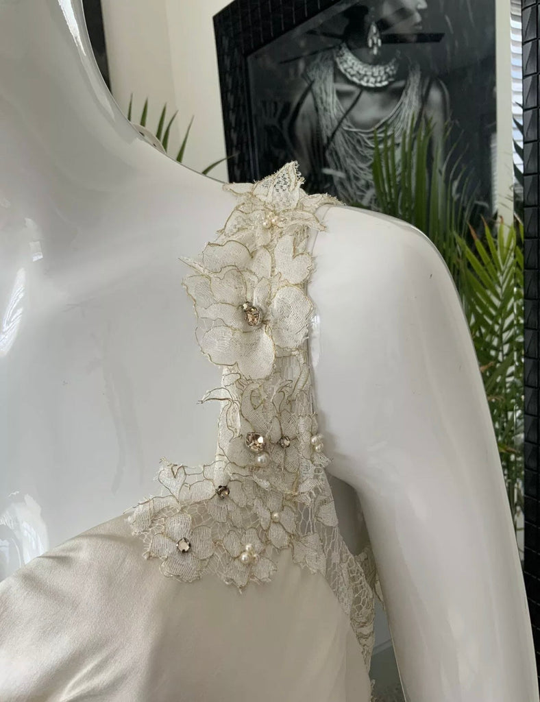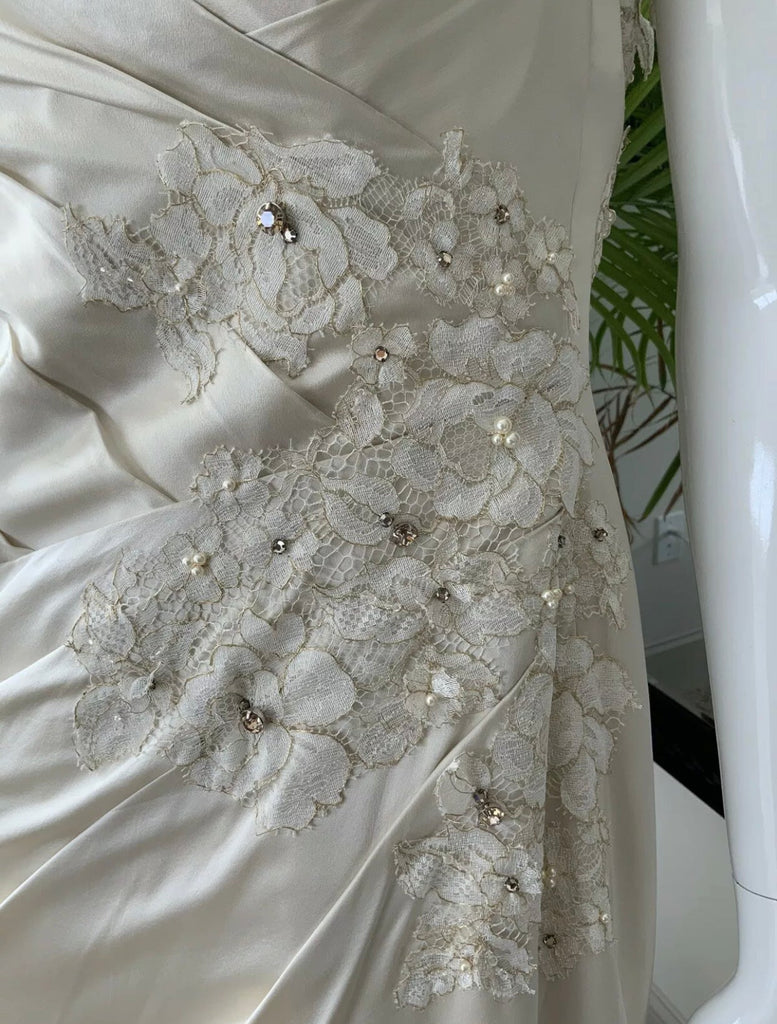 This gorgeous gown is a work of art! The silk and lace fabric was flown in from France just for this dress so that we could get the perfect color. Each Swarovski Crystal was hand-picked so that it would compliment the lace & silk perfectly. Whoever is lucky to purchase it will be a very very happy person to own a dress like this.