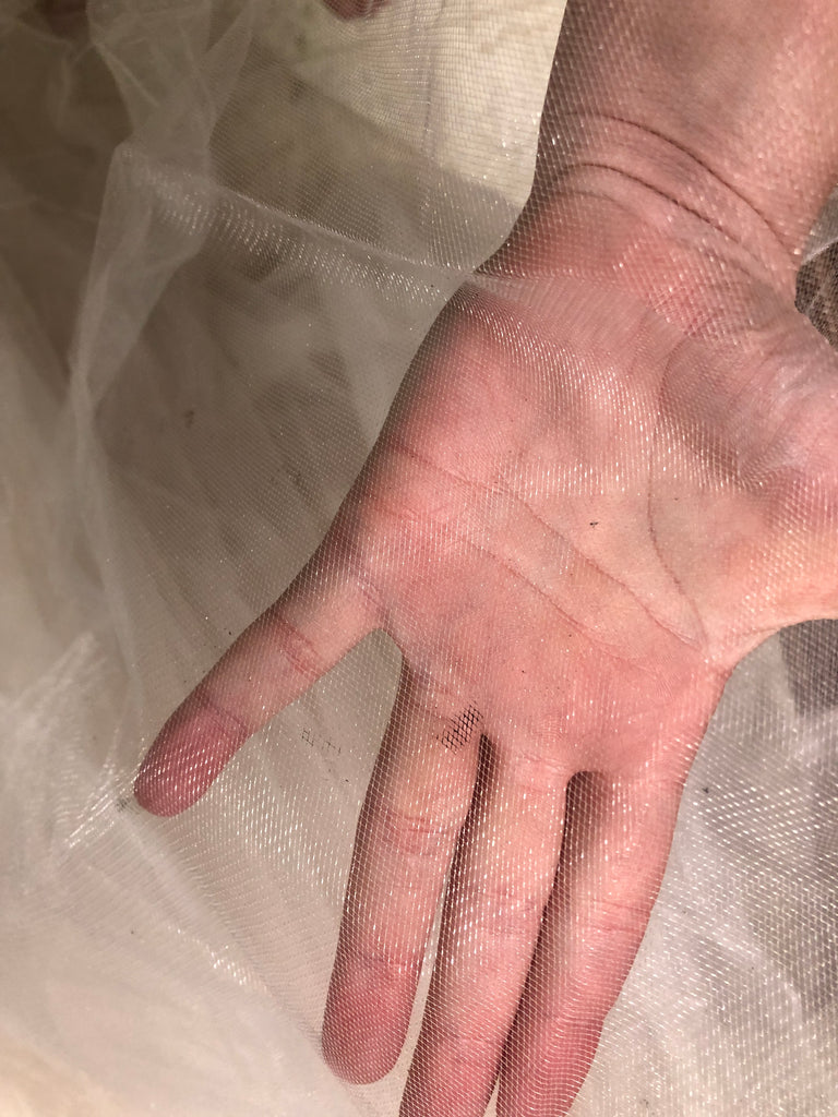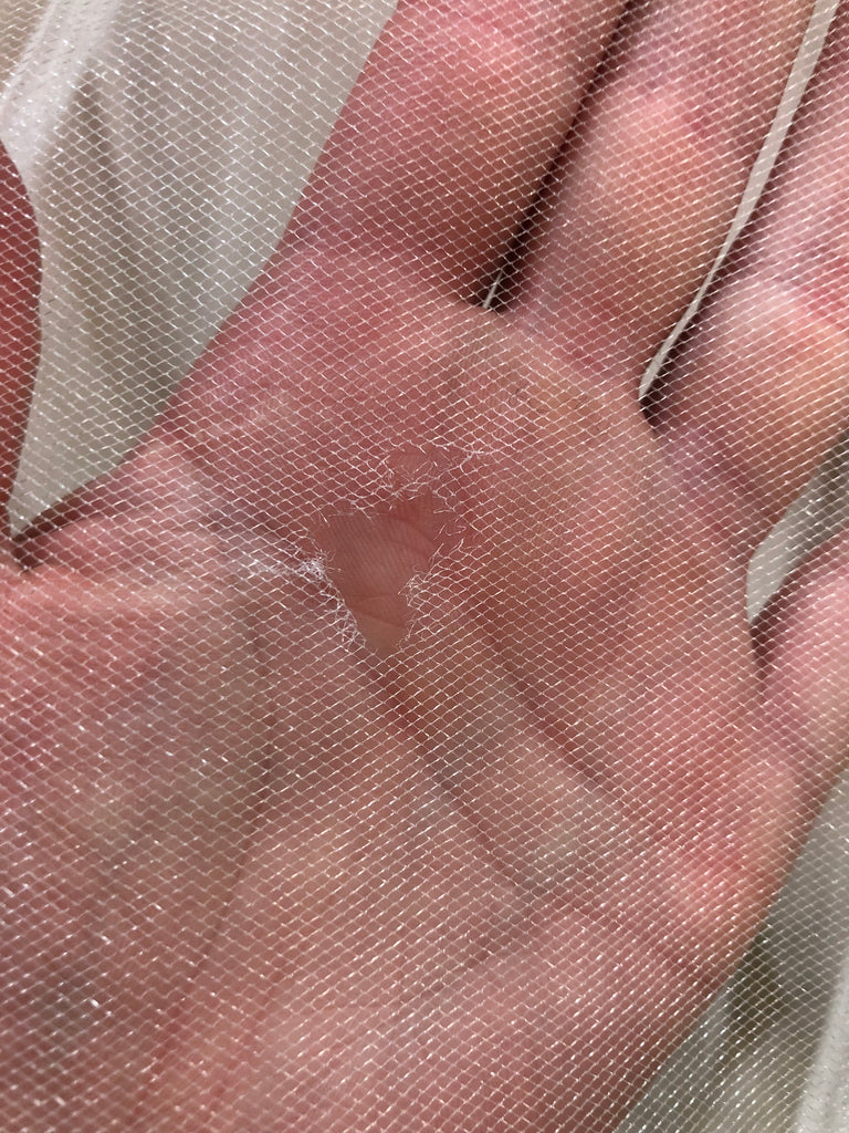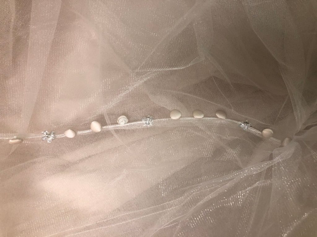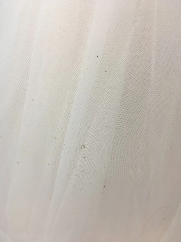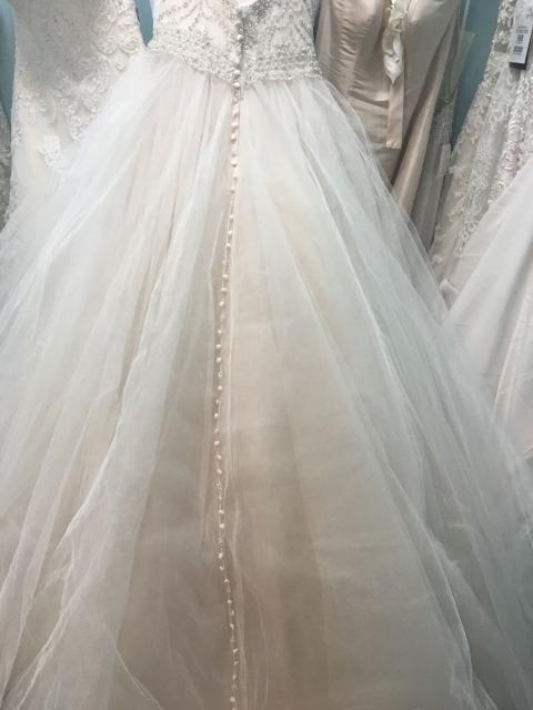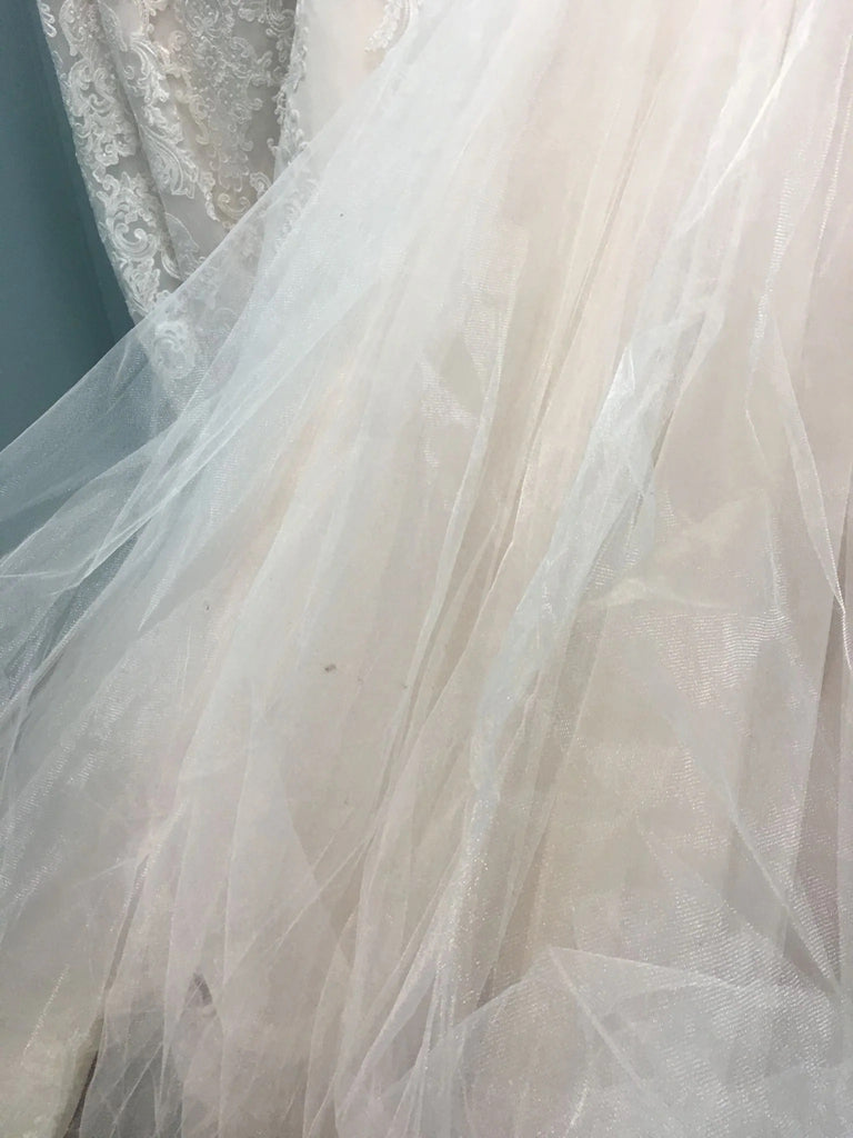 This gown is a shop sample & has been tried on (but never worn or left the store)! This gown is in excellent sample condition, the only indication of having been tried on is there are some marks in the back of the train (see pics), and a tiny tear in the fabric; this may havev gotten run over by a rolling rack? Should be verey easily remedied, as the marks apear to be sitting on top of the fabric, not embedded, if that makes sense?