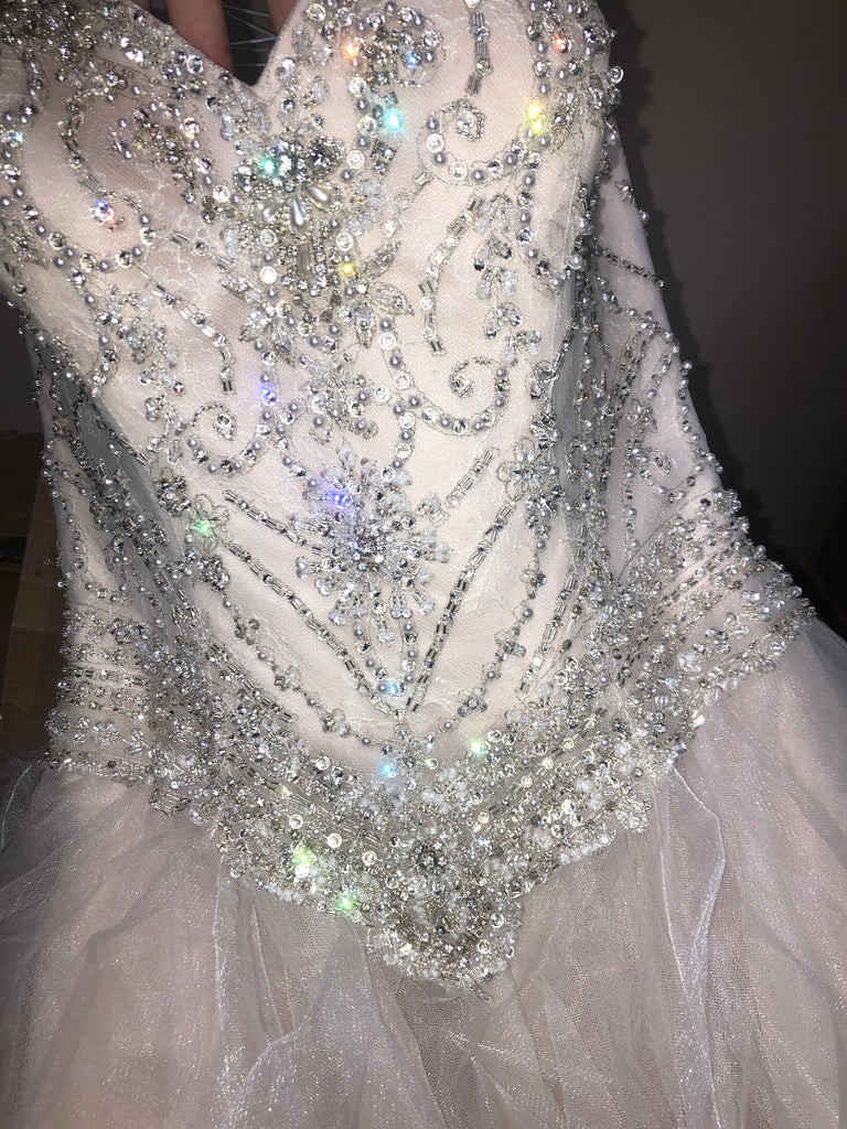 The lace bodice of this gown is SO SPARKLY AND BLINGY!! This thing twinkles like crazy! Buttons run all the way down the chapel train. This is a gorgeous pink blush dress that would be so beautiful for any bride, or even a grad who wants to feel like a PRINCESS at prom! Also, super light and comfortable! Basque waist is so timeless and flattering. :)
