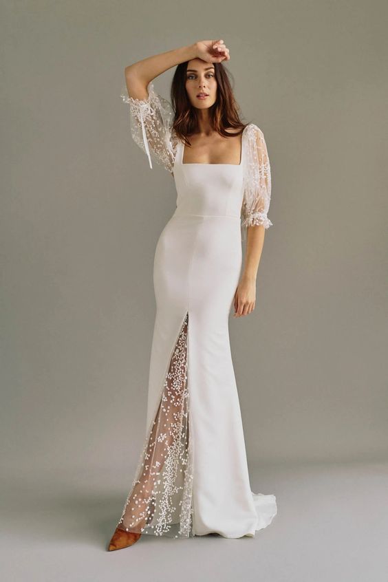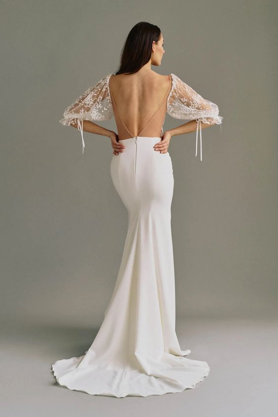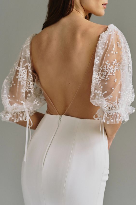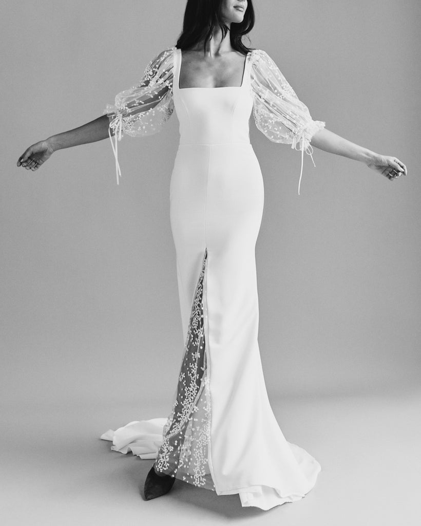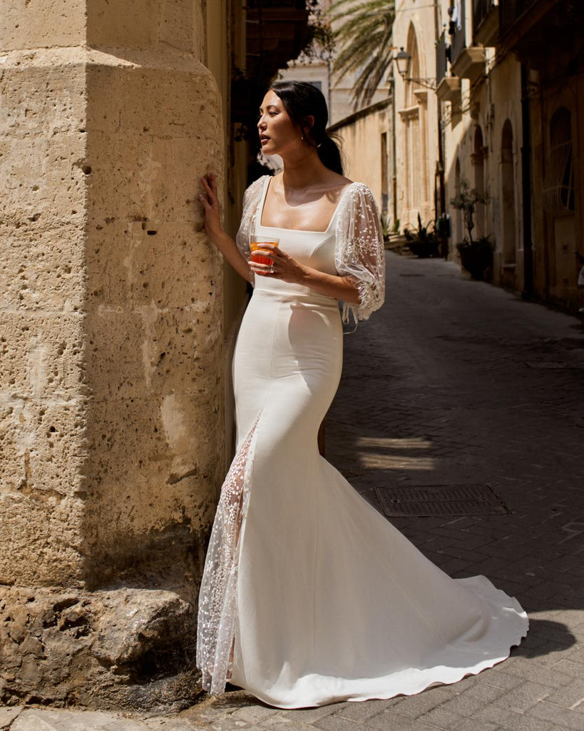 A stylish puff-sleeved dress made of crepe and embroidered dot lace. For the chicest girl in every room. This dress is fashionable but fun, classic but statement-making. The Florence is created fully in a sleek but stretchy crepe, and accented by unique embroidered dot lace on the sleeves and within the peekaboo skirt. Princess seams on the bust and our modern skirt ensure a flattering and form-fitting silhouette all over. The lace puff sleeves are secured and adjustable with a thin grosgrain ribbon. The dress is lined in lightweight Italian stretch lining, and 2 layers of taupe mesh angle in at the back for a seamless open-back look. This one’s for you, trendsetter. ;)