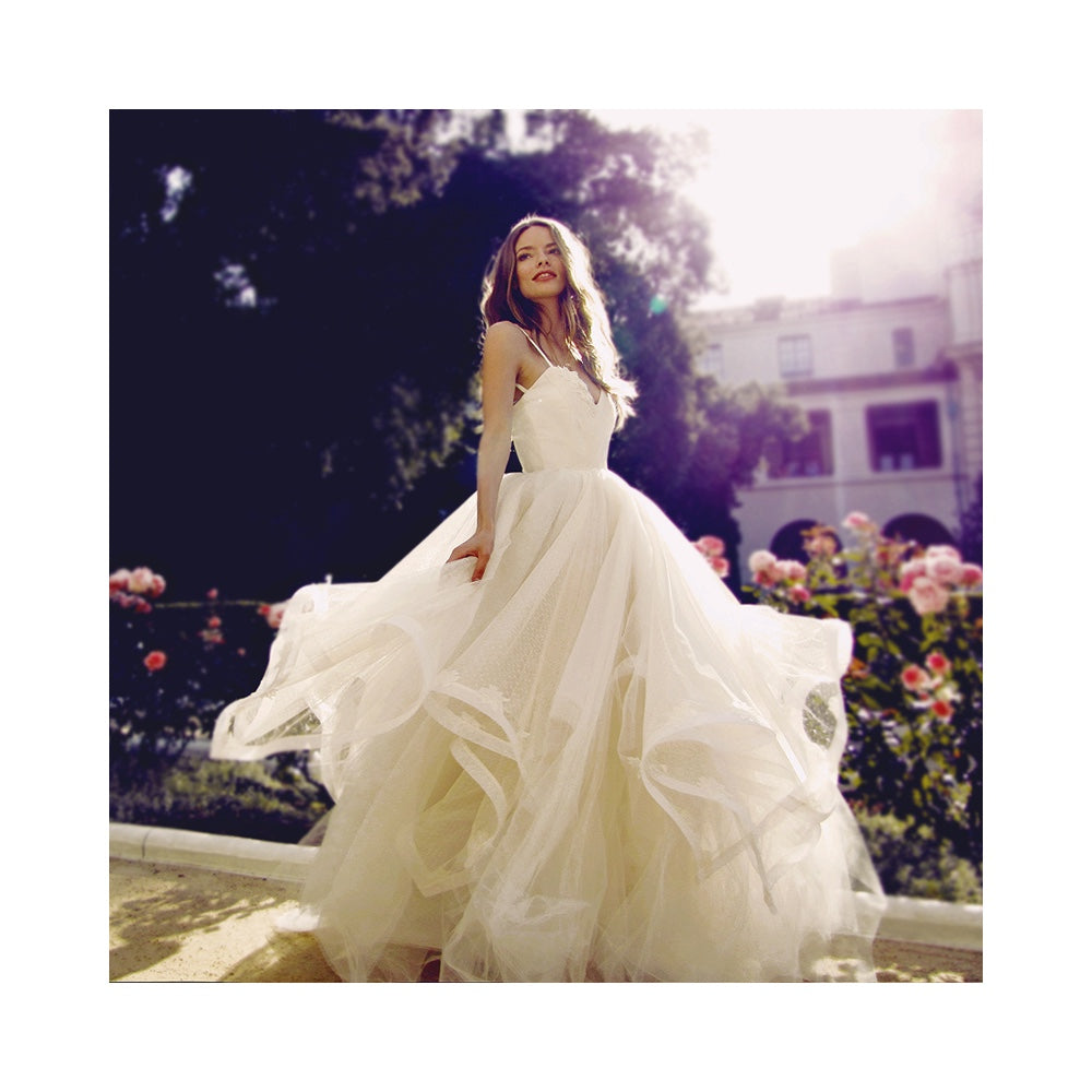 Decadently layered, natural waist ball gown silhouette of feathered tulle and Point D'Esprit horsehair tulle petals over a satin sweetheart bodice with ruched Point D'Esprit and lace floral appliqué detailing. Low back with invisible zipper. Fully lined. Bodice features full boning for support and structure. View a size chart.
