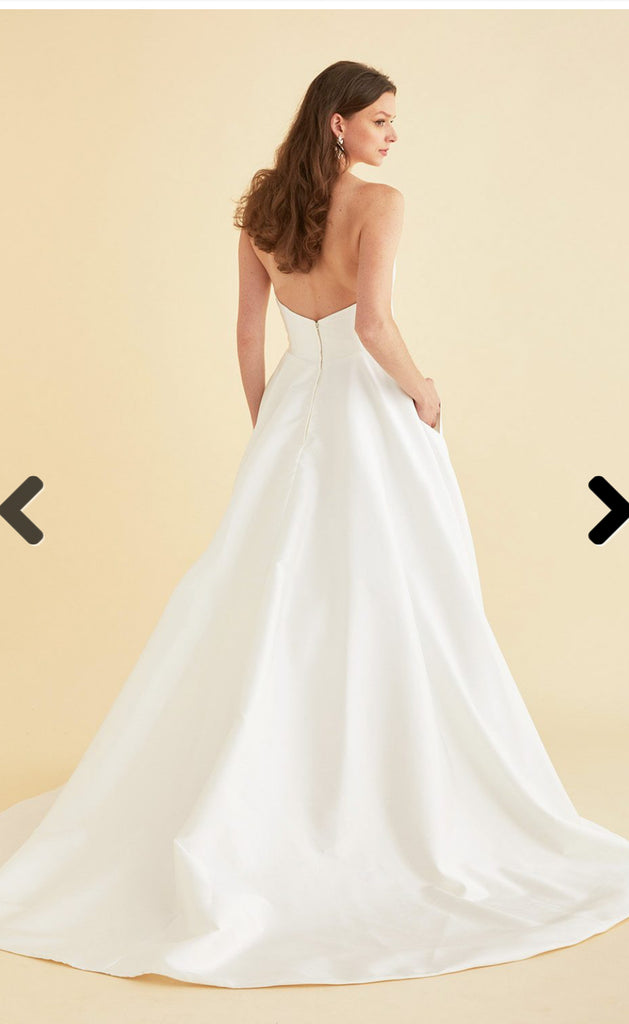 The straight neckline frames your décolletage beautifully, while the backless design adds a daring twist that ensures all eyes are on you. The strapless style highlights your shoulders and arms, providing an elegant canvas for a statement necklace or delicate earrings. With pockets cleverly integrated into the skirt, this dress offers practicality without sacrificing aesthetic; ideal for holding those treasured vows or a quick touch-up lip gloss for post-ceremony celebrations.