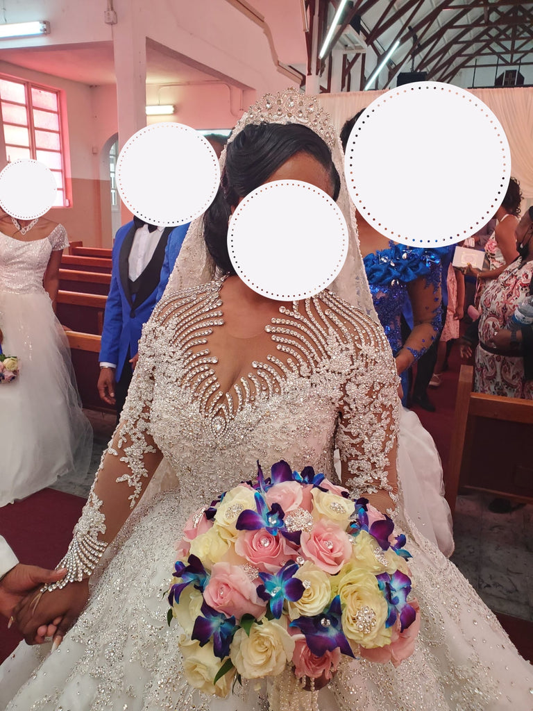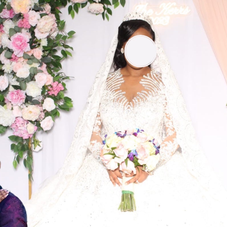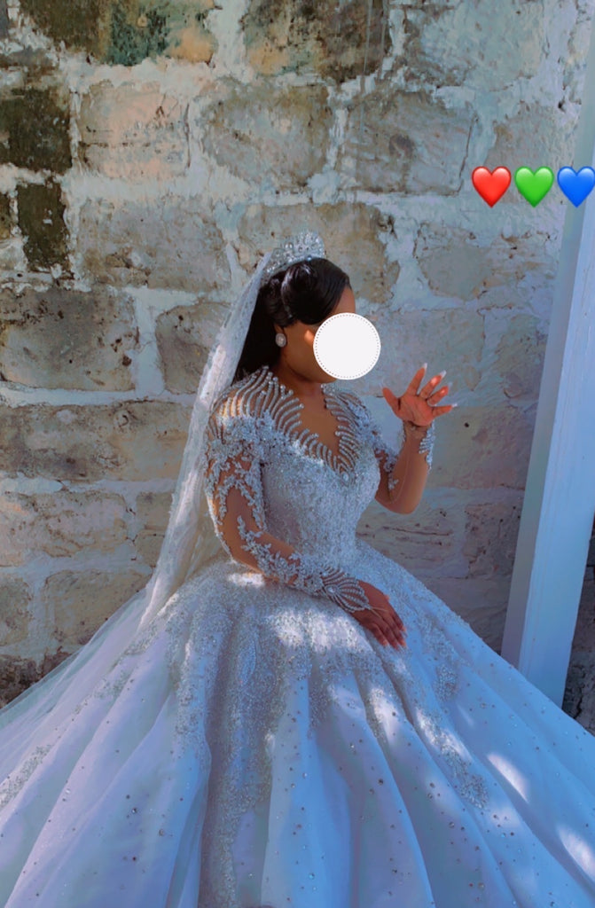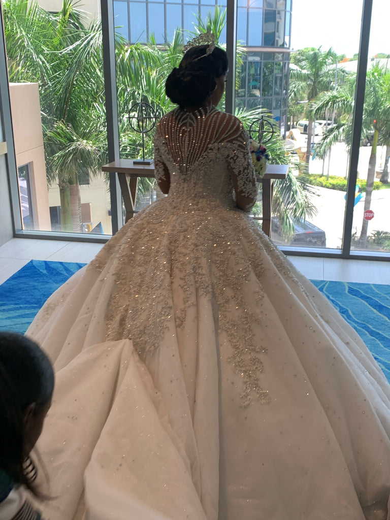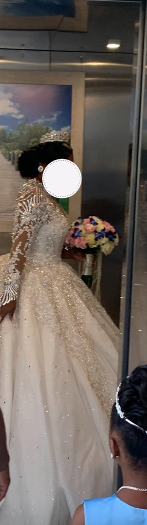 This stunning ball gown has long sleeve with lace detailling and crystallized beading all over. It has a 3 meters long monarch train. It also includes a Cathedral veil made from lace.