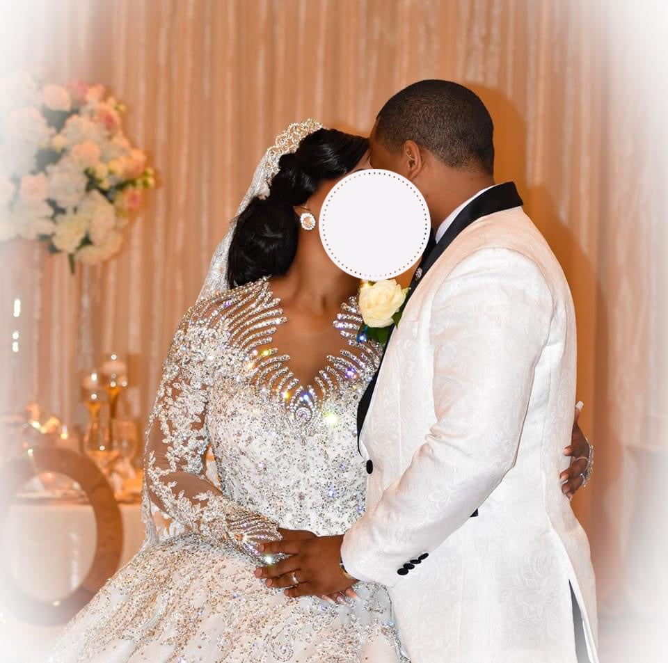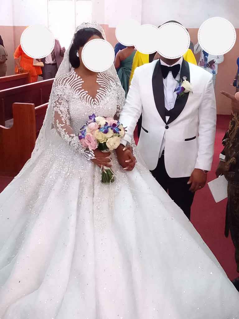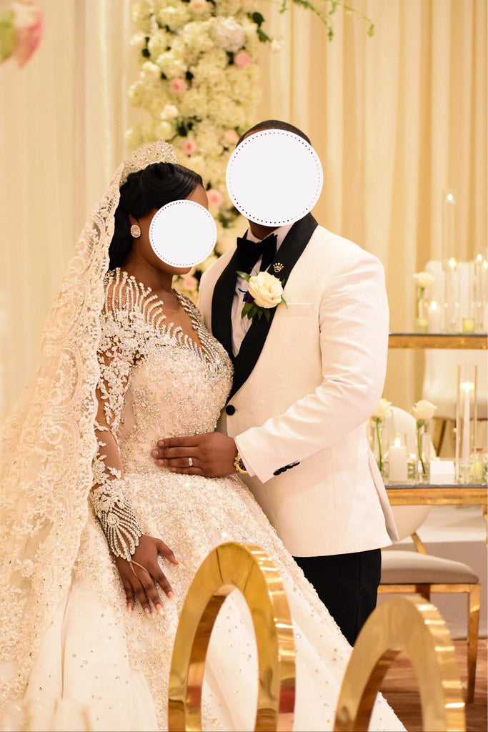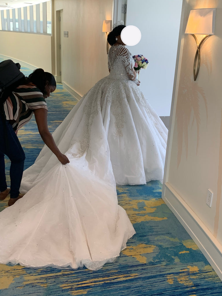 This stunning ball gown has long sleeve with lace detailling and crystallized beading all over. It has a 3 meters long monarch train. It also includes a Cathedral veil made from lace.