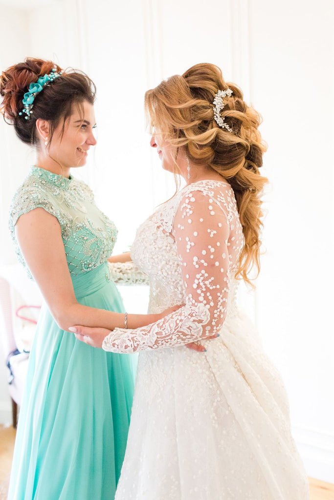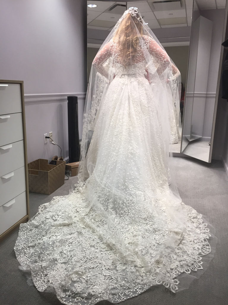 Maison Signore designed elegant, sophisticated, romantic, timeless - a fairytale masterpiece, that will make you feel like a real princess. The dress was purchased at Kleinfeld's Bridal in New York City and then exclusively handmade, with love in Italy, lavishly embellished to highlight the silhouette and grace of the bride. Striking details are designed to elevate the gowns to the status of fine jewelry. The dress has a detachable sleeved top piece, giving an illusion of having two distinct gowns. The top piece is made with natural silk, lace, and Italian polka-dot embroidery, essentially highlighting the elegance and purity of the bride! If desired, the top piece can be taken off at any time, leaving the bride in a lavishly embellished with pearls, rhinestones, and Swarovski crystals sweetheart neckline corset, designed to highlight the silhouette and timeless grace of the bride!