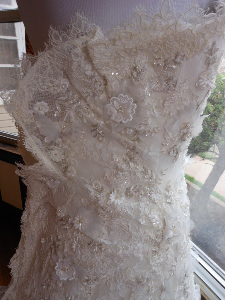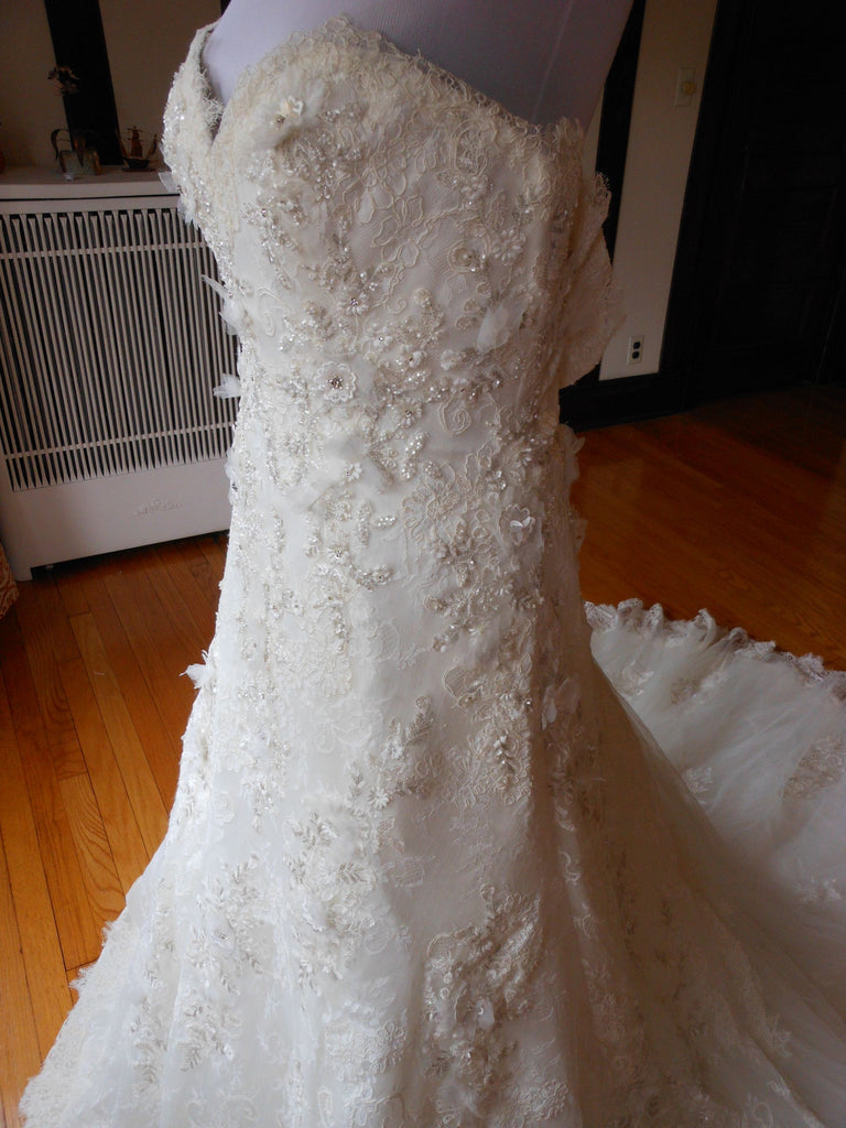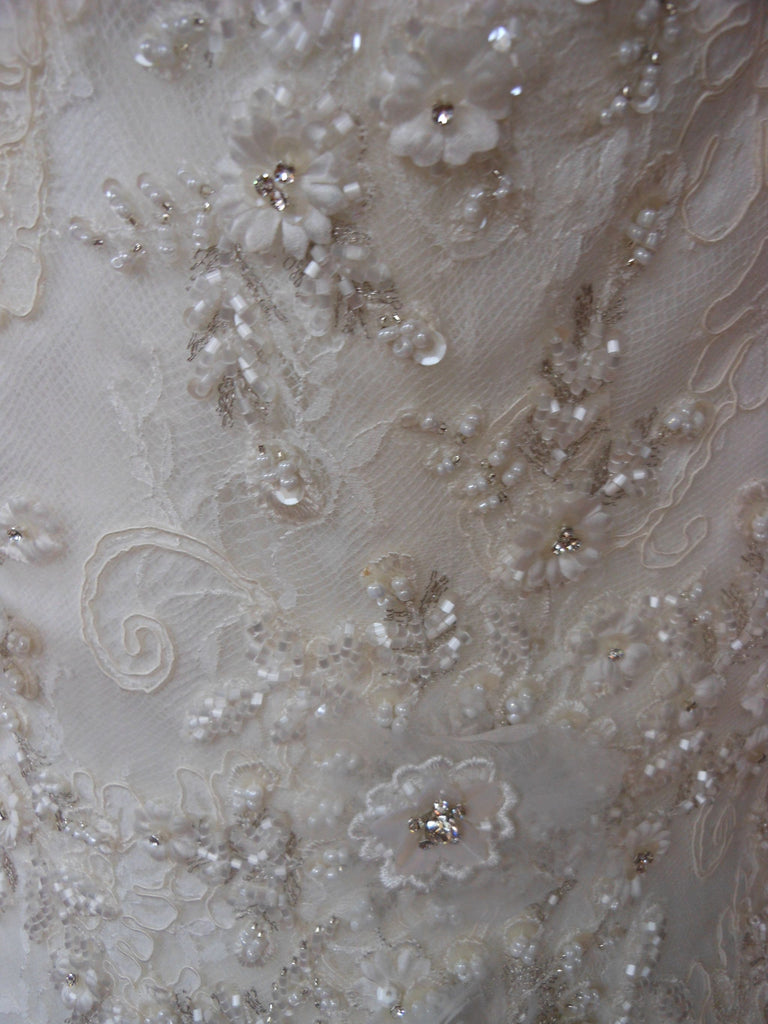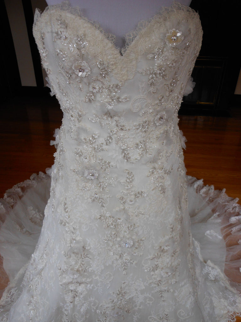 This is an Authentic MARIA KARIN Bridal Wedding Dress Gown. The style number of the dress is MK201501. It has a gorgeous A line style with a fabulous long train. The entire gown is embellished with exquisite floral lace, beautiful 3D flowers, stunning crystals and sparkling beads/sequences on top of the lace. The bodice also has boning to build a perfect shape. The skirt has netting petticoat inside to support a full shape. This dress is brand new in great condition with the original label. It was never worn.