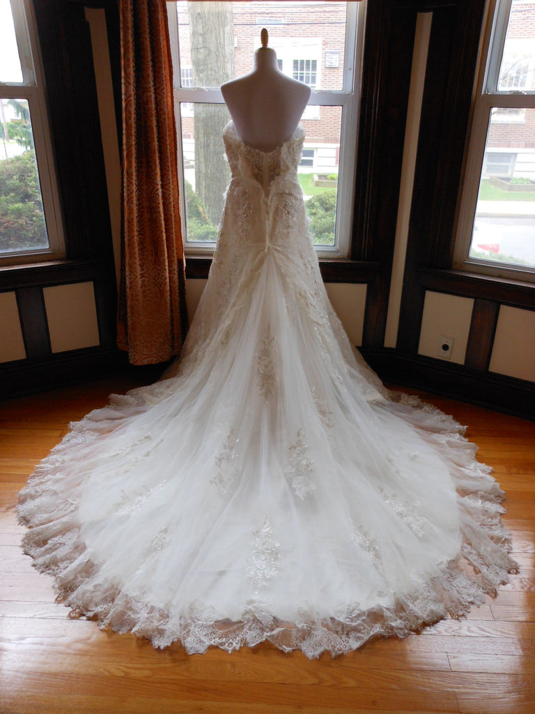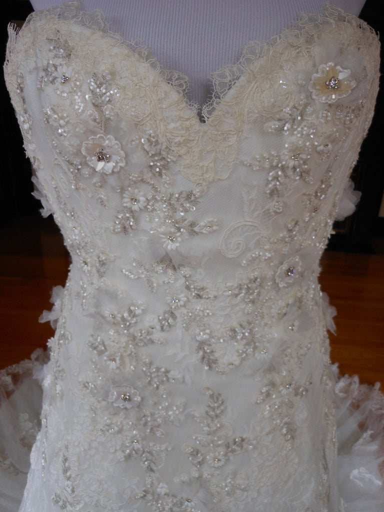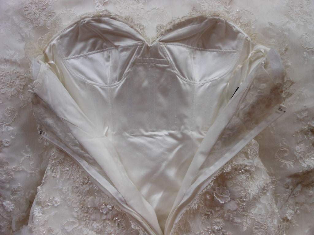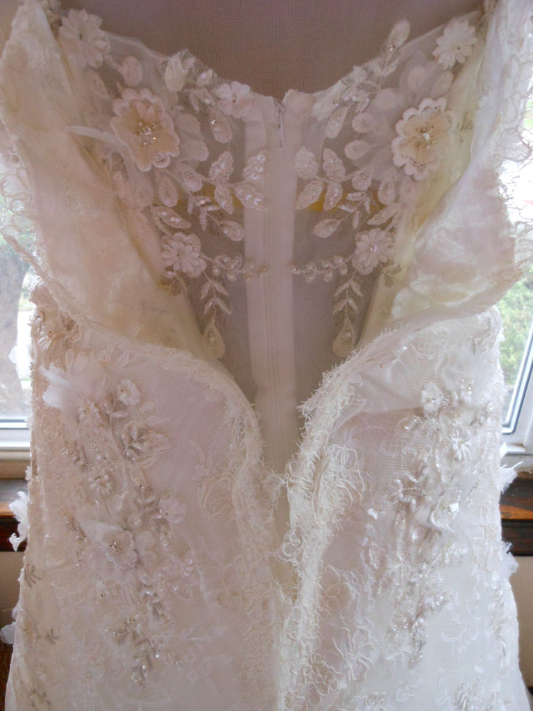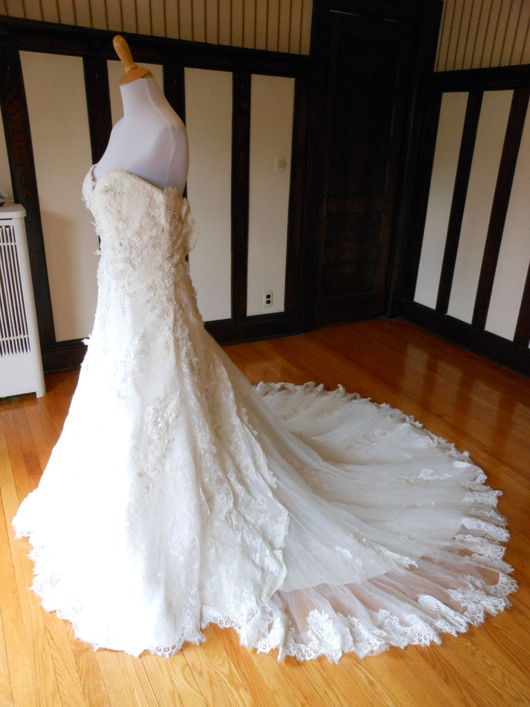 This is an Authentic MARIA KARIN Bridal Wedding Dress Gown. The style number of the dress is MK201501. It has a gorgeous A line style with a fabulous long train. The entire gown is embellished with exquisite floral lace, beautiful 3D flowers, stunning crystals and sparkling beads/sequences on top of the lace. The bodice also has boning to build a perfect shape. The skirt has netting petticoat inside to support a full shape. This dress is brand new in great condition with the original label. It was never worn.