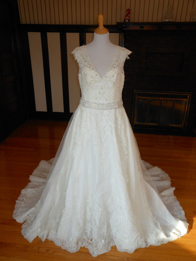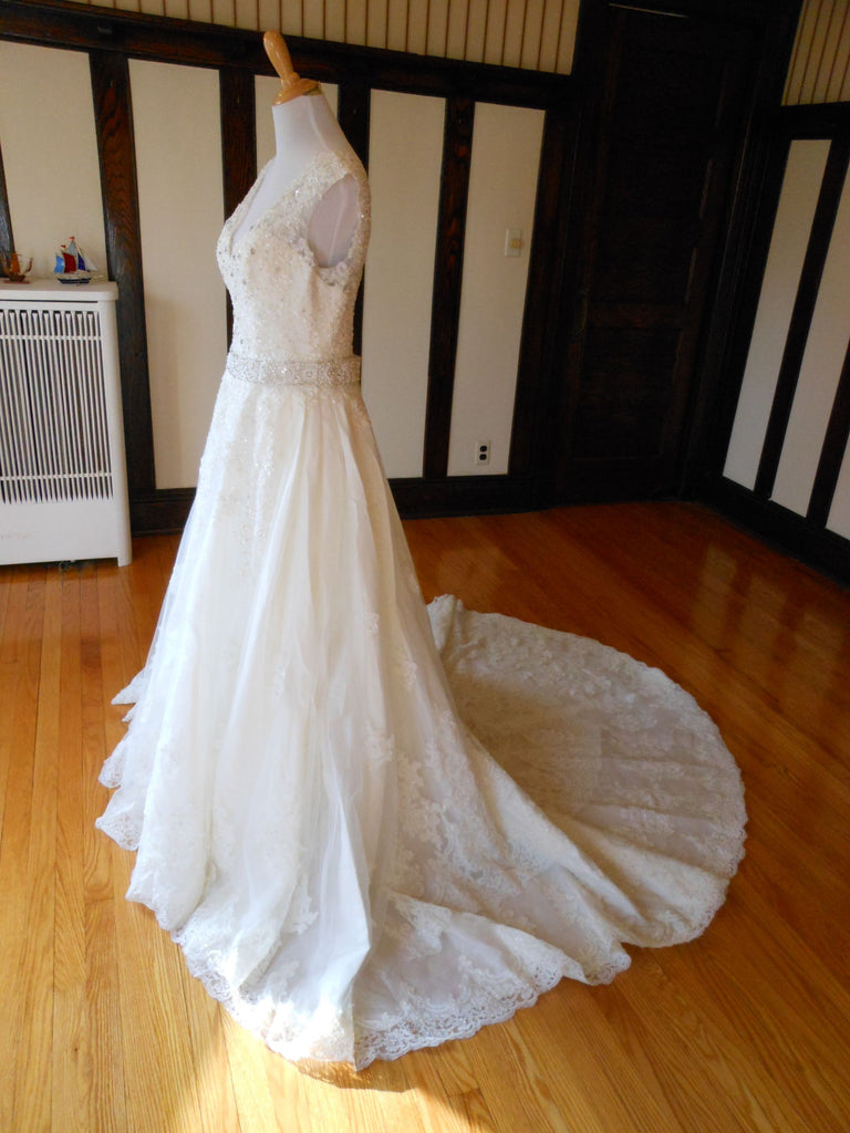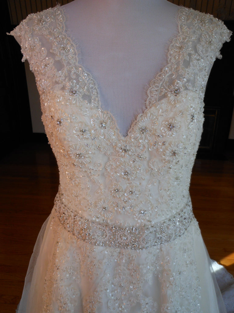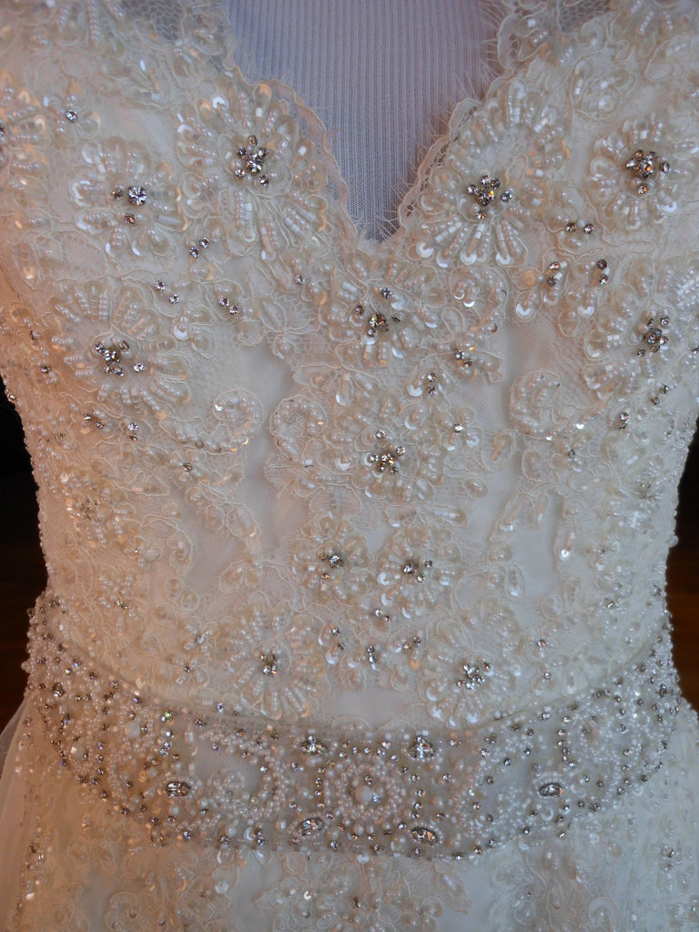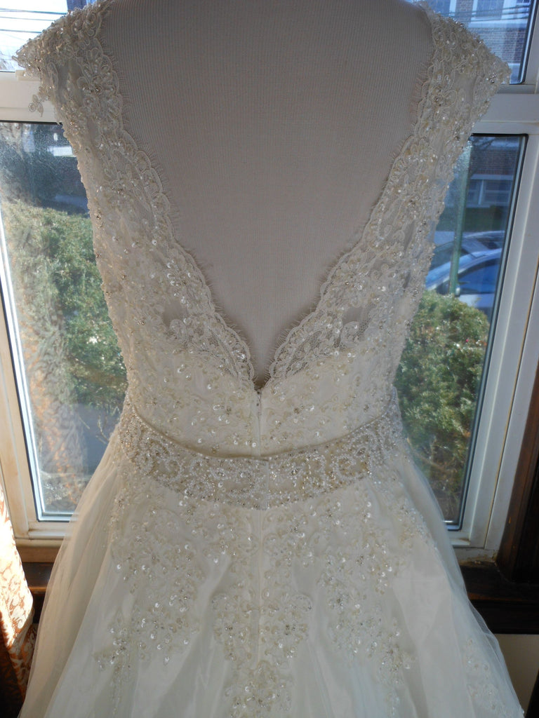 This is an Authentic MARIA KARIN Bridal Wedding Dress Gown. The style number of the dress is MK201503. It has a gorgeous A line style with a fabulous long train. The entire gown is embellished with exquisite floral lace, and stunning crystals and sparkling beads/sequences on top of the lace. The bodice also has boning to build a perfect shape. The skirt has netting petticoat inside to support a full shape. It comes with a fully beaded belt which is detachable. This dress is brand new in great condition. It was never worn.