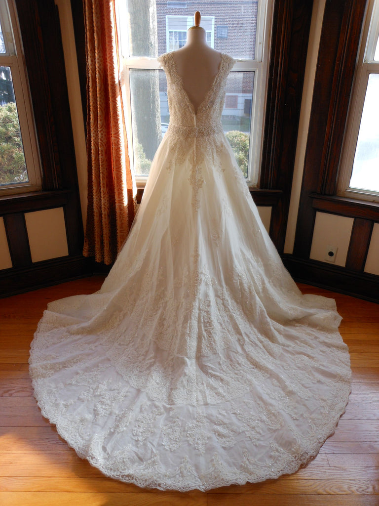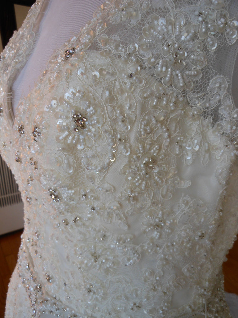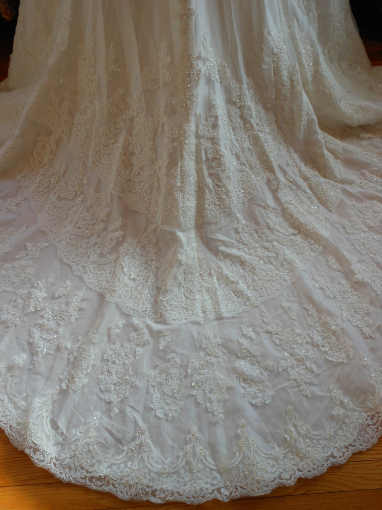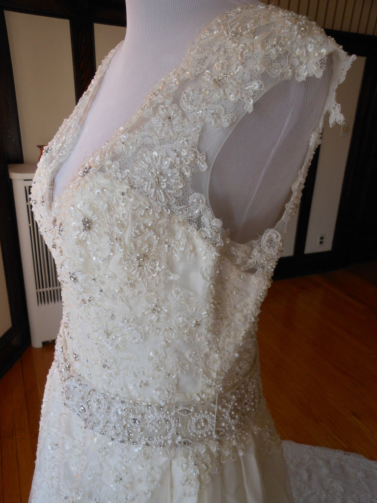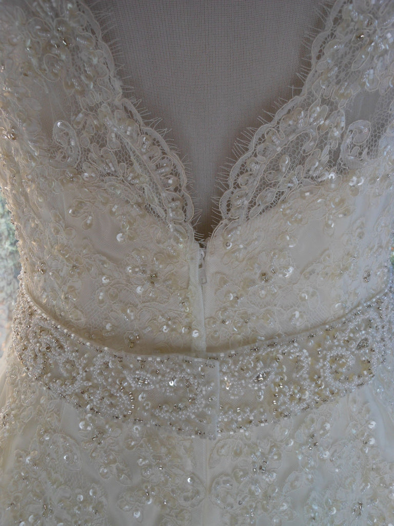 This is an Authentic MARIA KARIN Bridal Wedding Dress Gown. The style number of the dress is MK201503. It has a gorgeous A line style with a fabulous long train. The entire gown is embellished with exquisite floral lace, and stunning crystals and sparkling beads/sequences on top of the lace. The bodice also has boning to build a perfect shape. The skirt has netting petticoat inside to support a full shape. It comes with a fully beaded belt which is detachable. This dress is brand new in great condition. It was never worn.
