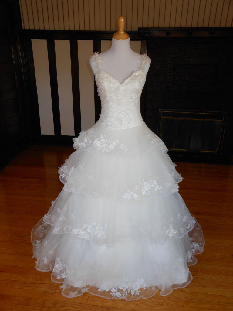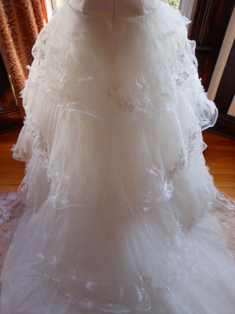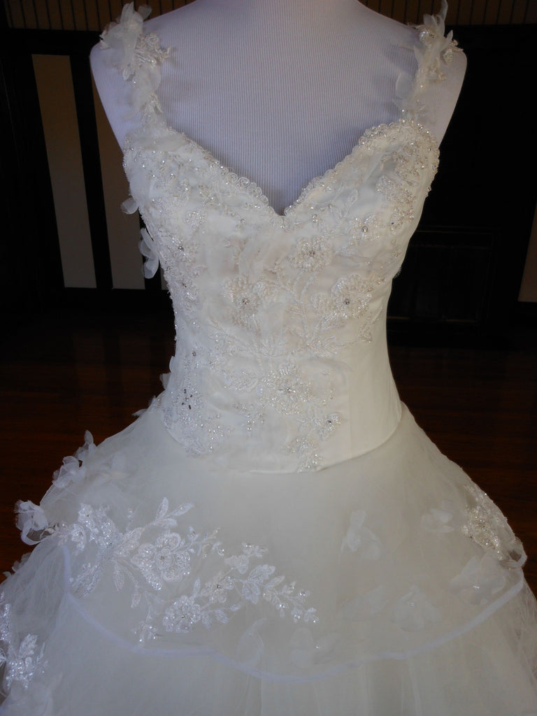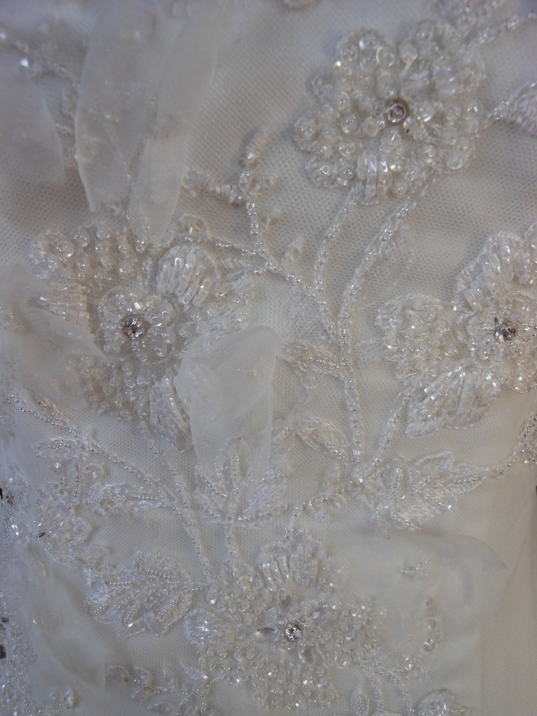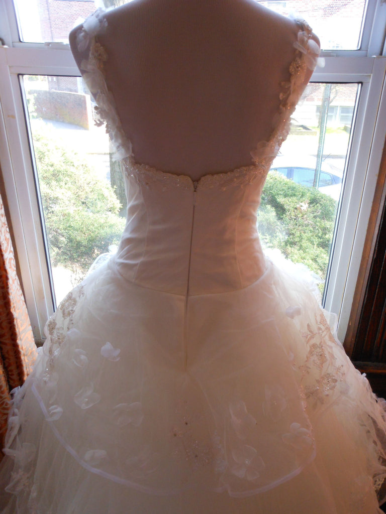 This is an Authentic MARIA KARIN Bridal Wedding Dress Gown. It has a gorgeous ball gown style with a fabulous long train. The gown is embellished with exquisite floral lace, beautiful 3D flowers, stunning crystals and sparkling beads/sequences on top of the lace. The bodice also has boning to build a perfect shape. The skirt has netting petticoat inside to support a very full shape. This dress is brand new in great condition with the original label. It was never worn.