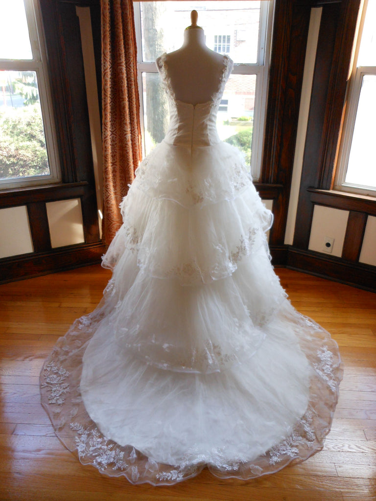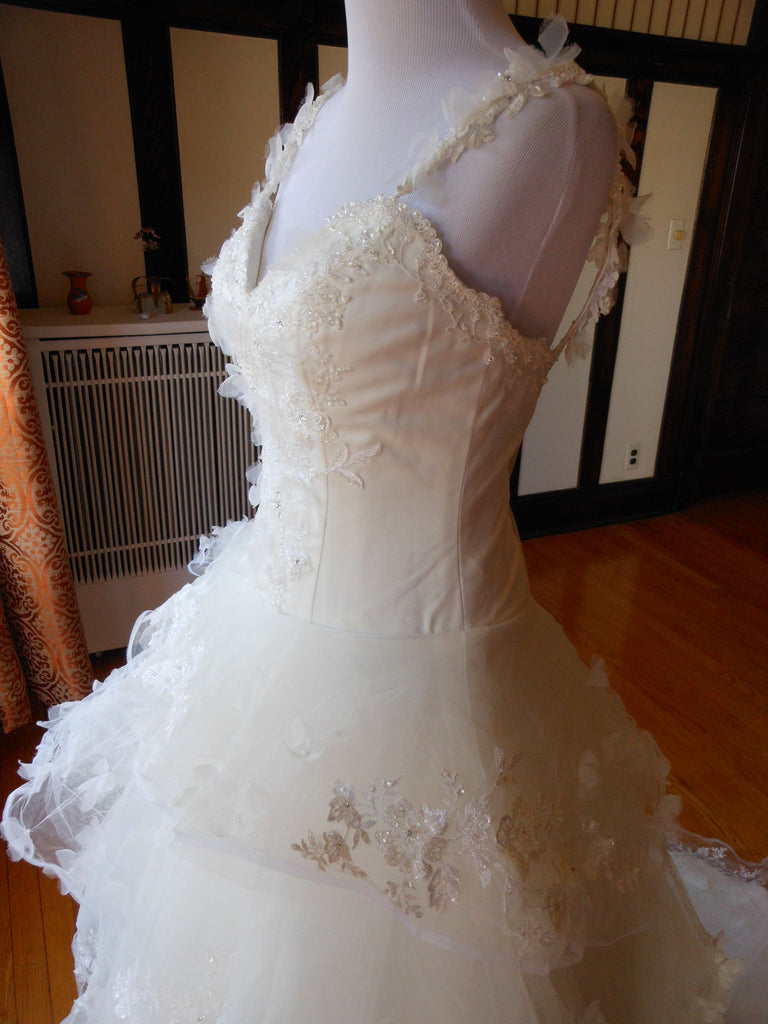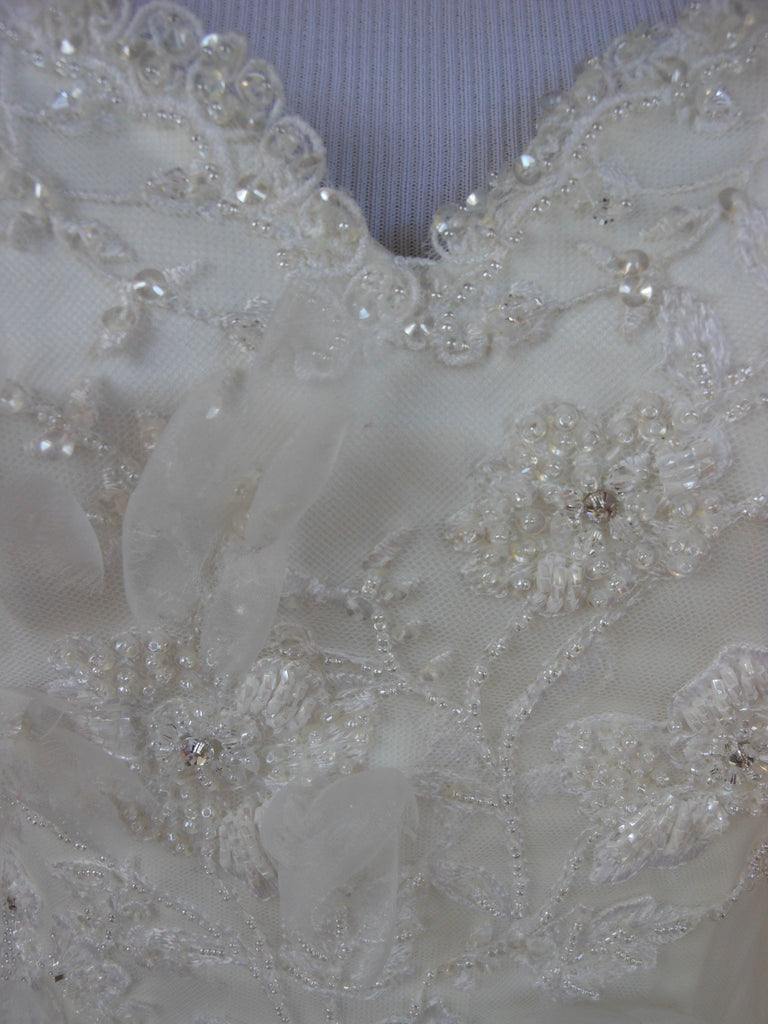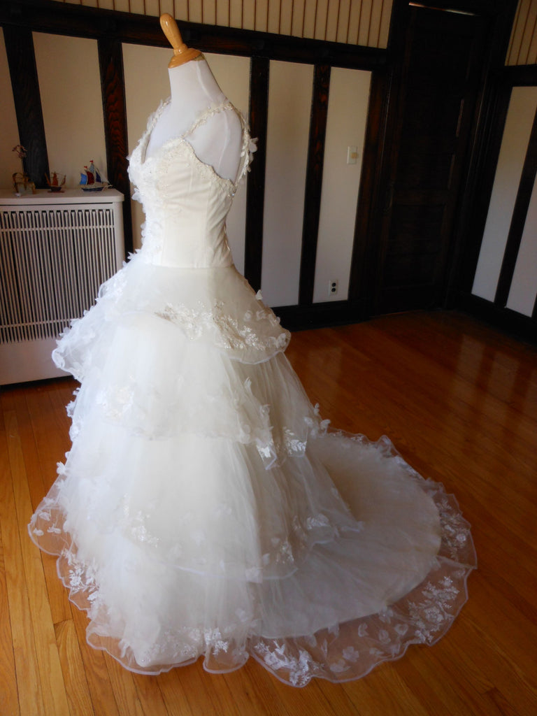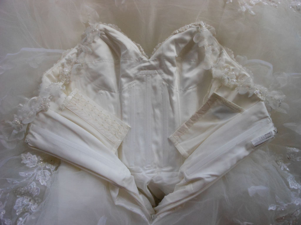 This is an Authentic MARIA KARIN Bridal Wedding Dress Gown. It has a gorgeous ball gown style with a fabulous long train. The gown is embellished with exquisite floral lace, beautiful 3D flowers, stunning crystals and sparkling beads/sequences on top of the lace. The bodice also has boning to build a perfect shape. The skirt has netting petticoat inside to support a very full shape. This dress is brand new in great condition with the original label. It was never worn.