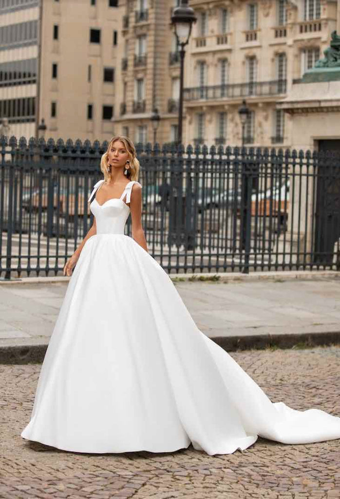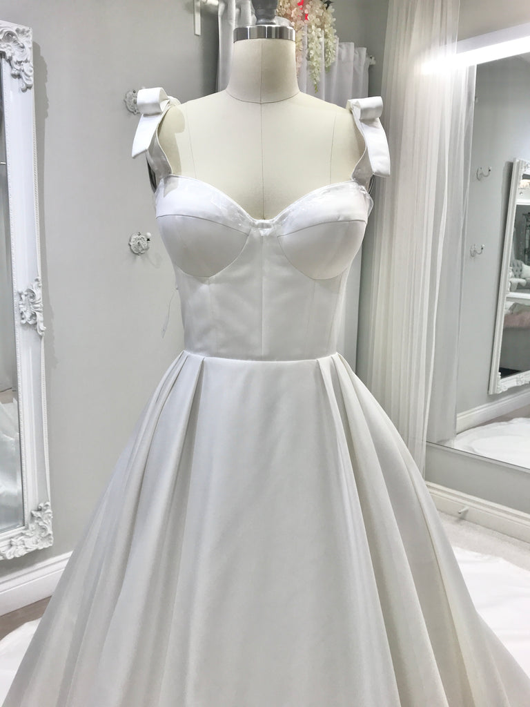 Make a timeless entrance in this stunning satin ballgown, featuring a romantic sweetheart neckline, delicate shoulder straps adorned with feminine bows, and an intricately designed lace-up corset back. The structured bodice flatters the waist and bust, offering an adjustable fit that ensures both comfort and elegance.