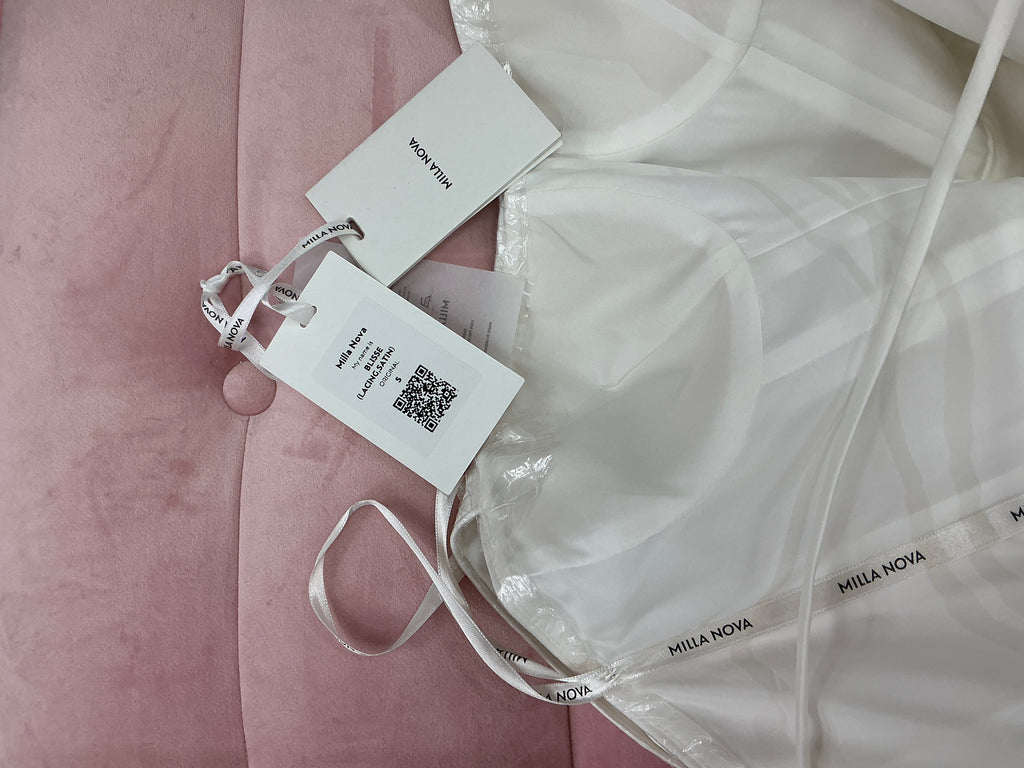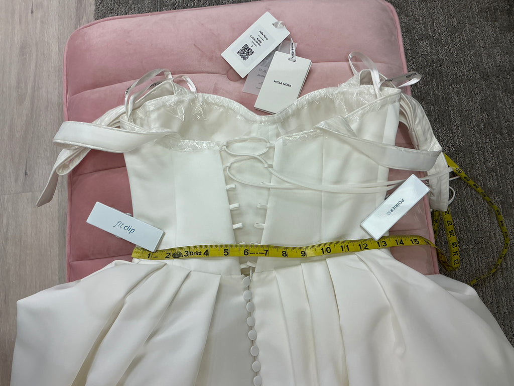 This gown is a new boutique sample in impeccable condition. It retains all original tags and protective coverings on the neckline and skirt hem. It has only been gently tried on in our boutique under supervised conditions. To maintain its pristine quality, all fittings are done with nylon foot covers and body slips to minimize contact with the fabric.