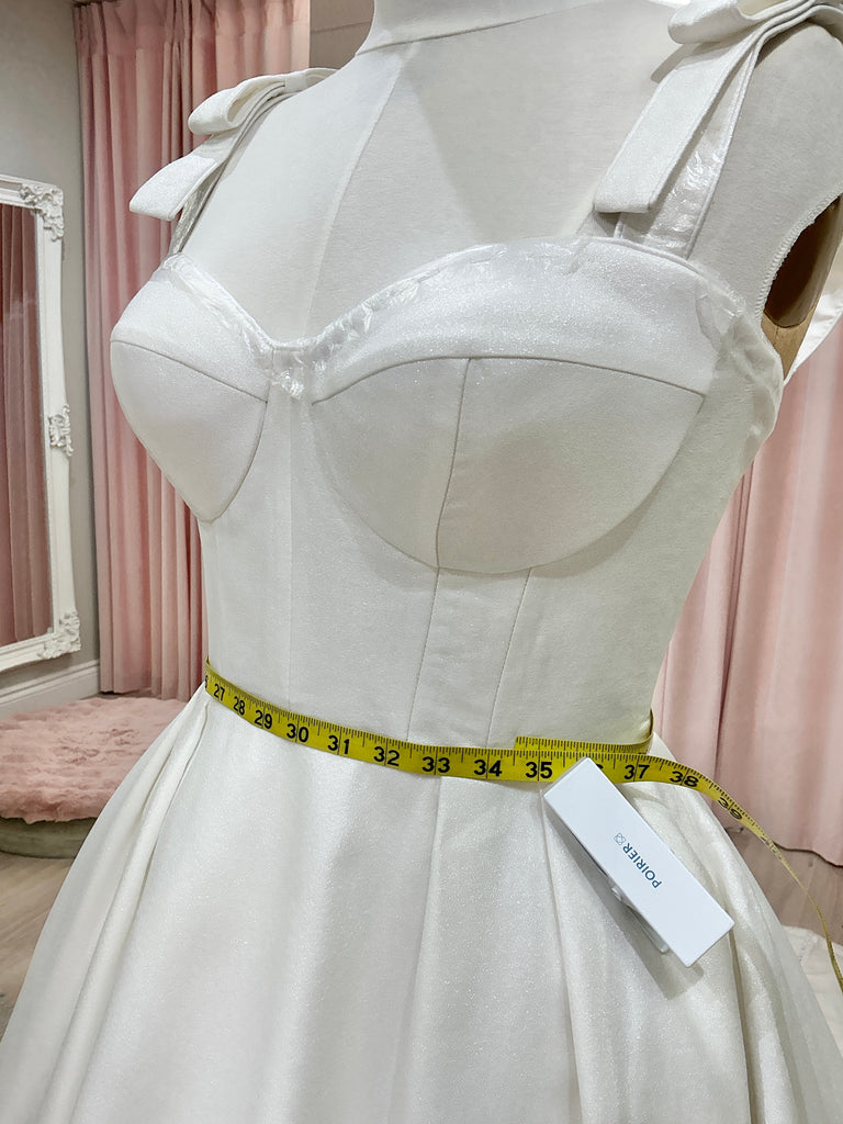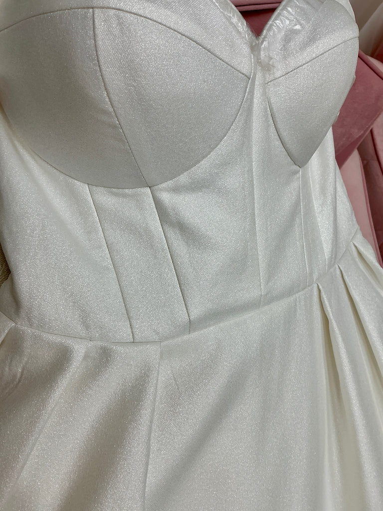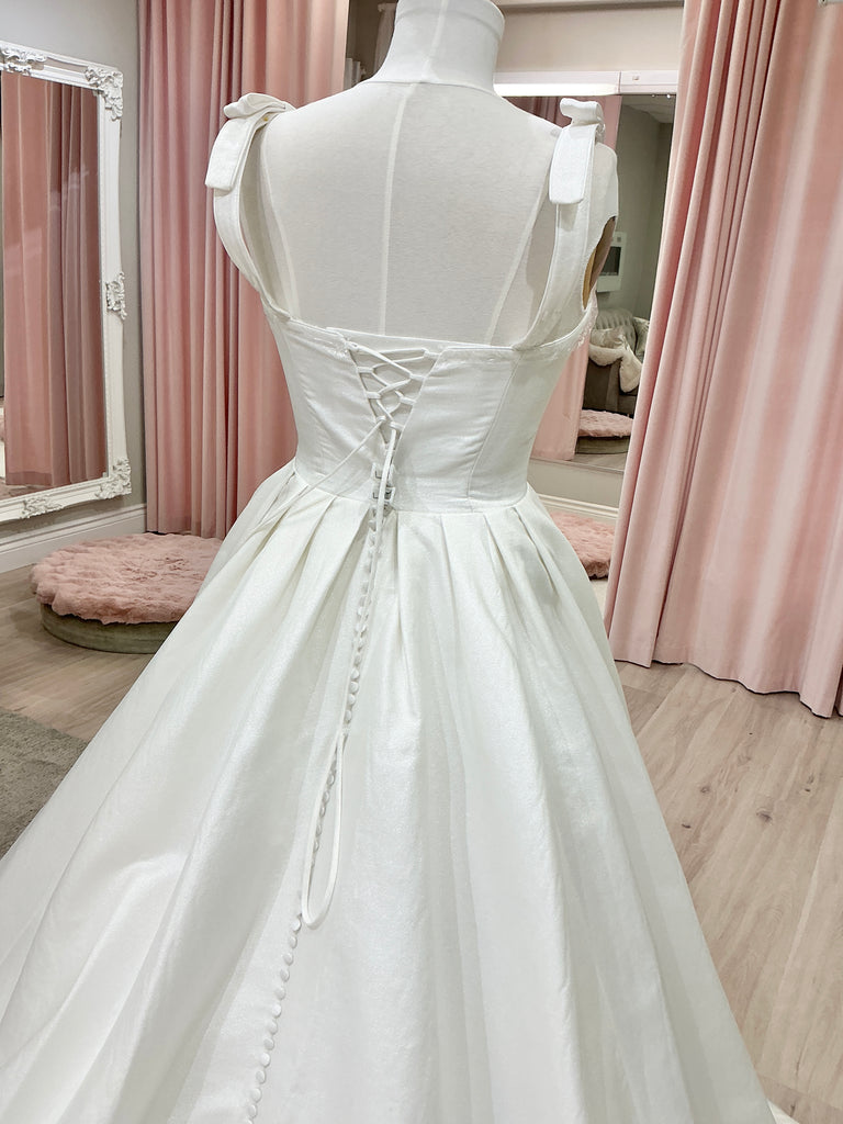 The luxurious satin fabric has a soft, delicate sparkle that catches the light beautifully, adding an understated glow to your bridal look. Thoughtful details include side pockets, covered buttons, a built-in crinoline, and a hidden back zipper beneath the corset.