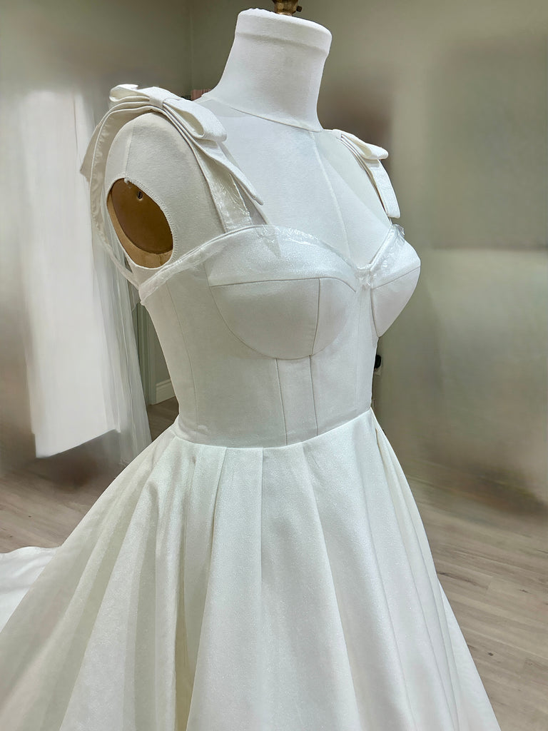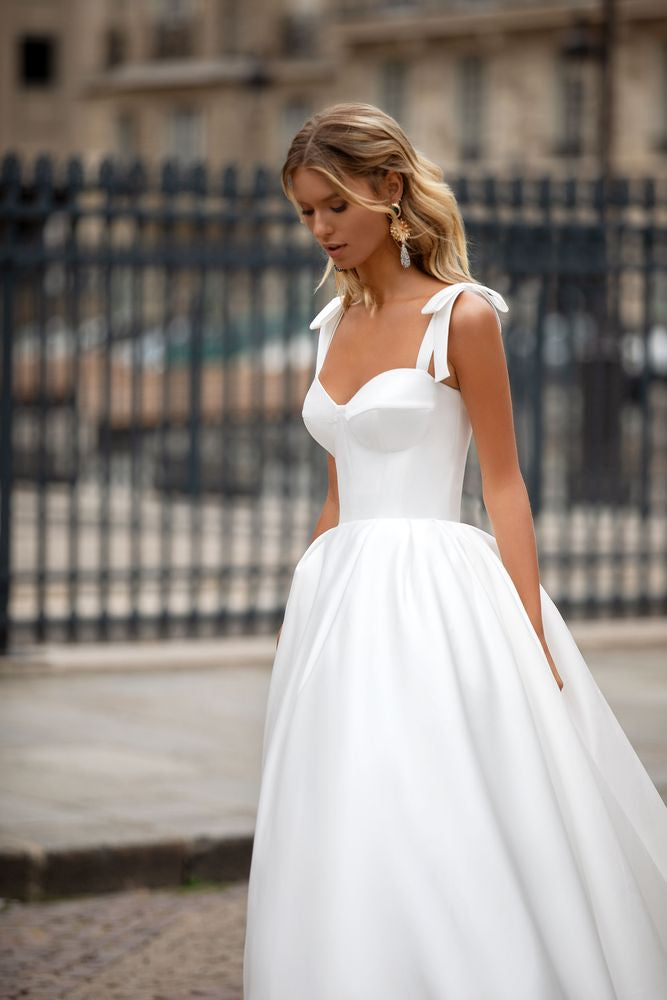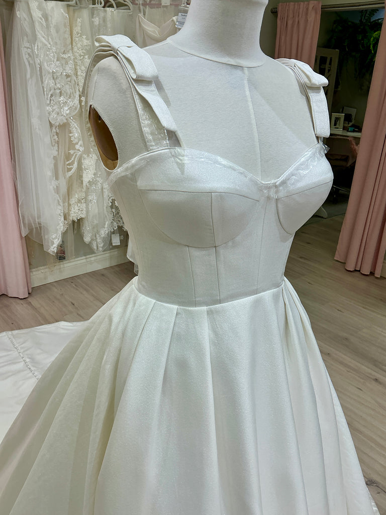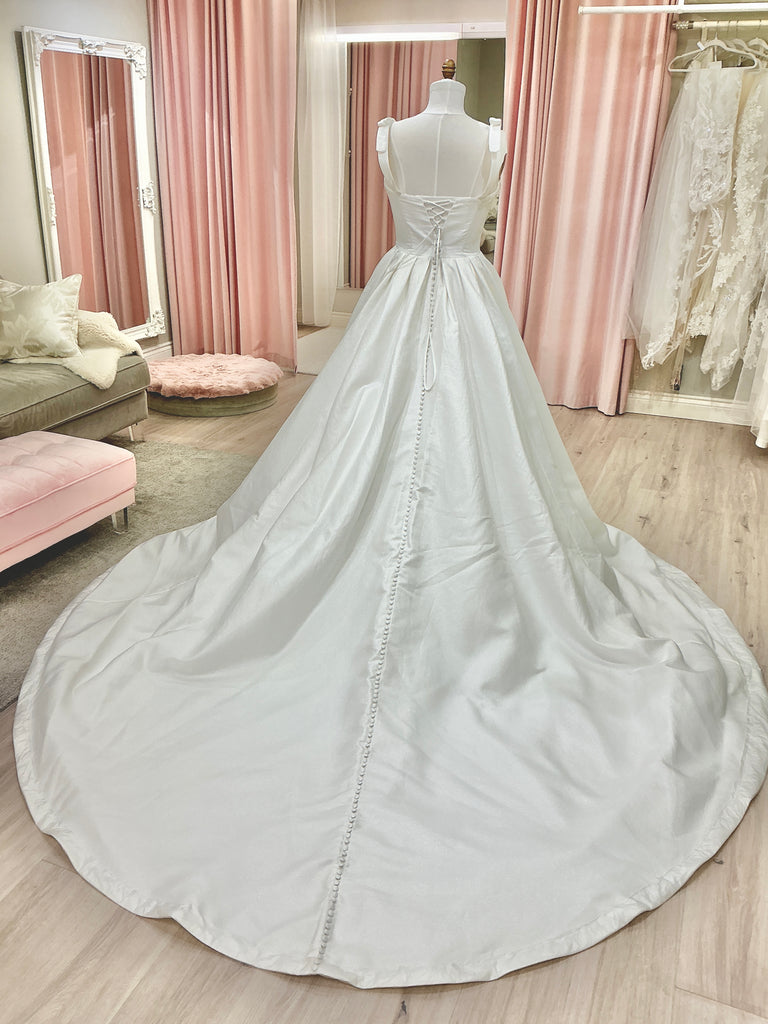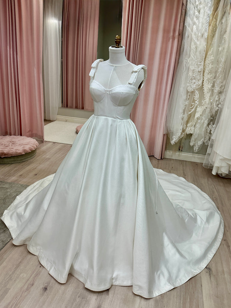 Make a timeless entrance in this classic satin ballgown, designed with a romantic sweetheart neckline, delicate bow-accented straps, and a flattering lace-up corset back. The structured bodice enhances the waist, while a full pleated skirt flows into a dramatic train—perfect for a regal walk down the aisle.