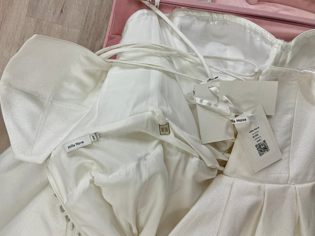 🕊️ Condition: This gown is a new boutique sample in impeccable condition. It retains all original tags and protective coverings on the neckline and skirt hem. It has only been gently tried on in our boutique under supervised conditions. To maintain its pristine quality, all fittings are done with nylon foot covers and body slips to minimize contact with the fabric.