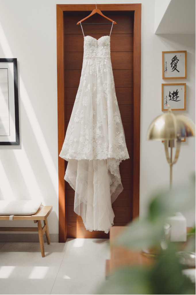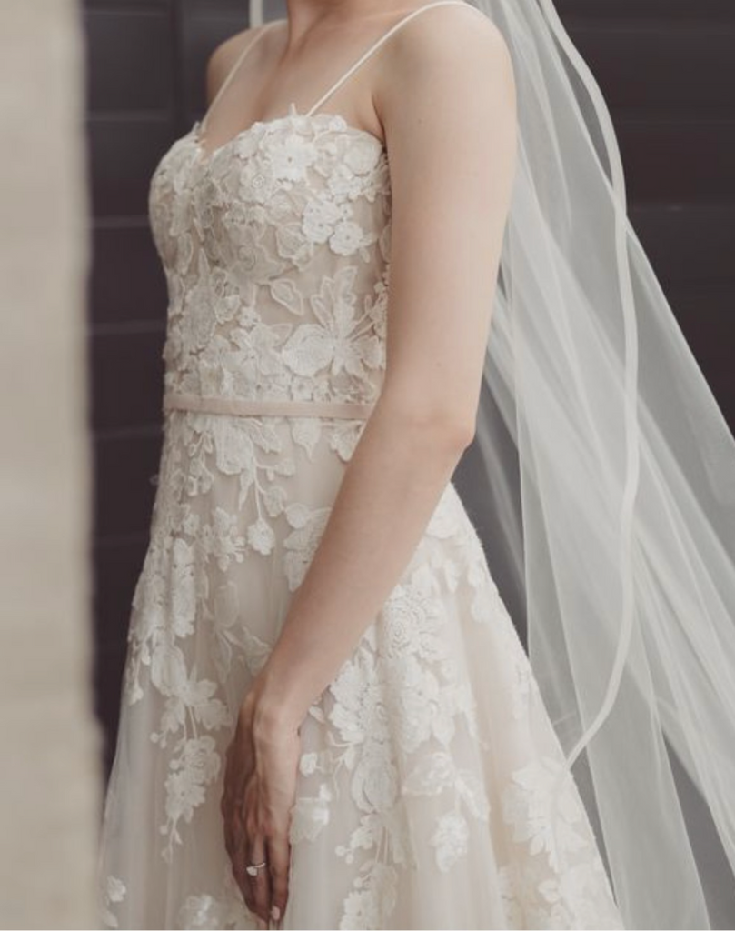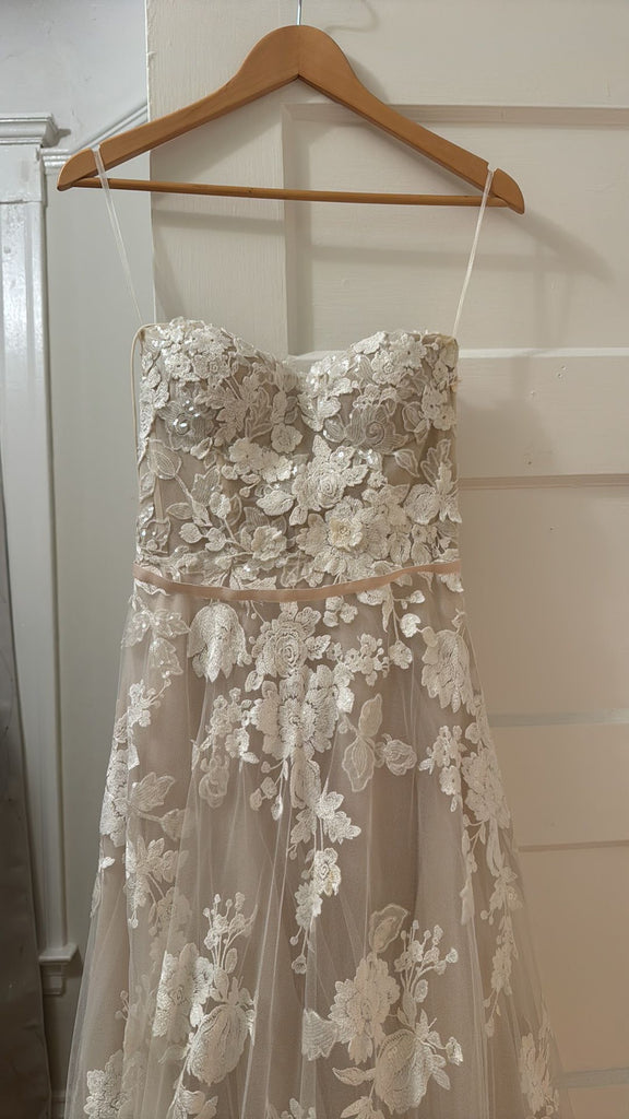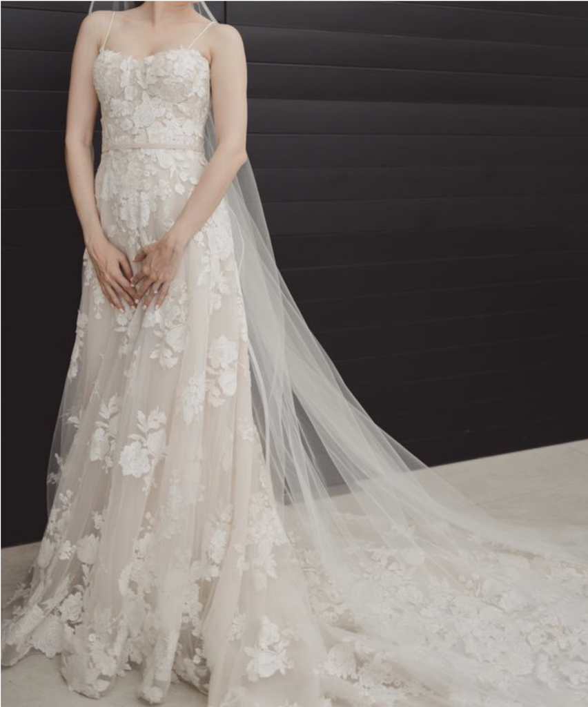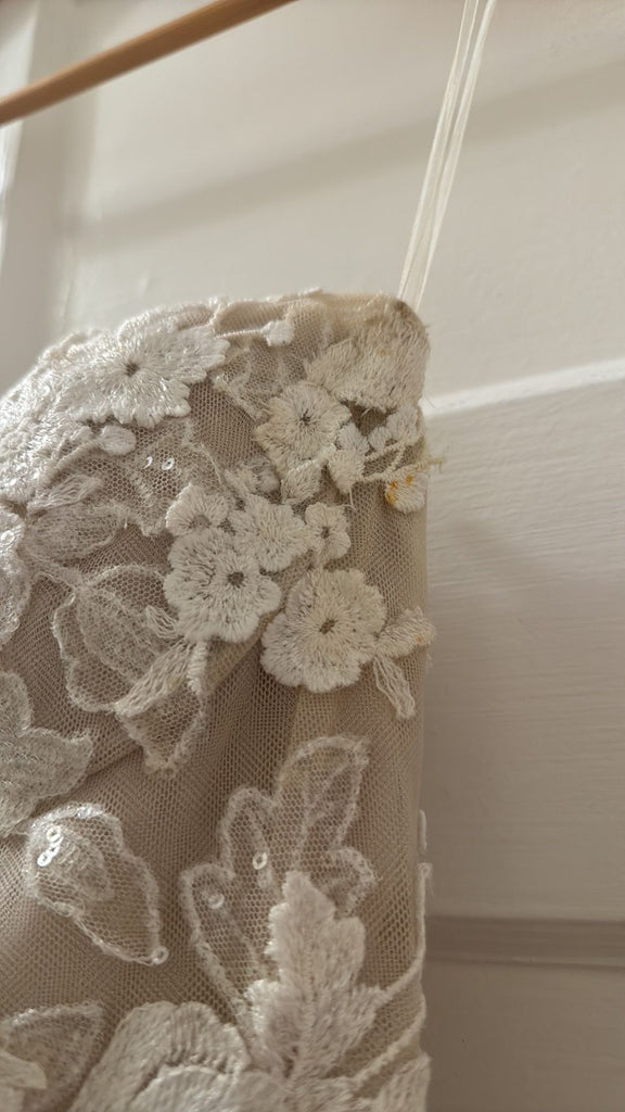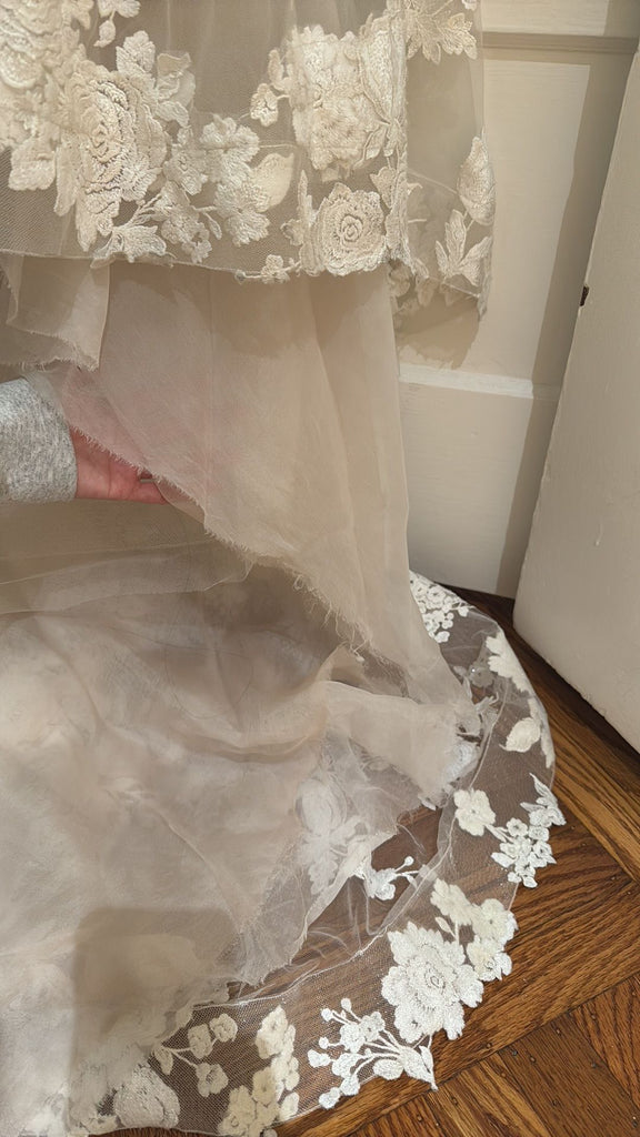Please note that because the dress was made to my measurements, it doesn't match the current tag sizing. If you live in the Bay Area, I can recommend you to the seamstress I worked with, she's experienced with Mira wedding dresses and luxury brands alterations.